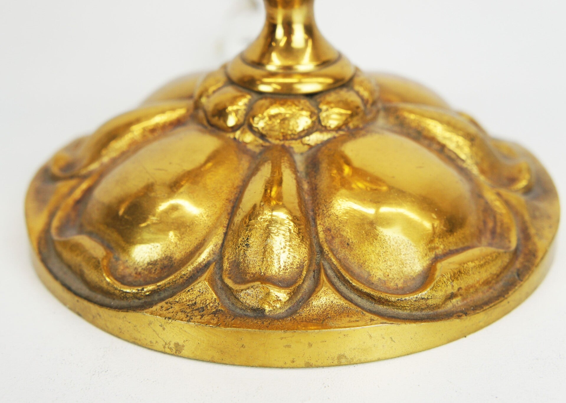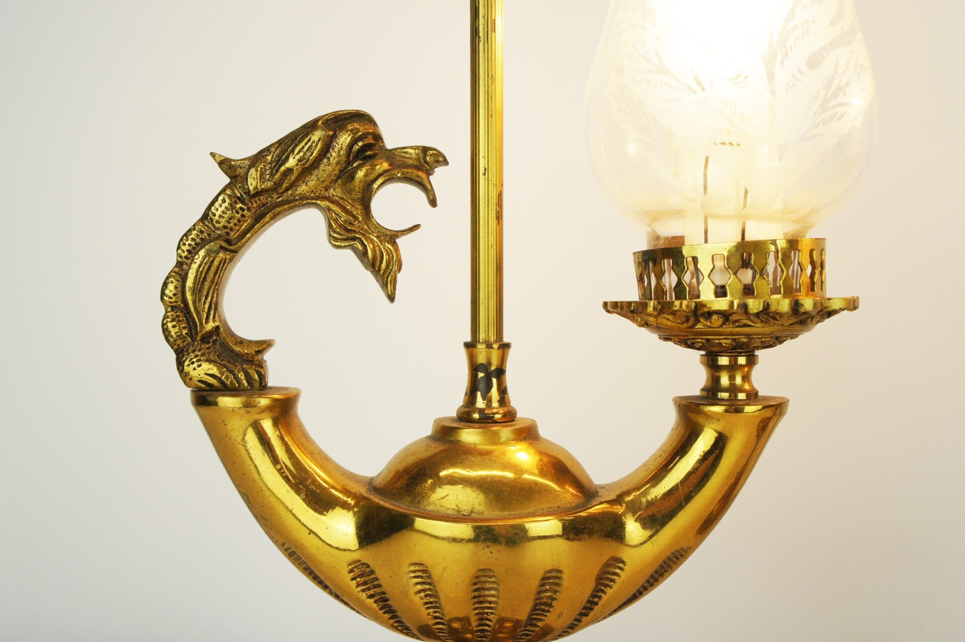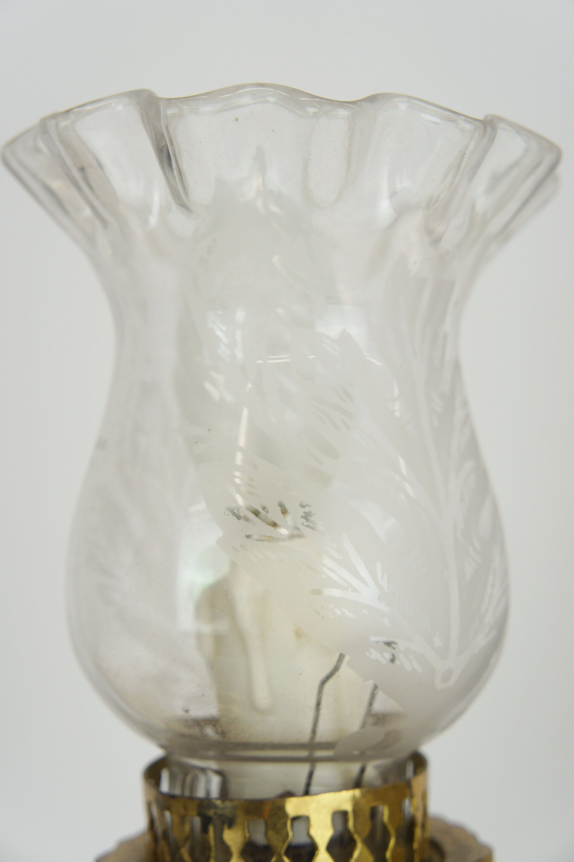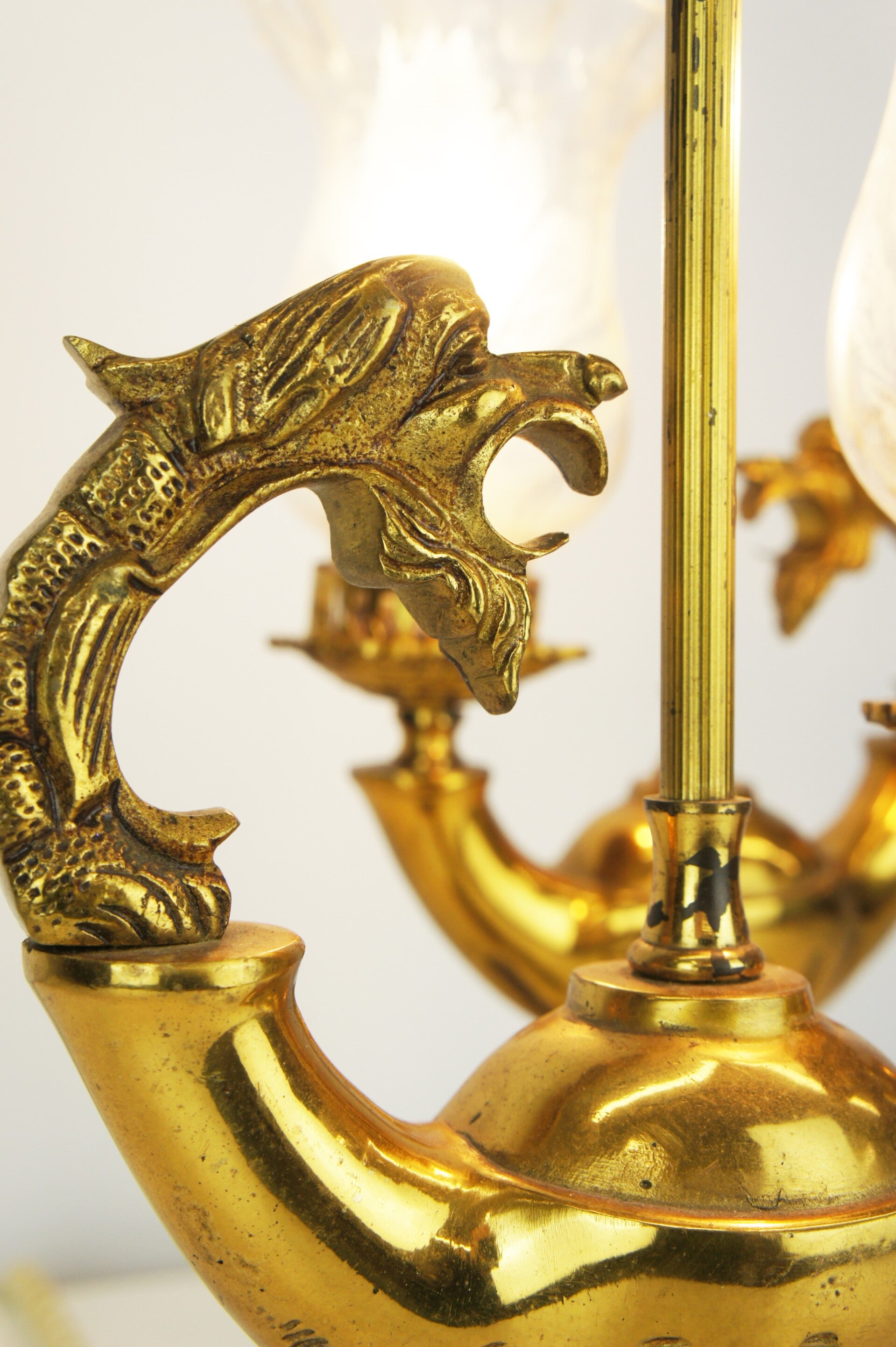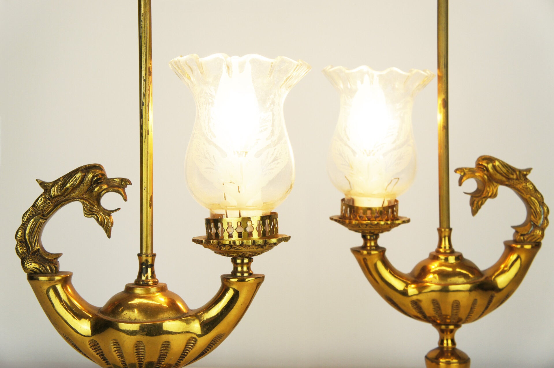 Beautiful pair of solid bronze genie table lamps from Spain, circa 1950 with glass shades in an etched floral decor.