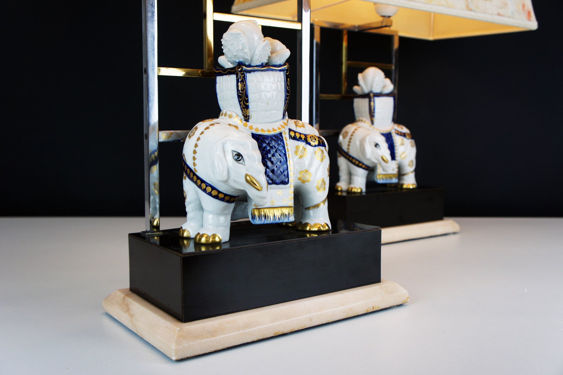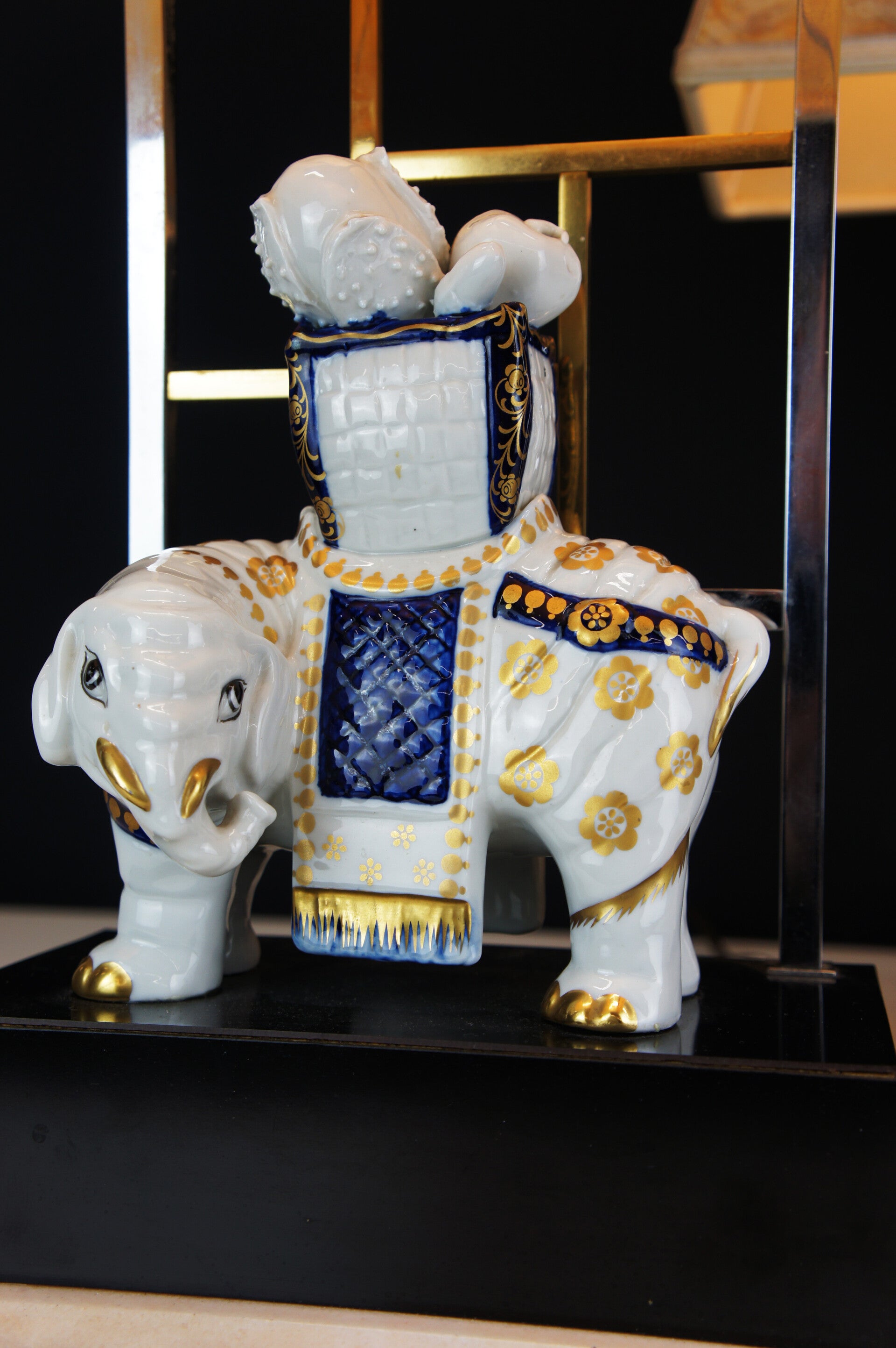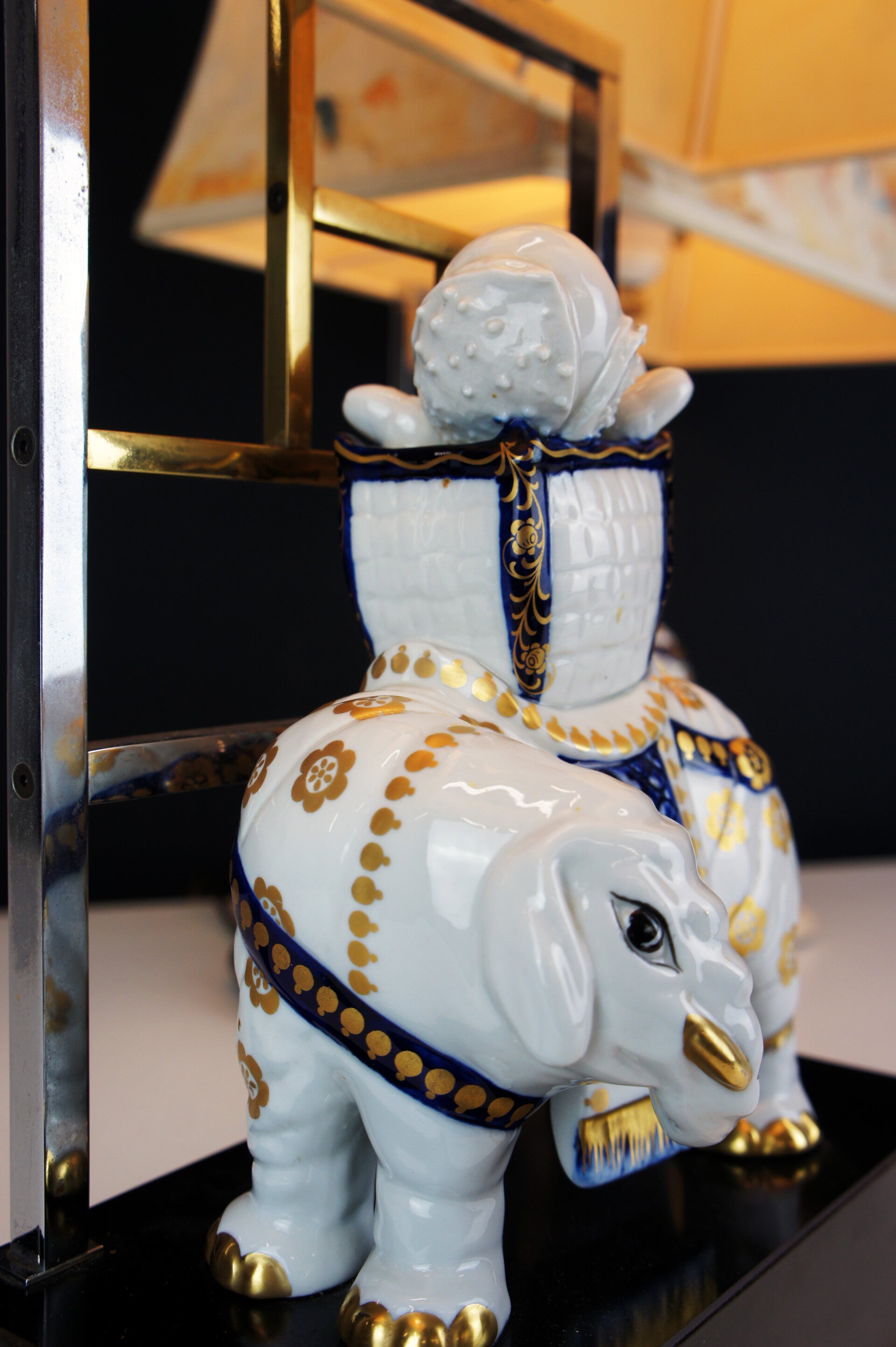 Pair of porcelain elephant table lamps by the Italian Giulia Mangani from the 70s painted in cobalt blue and gold details.