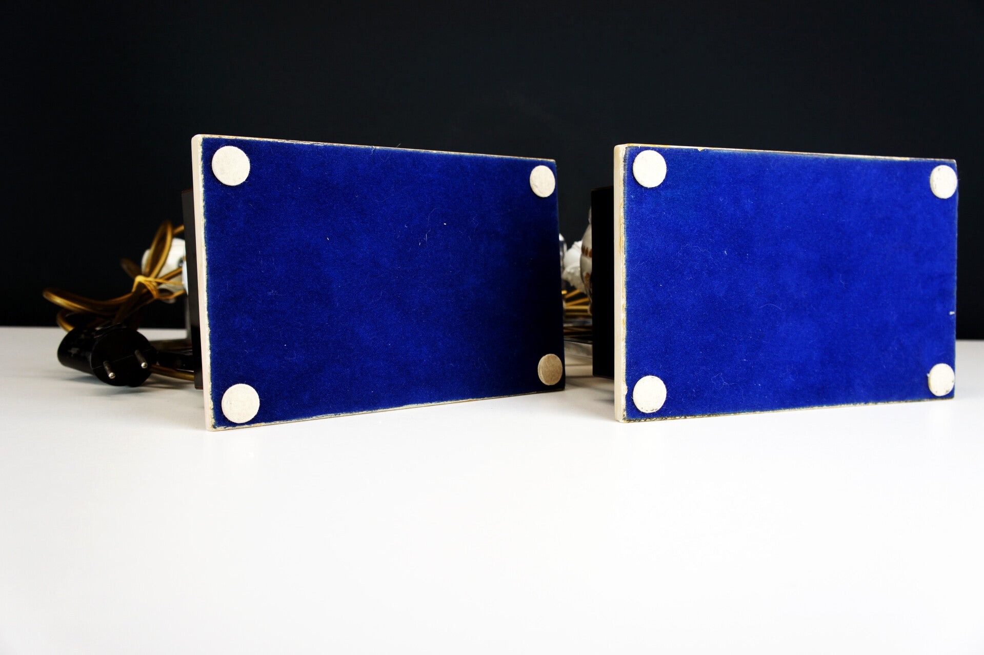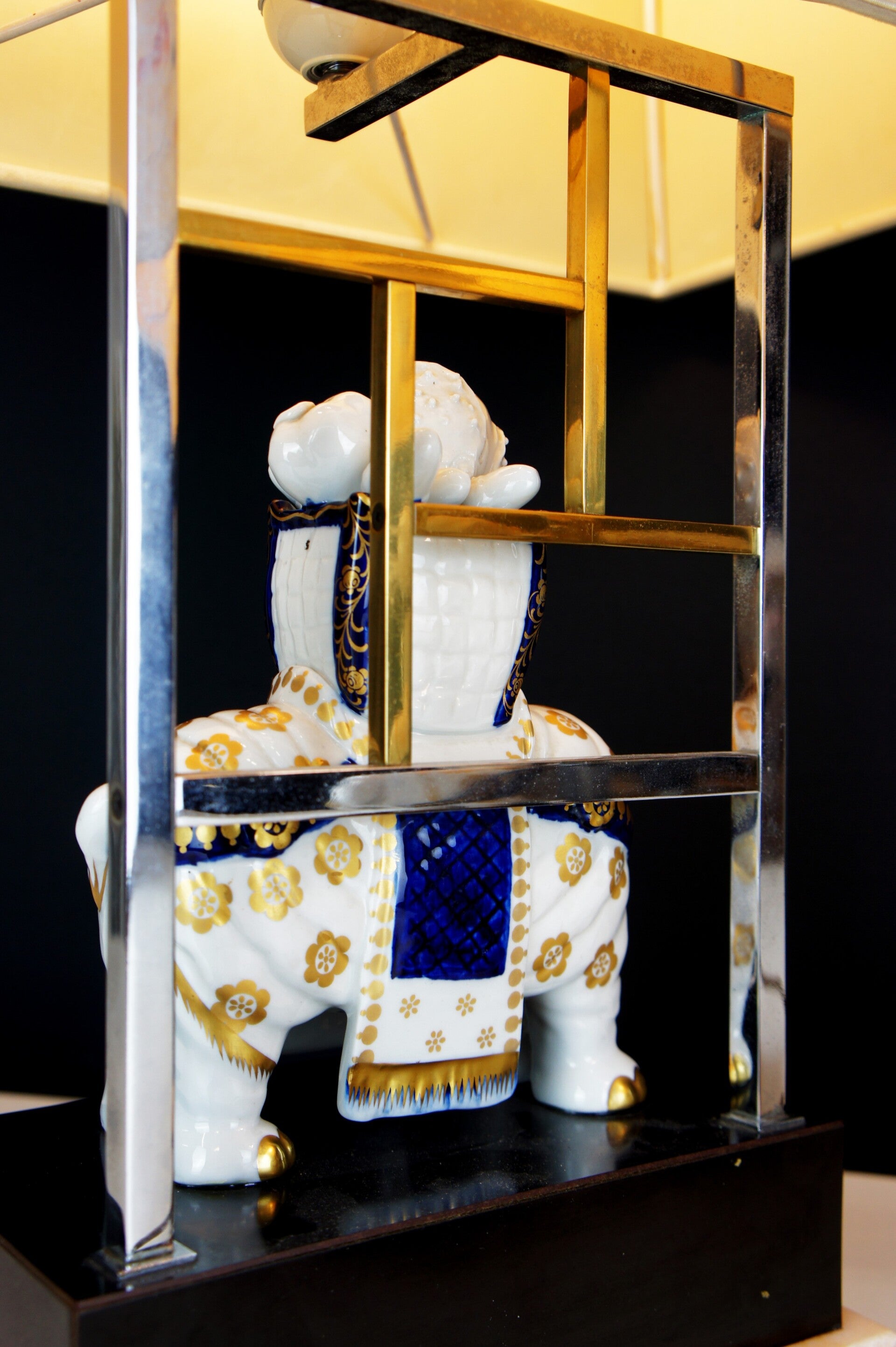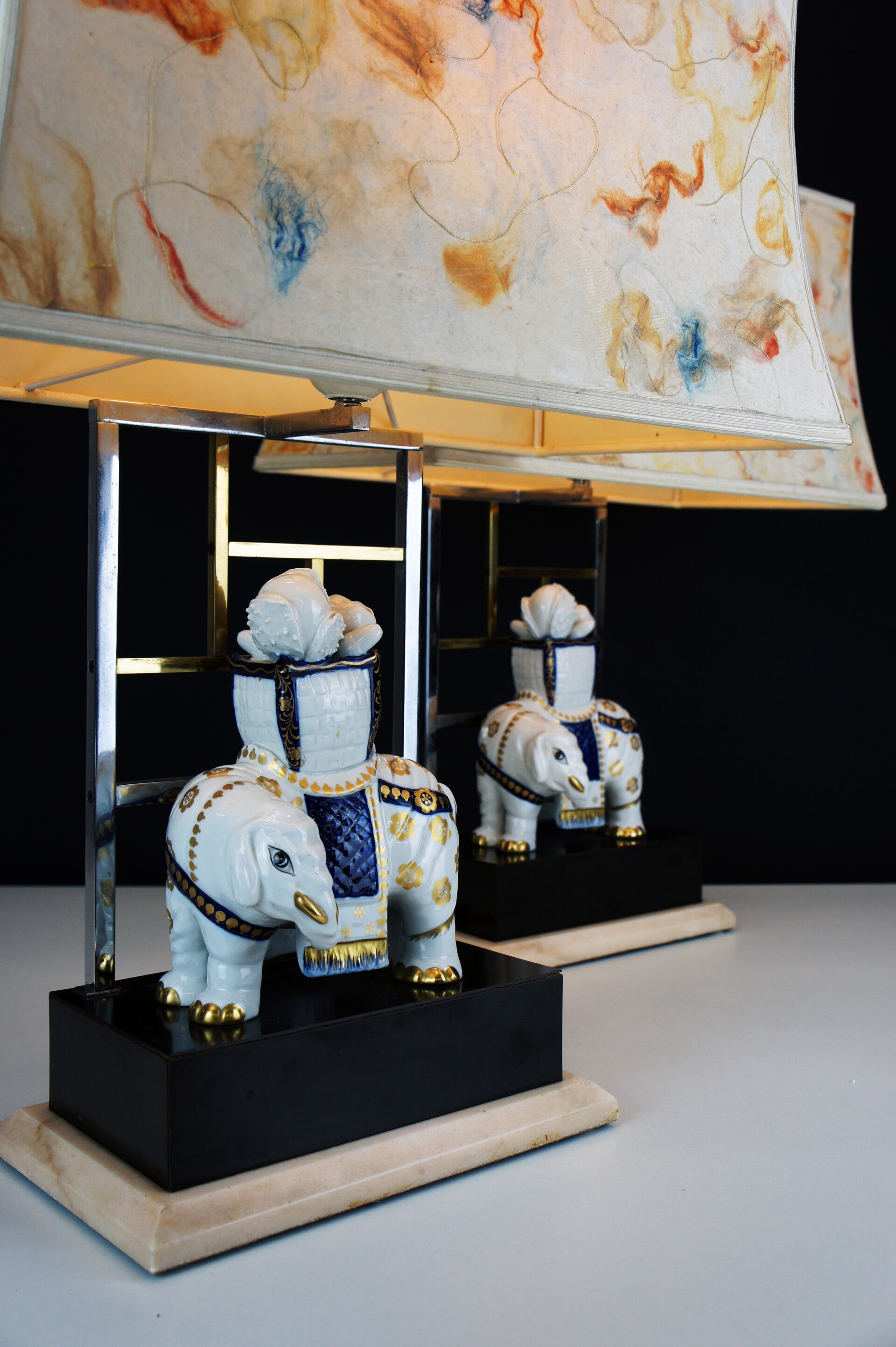 Pair of porcelain elephant table lamps by the Italian Giulia Mangani from the 70s painted in cobalt blue and gold details.