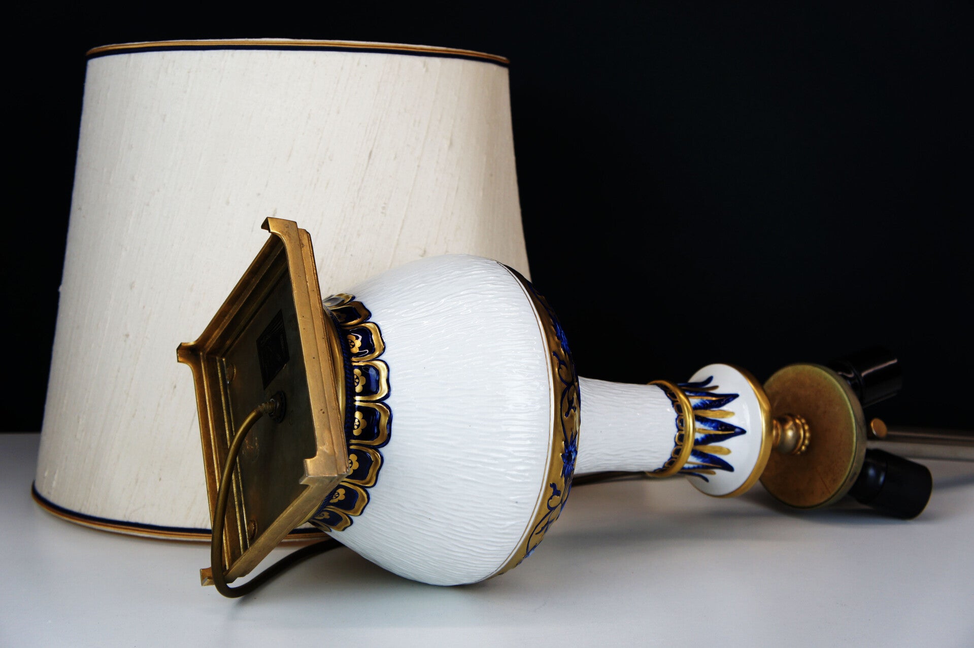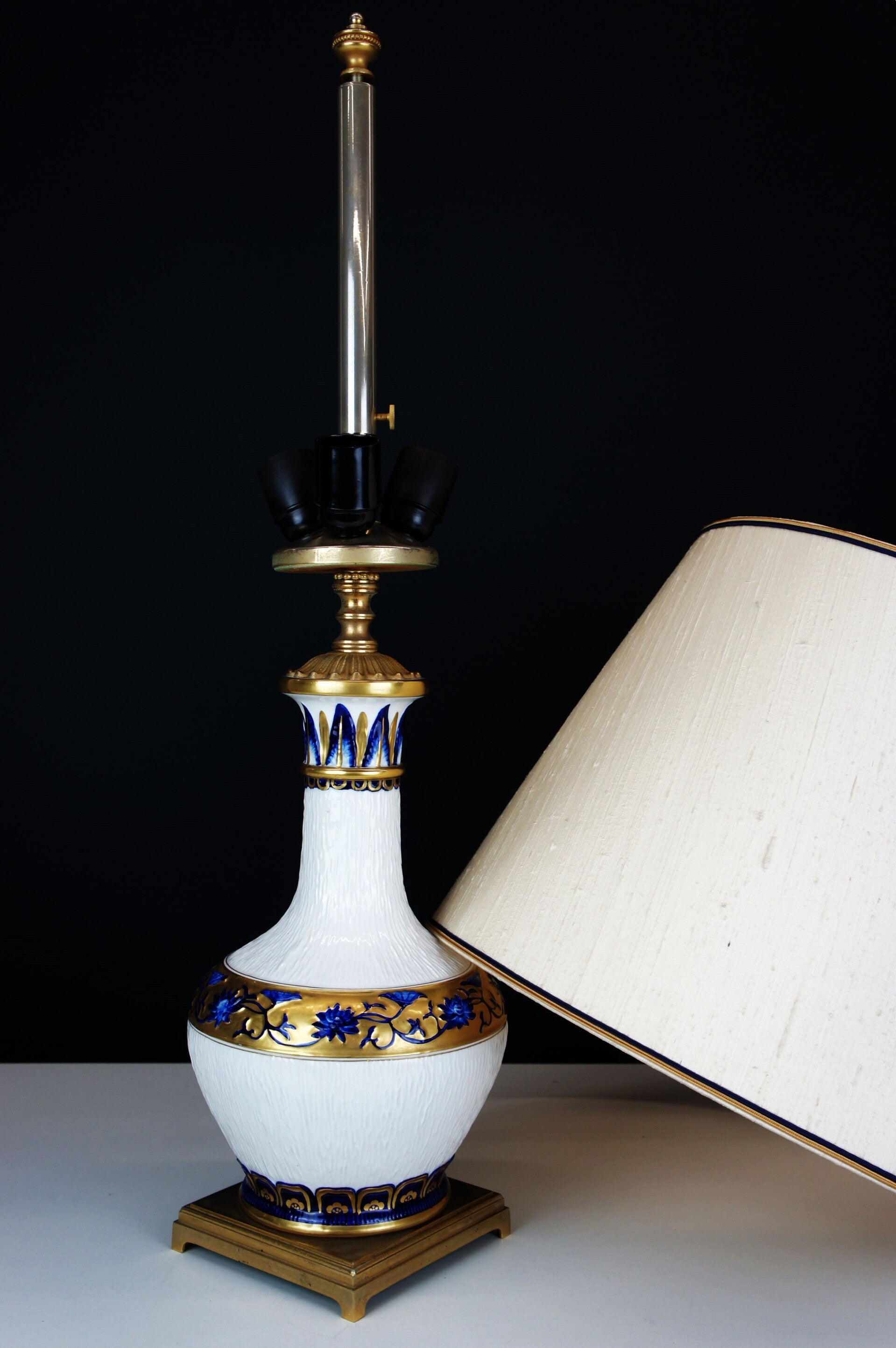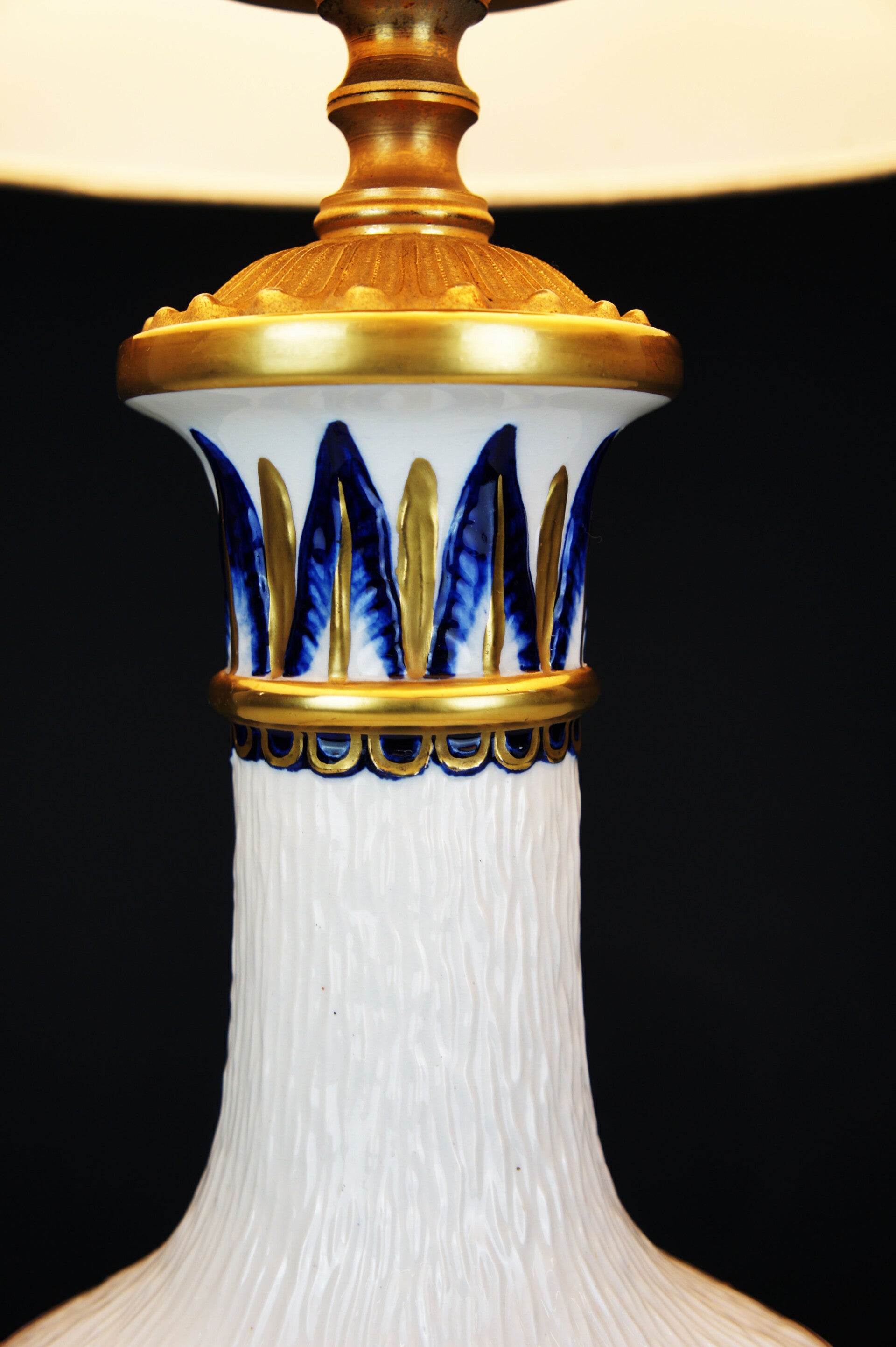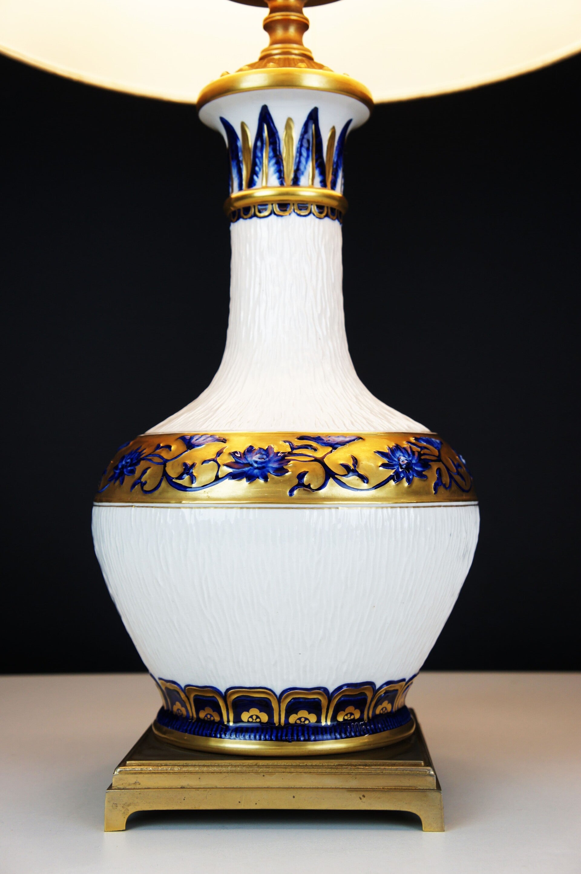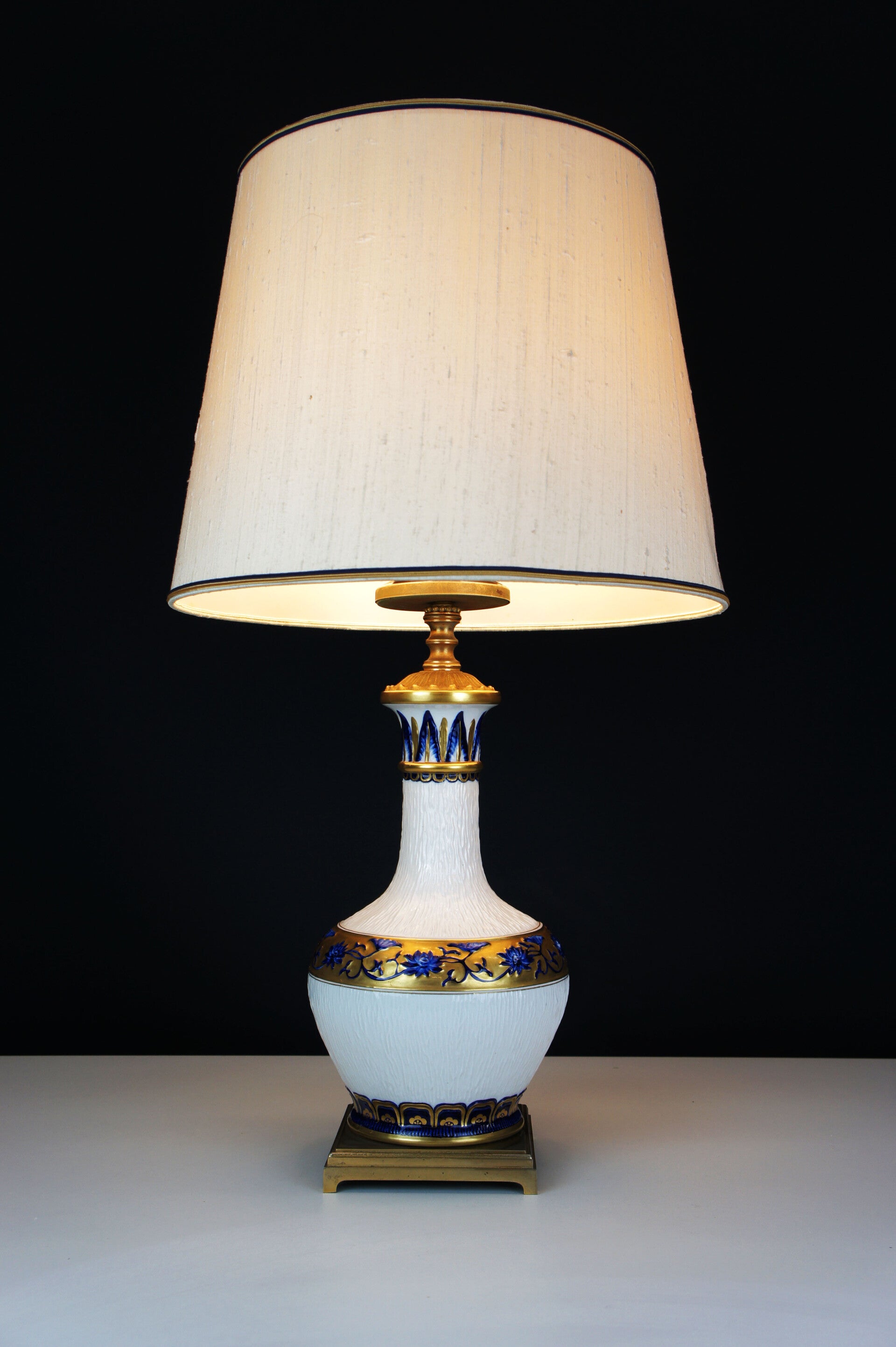 Equipped with its contemporary and original lampshade, the lampshade has a blue and gold rim at the top and bottom which goes perfectly with the colours of the porcelain.