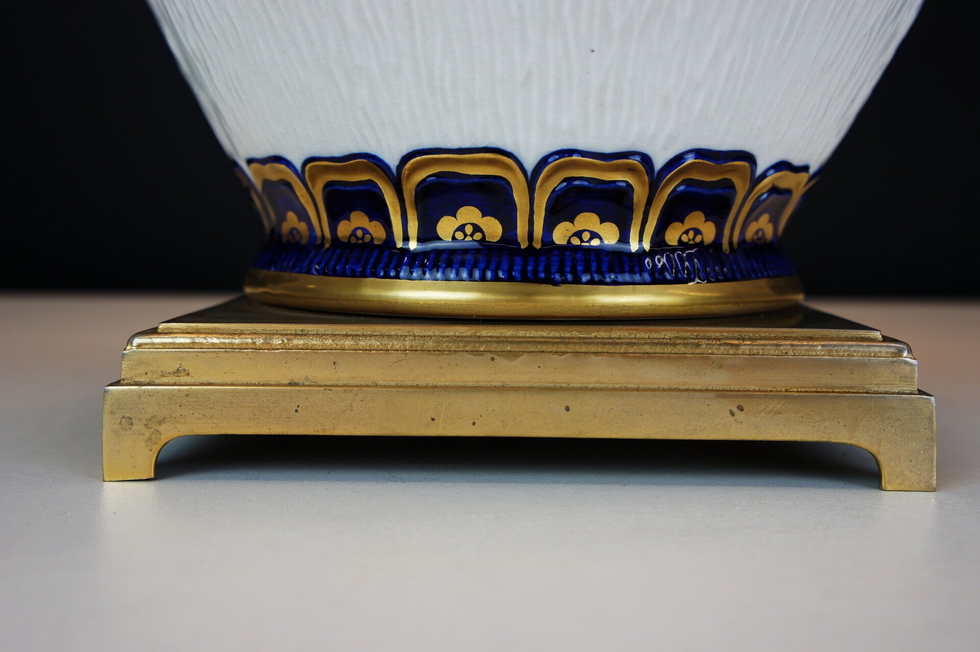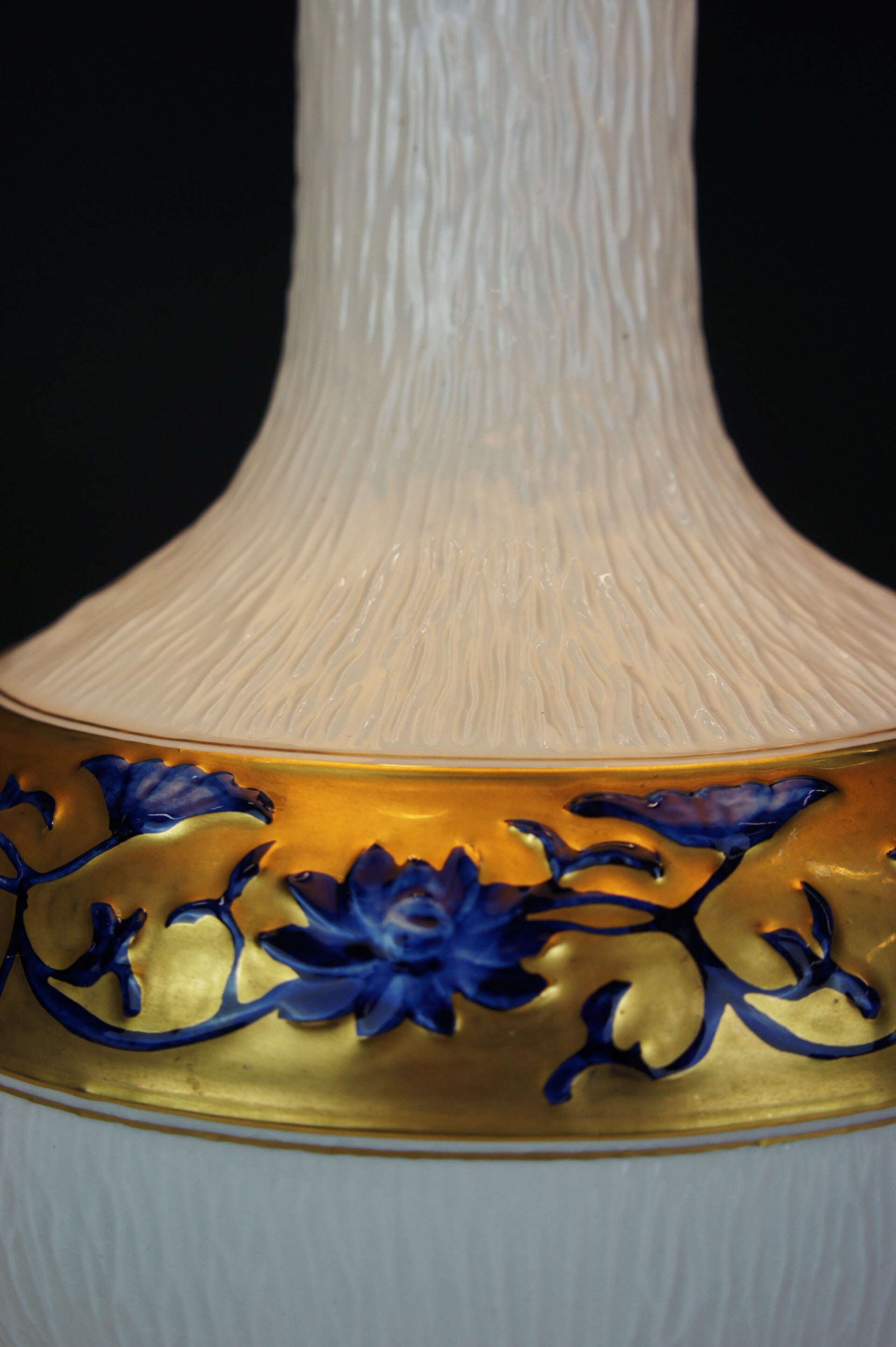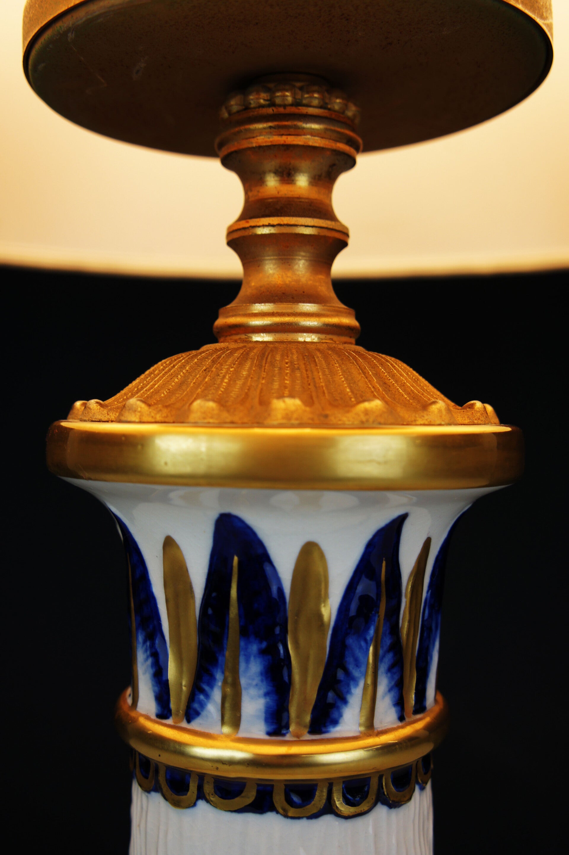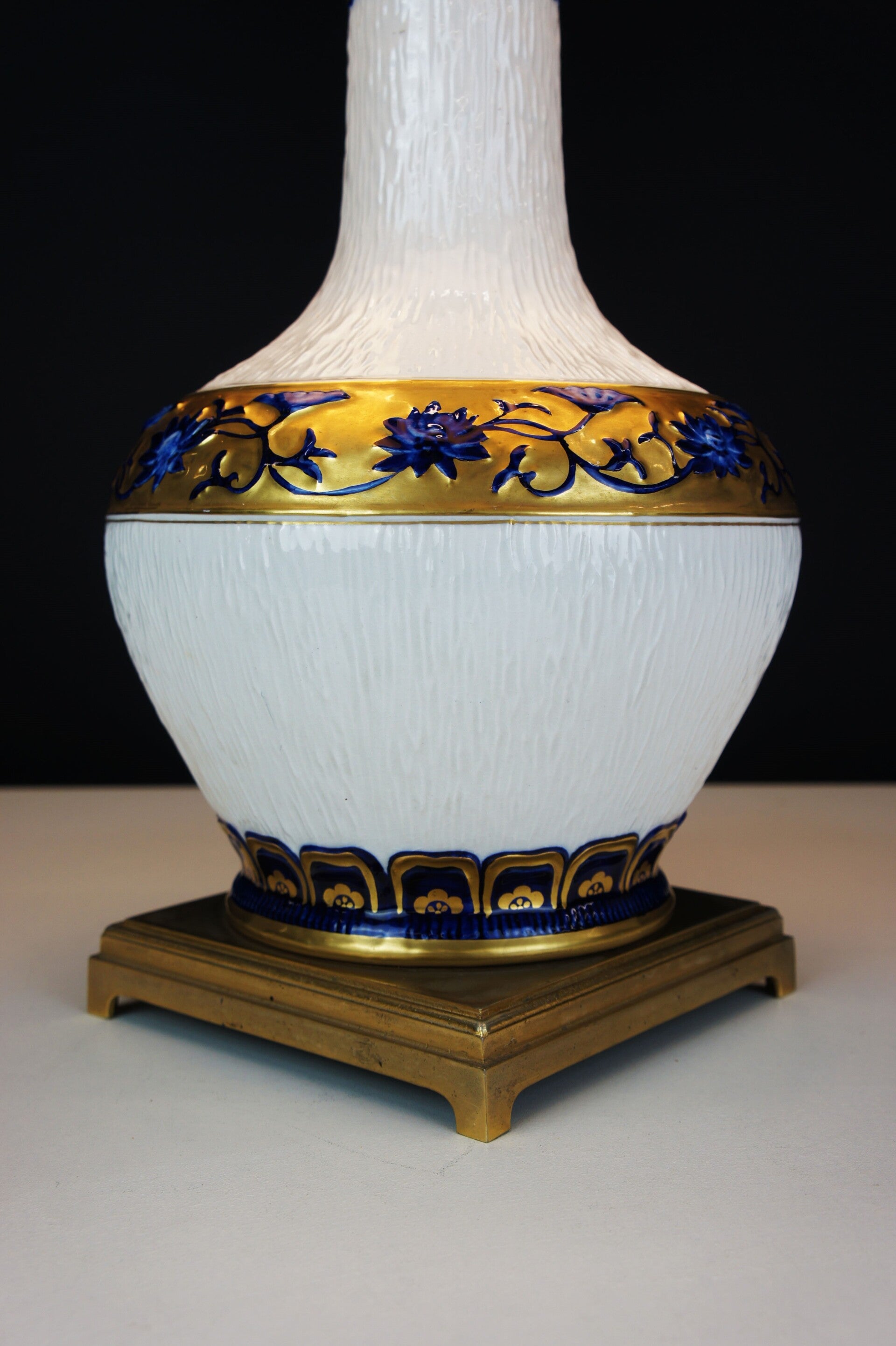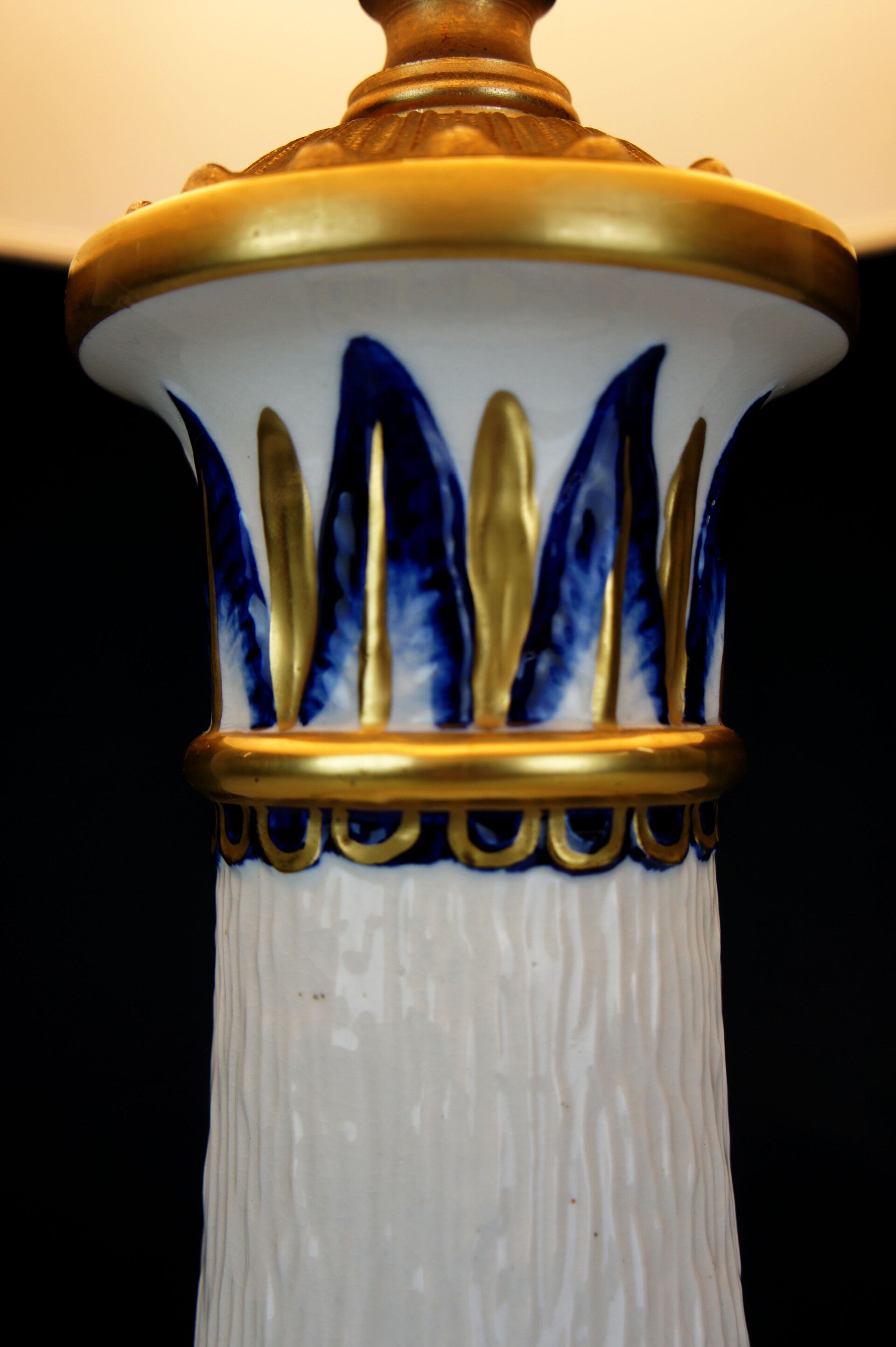 Equipped with its contemporary and original lampshade, the lampshade has a blue and gold rim at the top and bottom which goes perfectly with the colours of the porcelain.