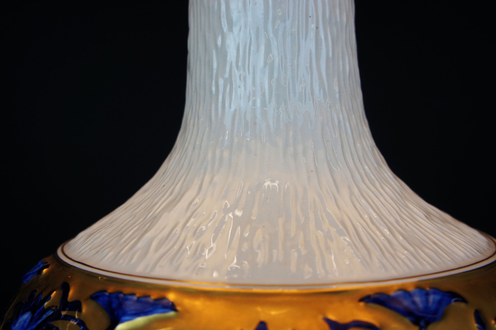 A blue rim was applied centrally around the clear porcelain decorated with a gold flower pattern.