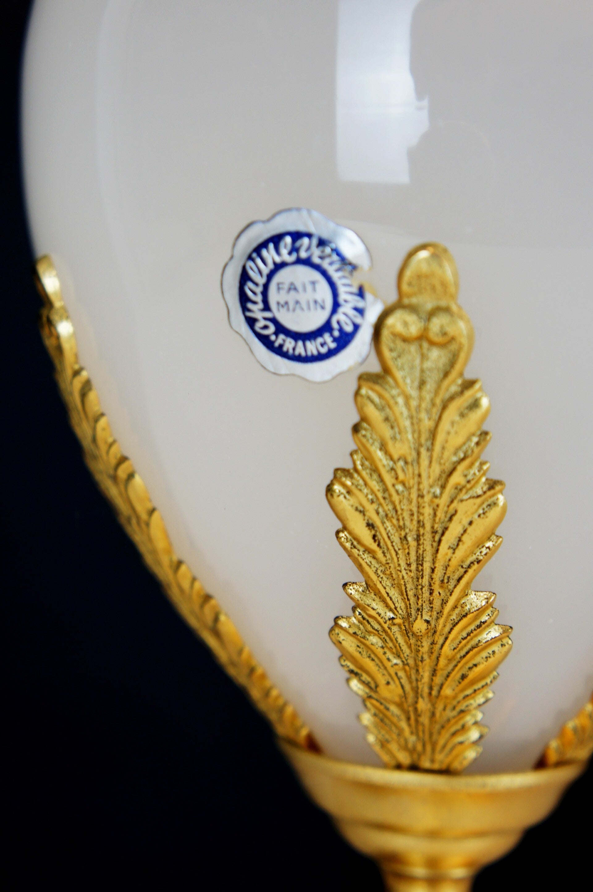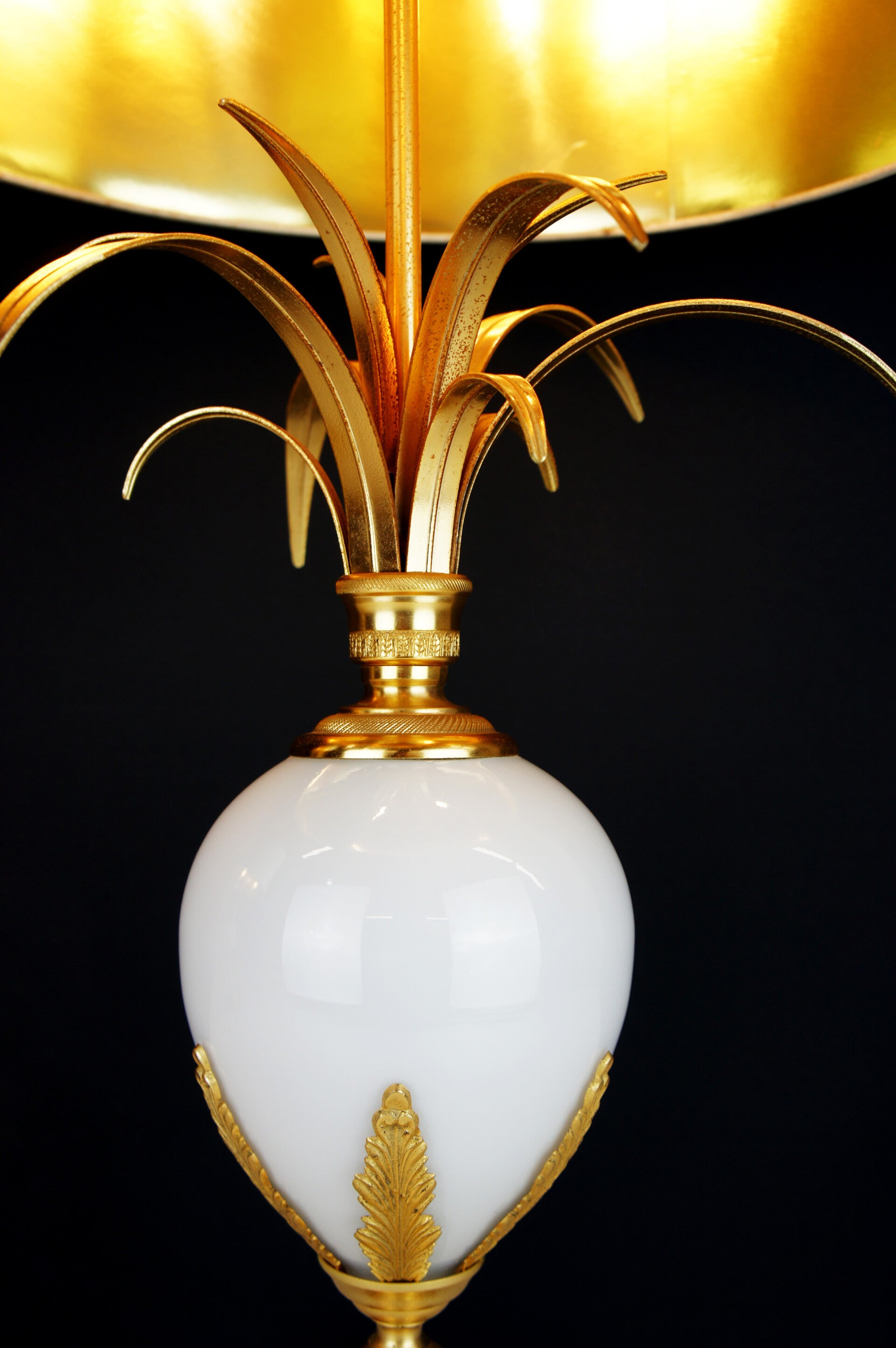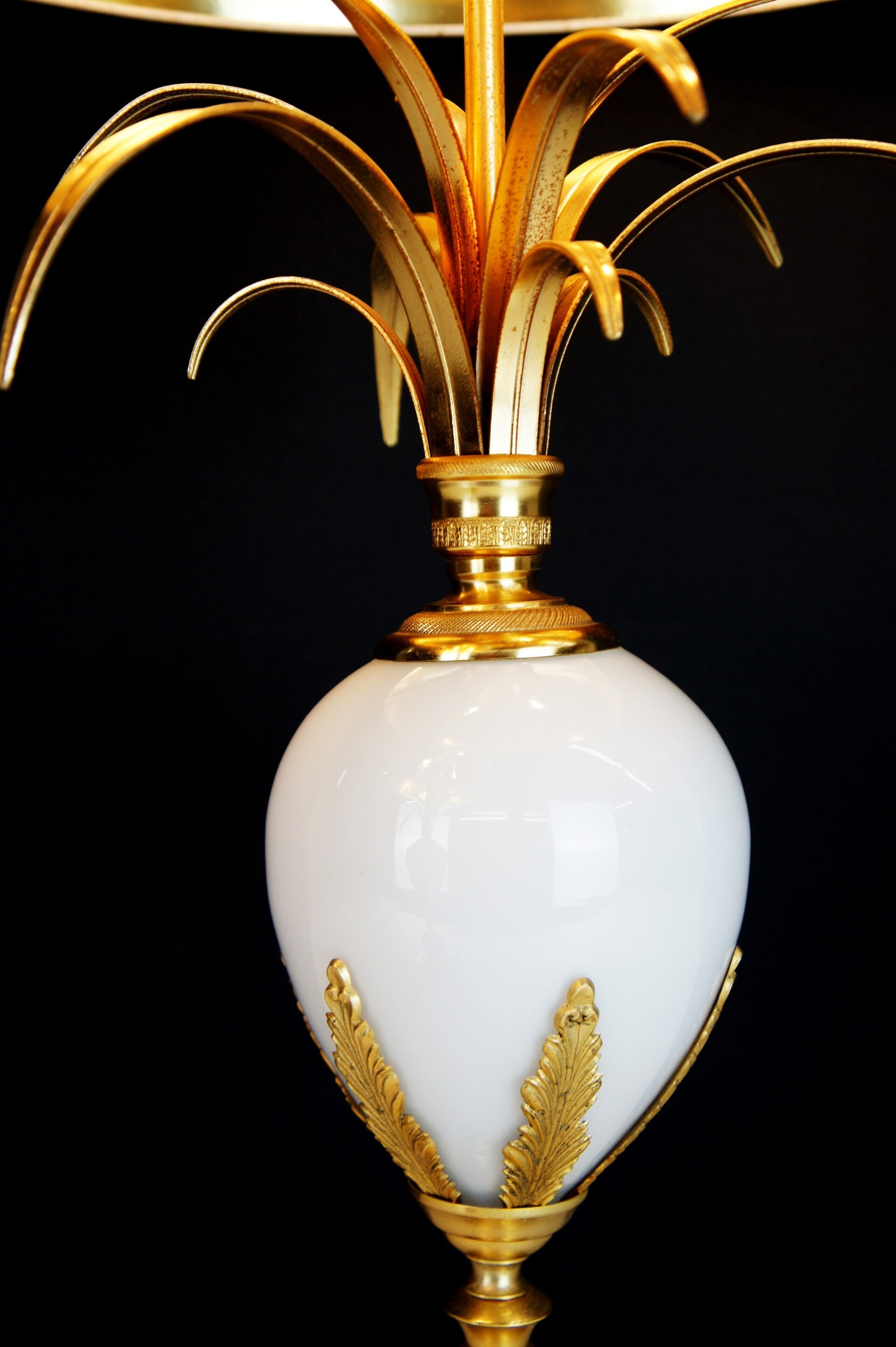 Gilded brass work with a central ostrich egg made of French opal glass.