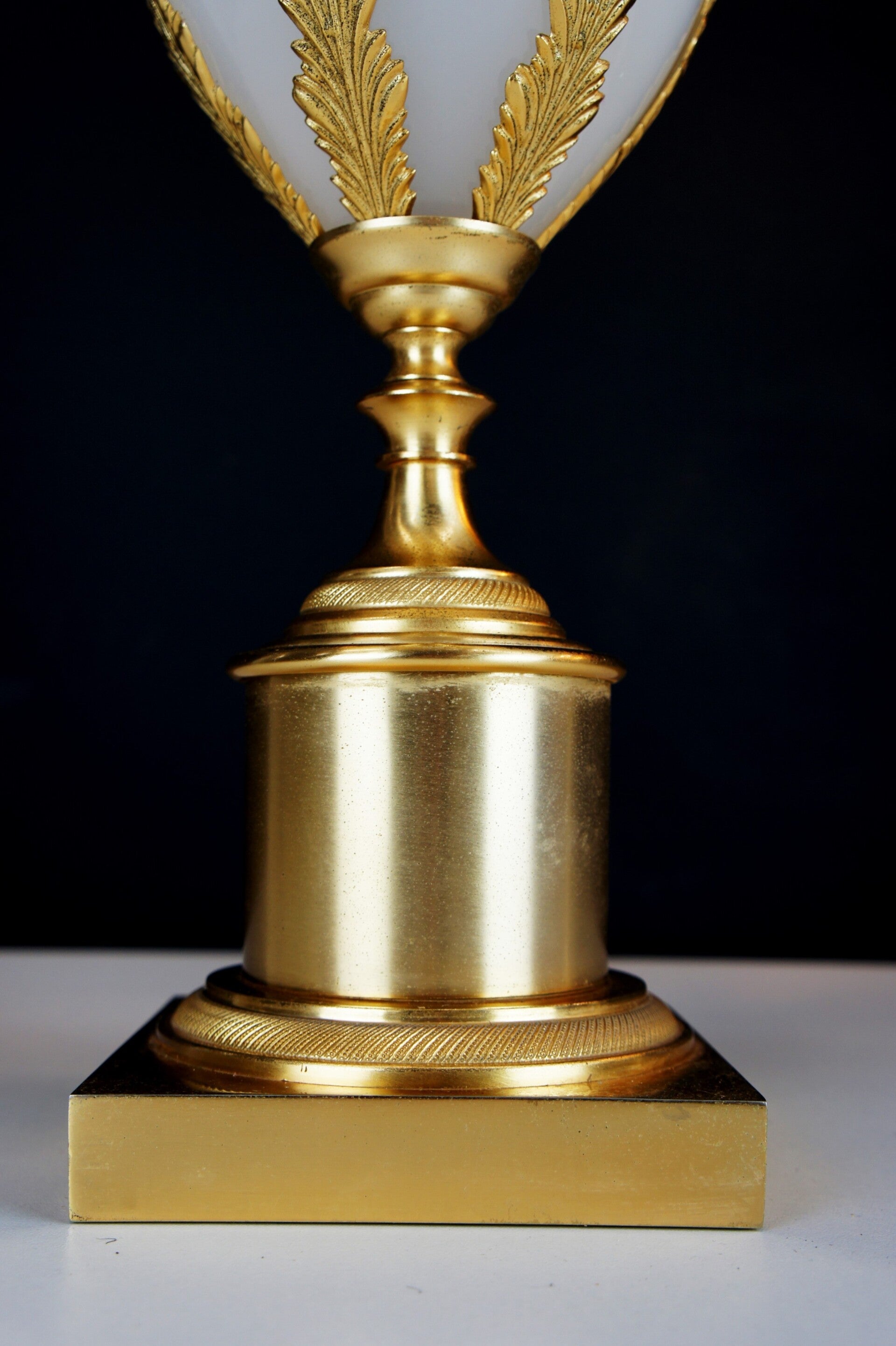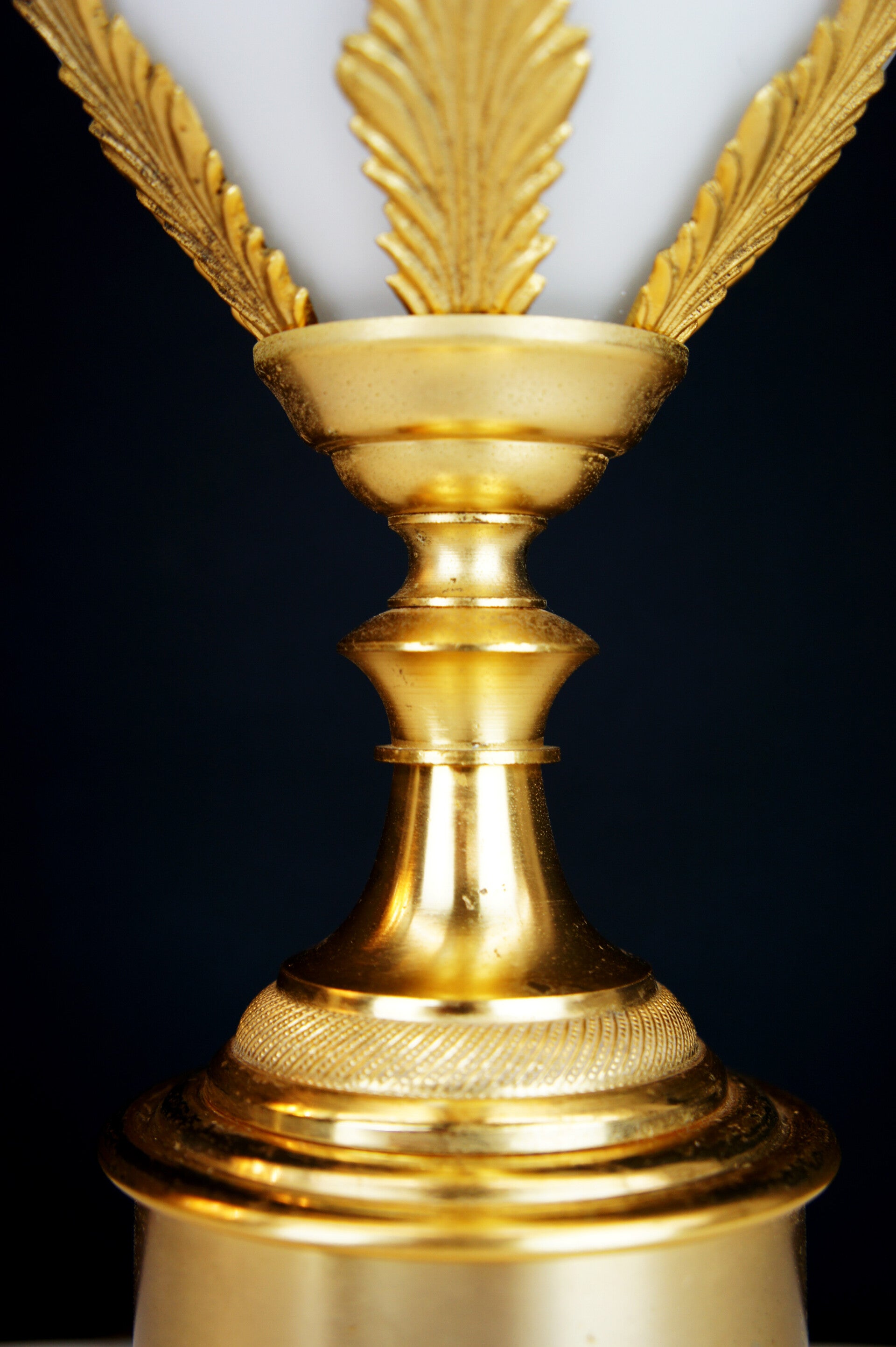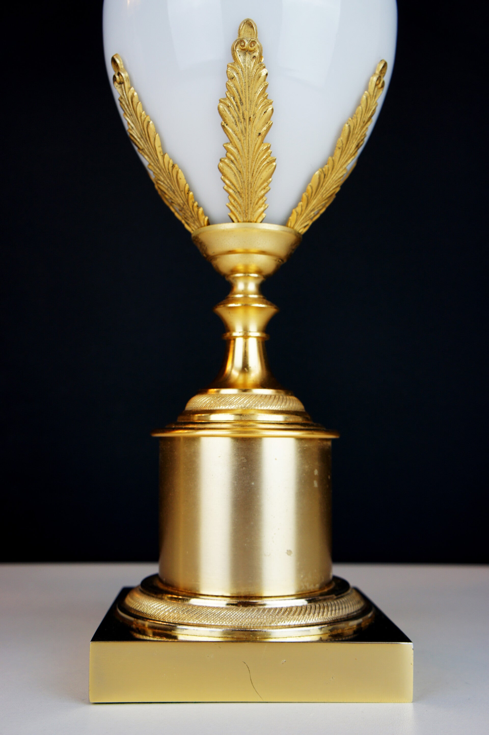Gilded brass work with a central ostrich egg made of French opal glass.