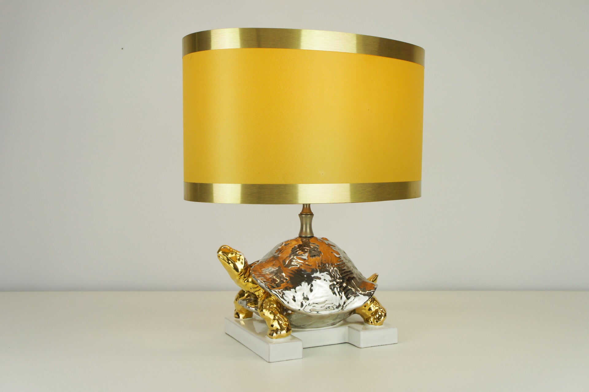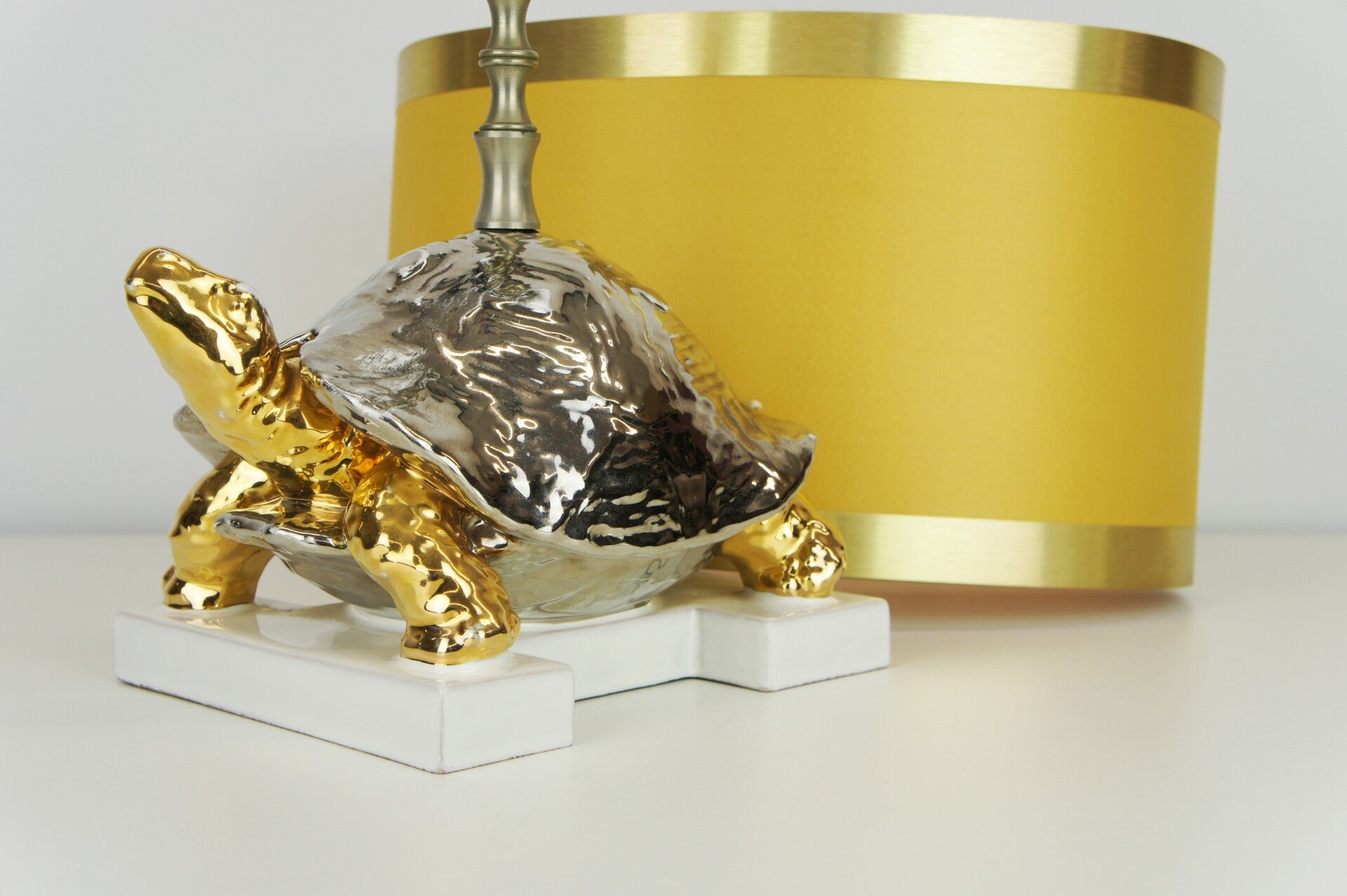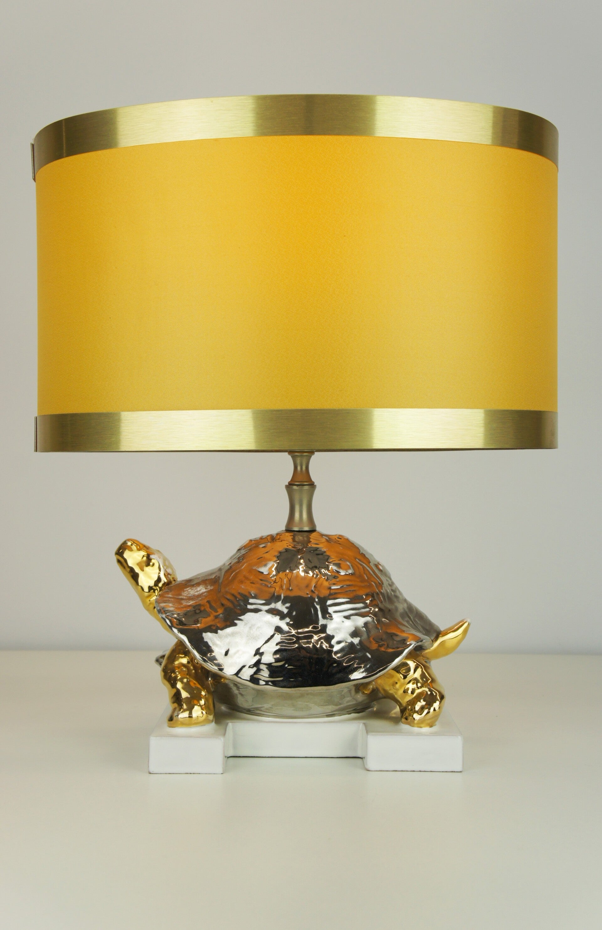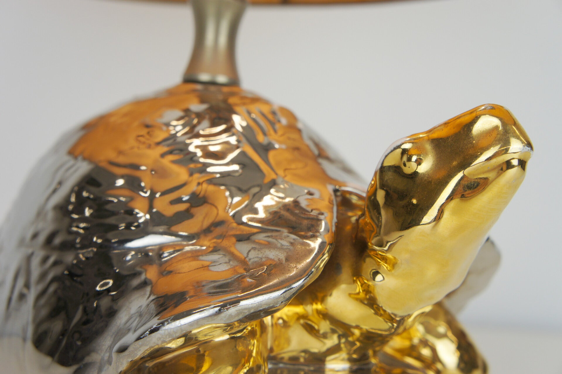 One of the most special pieces from the zaccagnini collection is this turtle in silver and gold mirror lacquer glaze, which we offer in completely original condition with a very special lampshade that was made especially for this design.