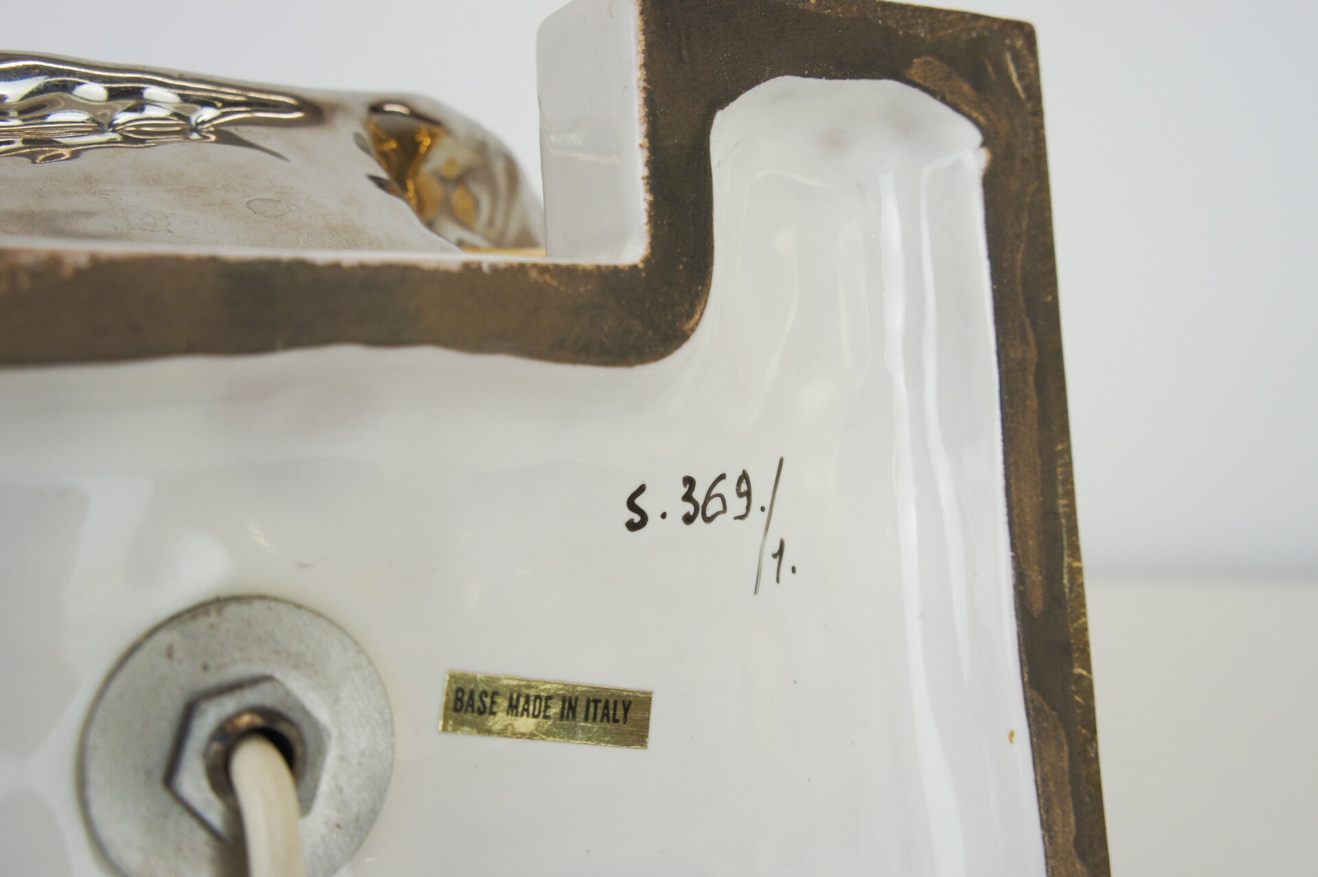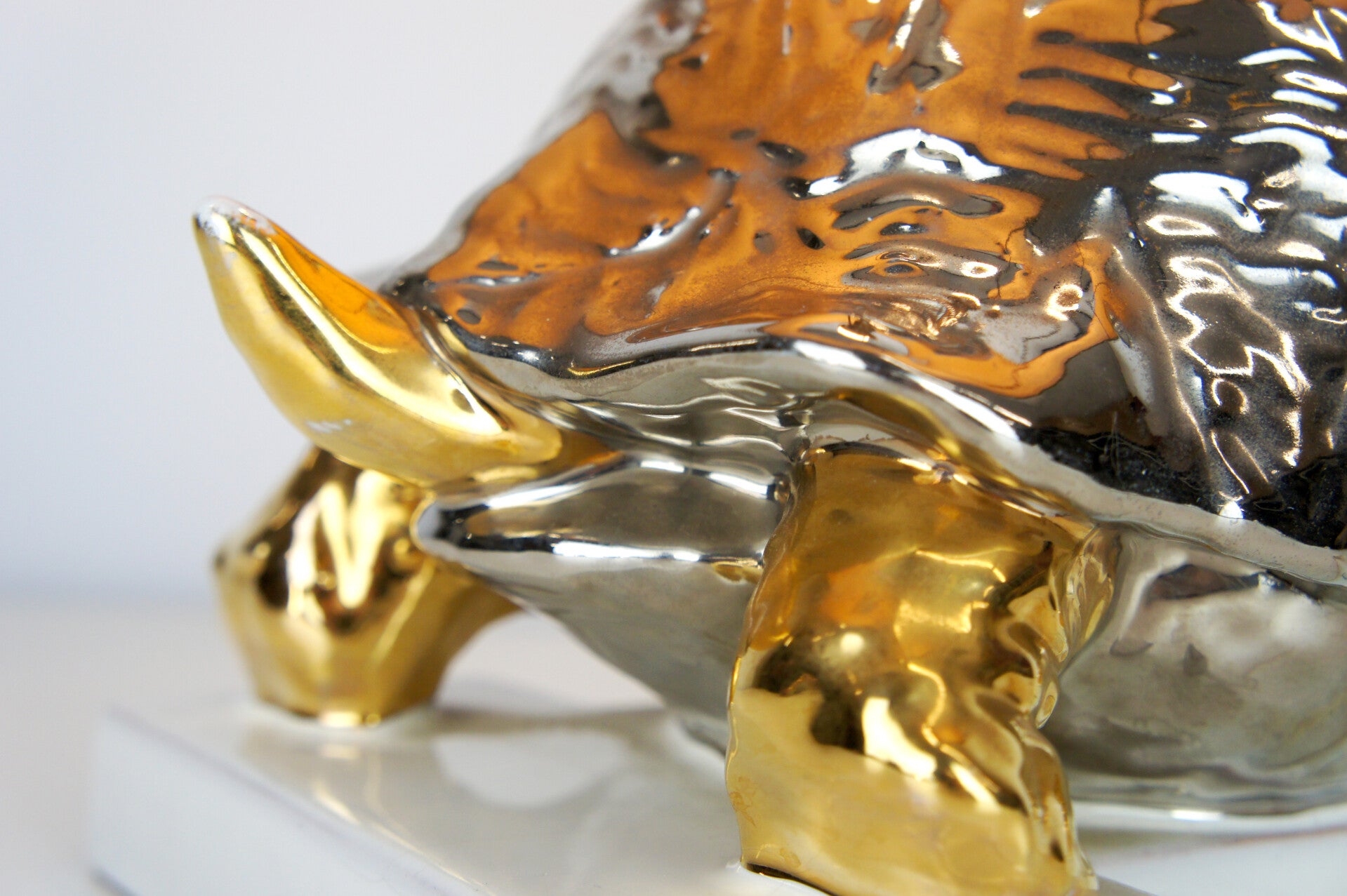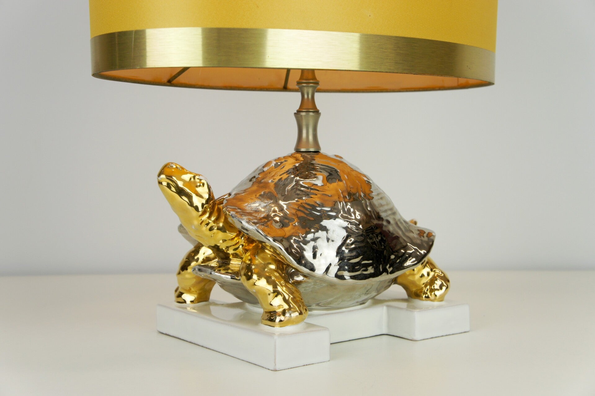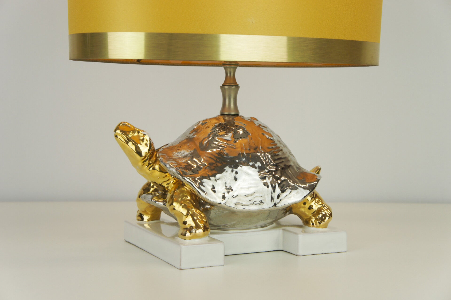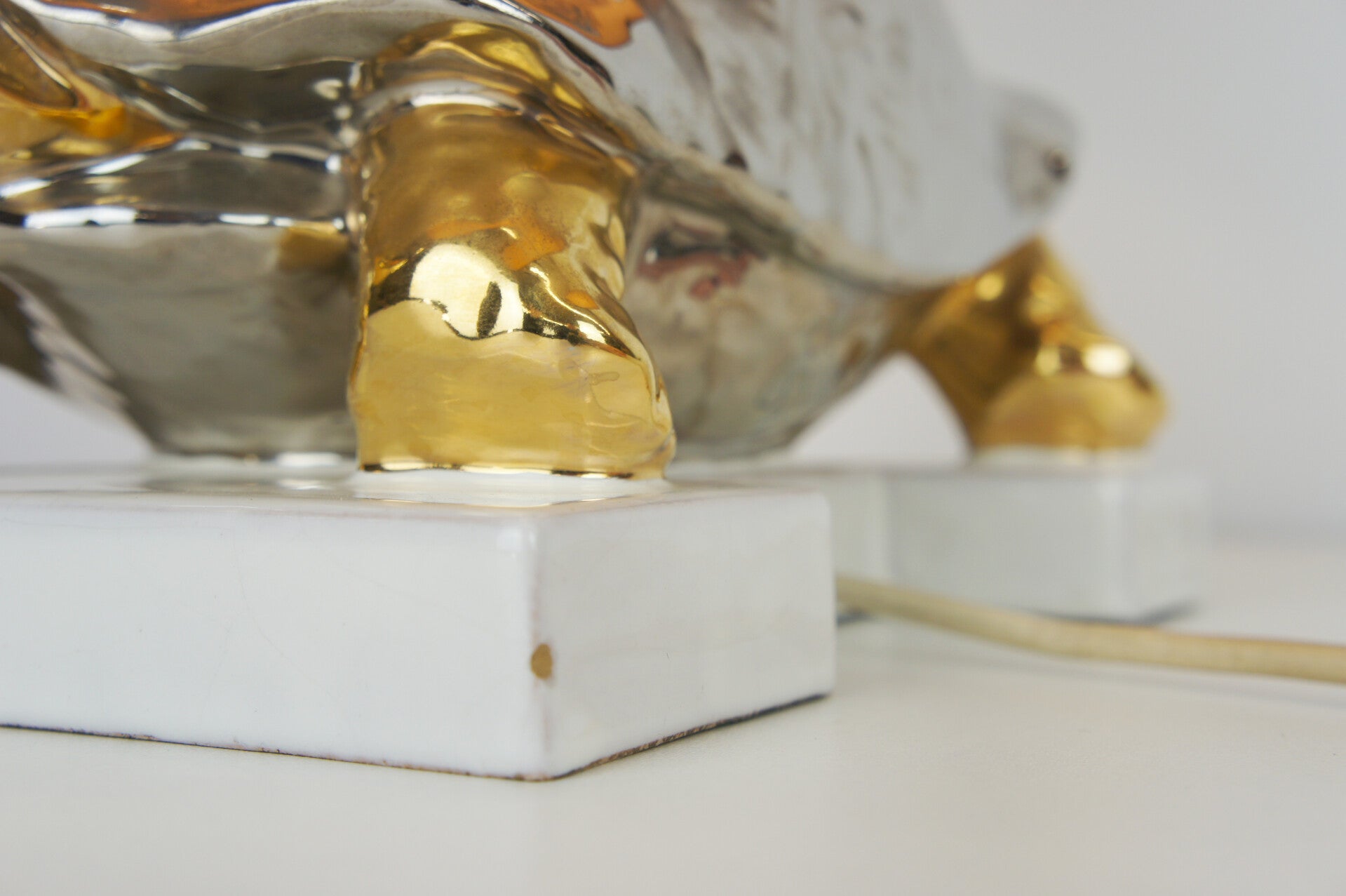 One of the most special pieces from the zaccagnini collection is this turtle in silver and gold mirror lacquer glaze, which we offer in completely original condition with a very special lampshade that was made especially for this design.