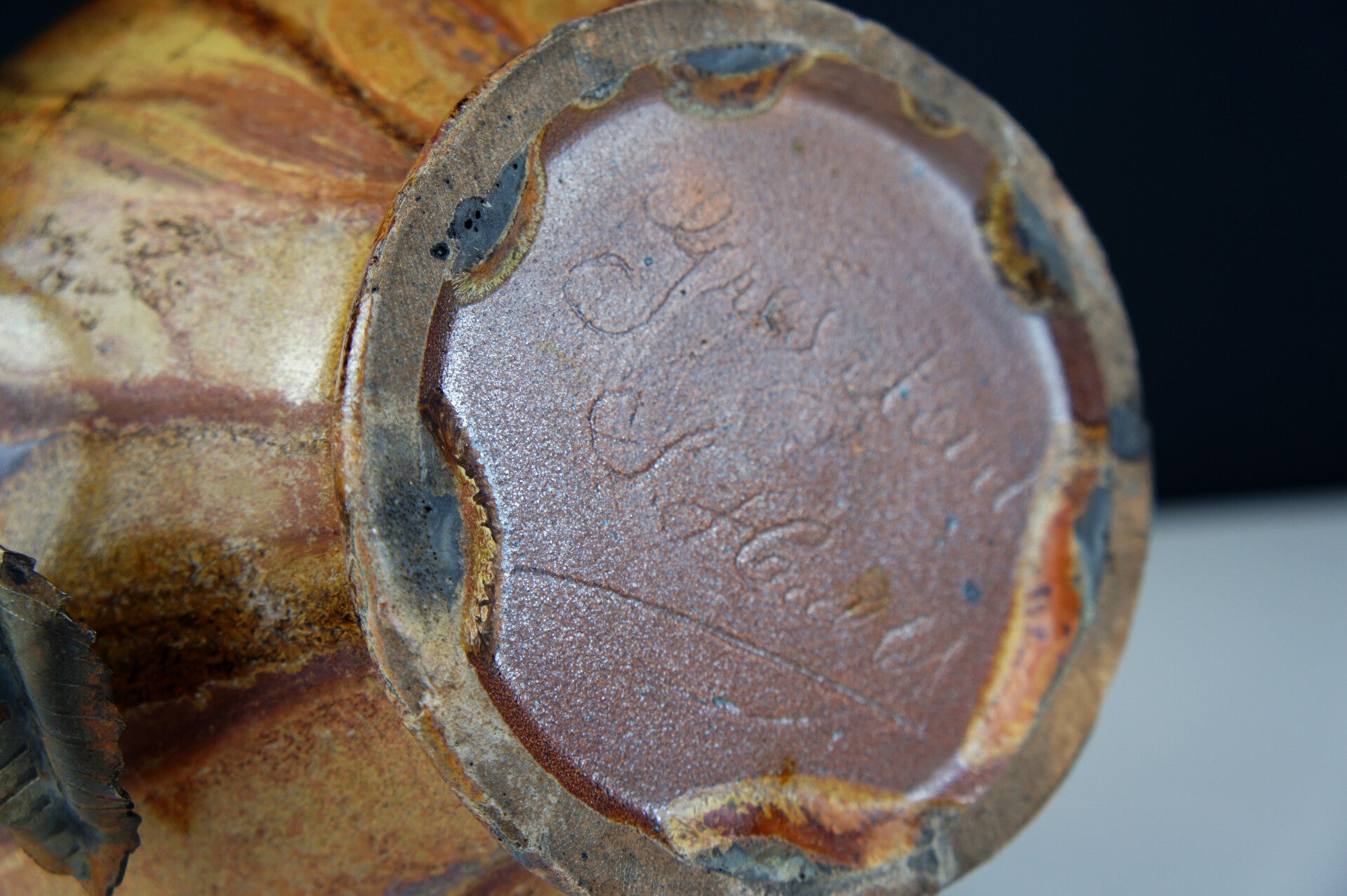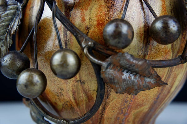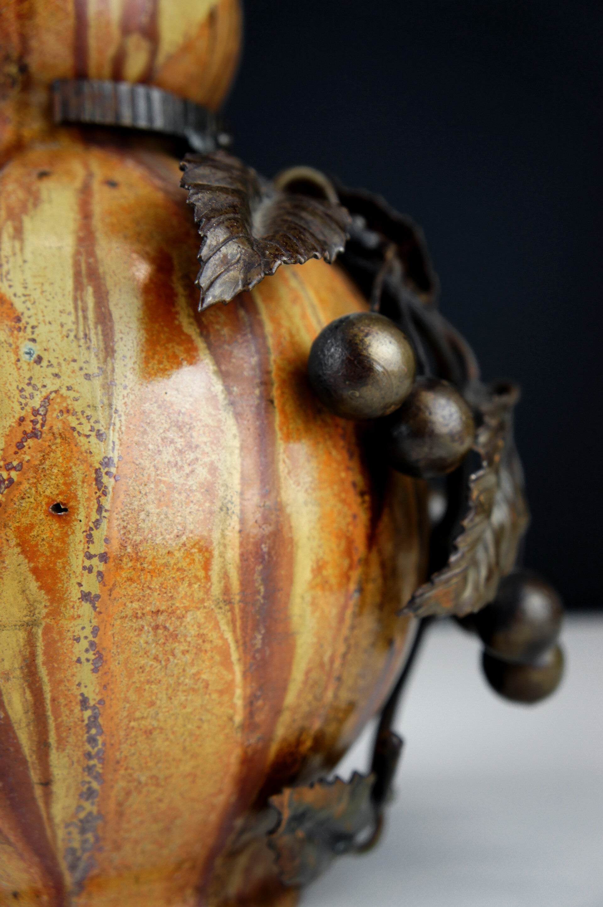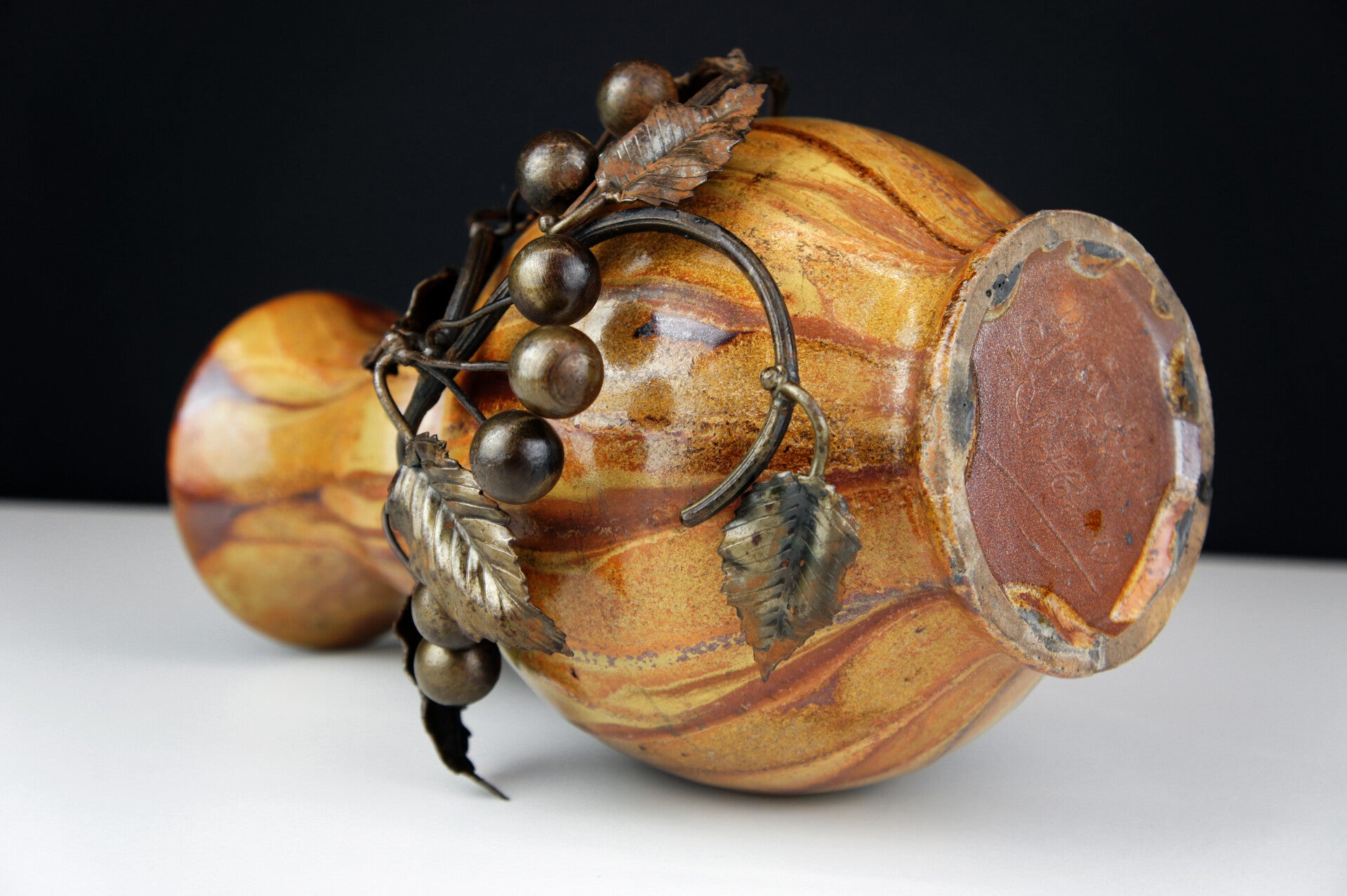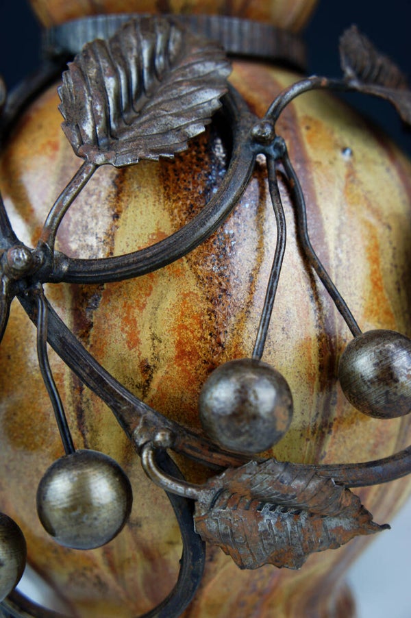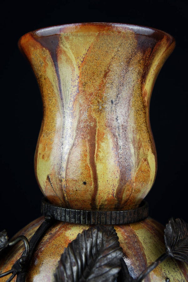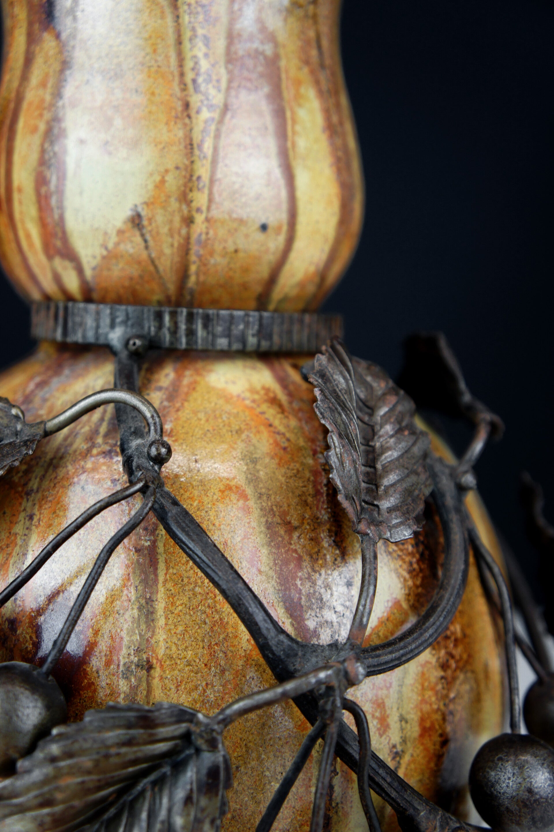 Cast and turned vase in stoneware from Bouffioulx, wrought iron work of a grapevine.