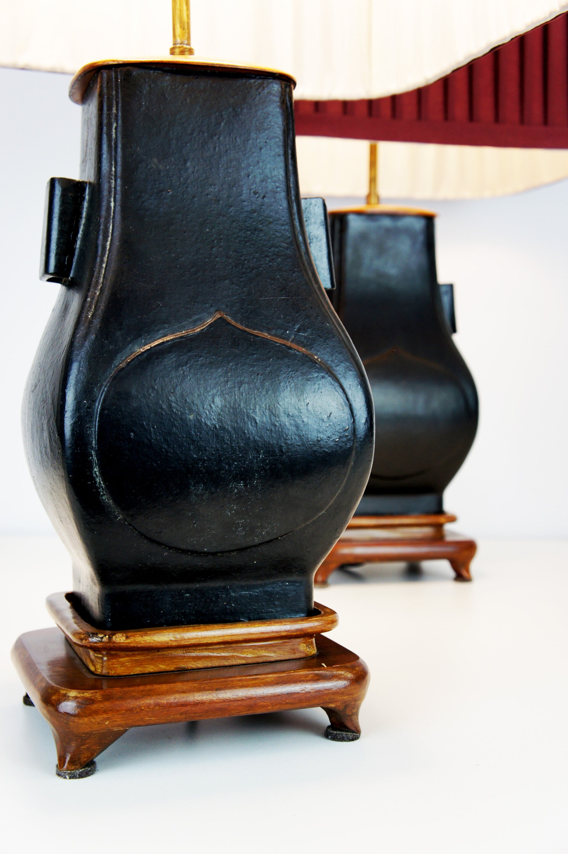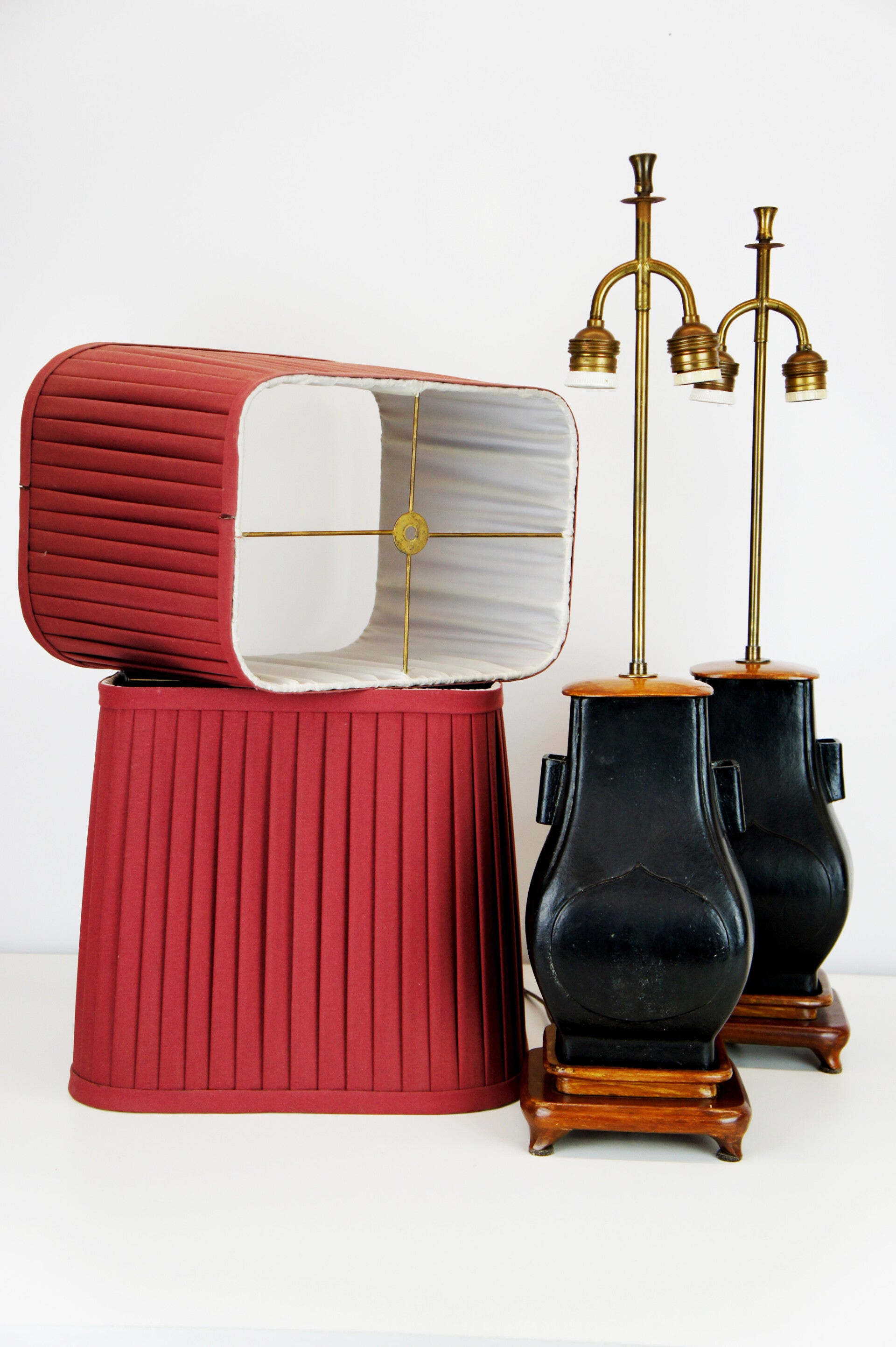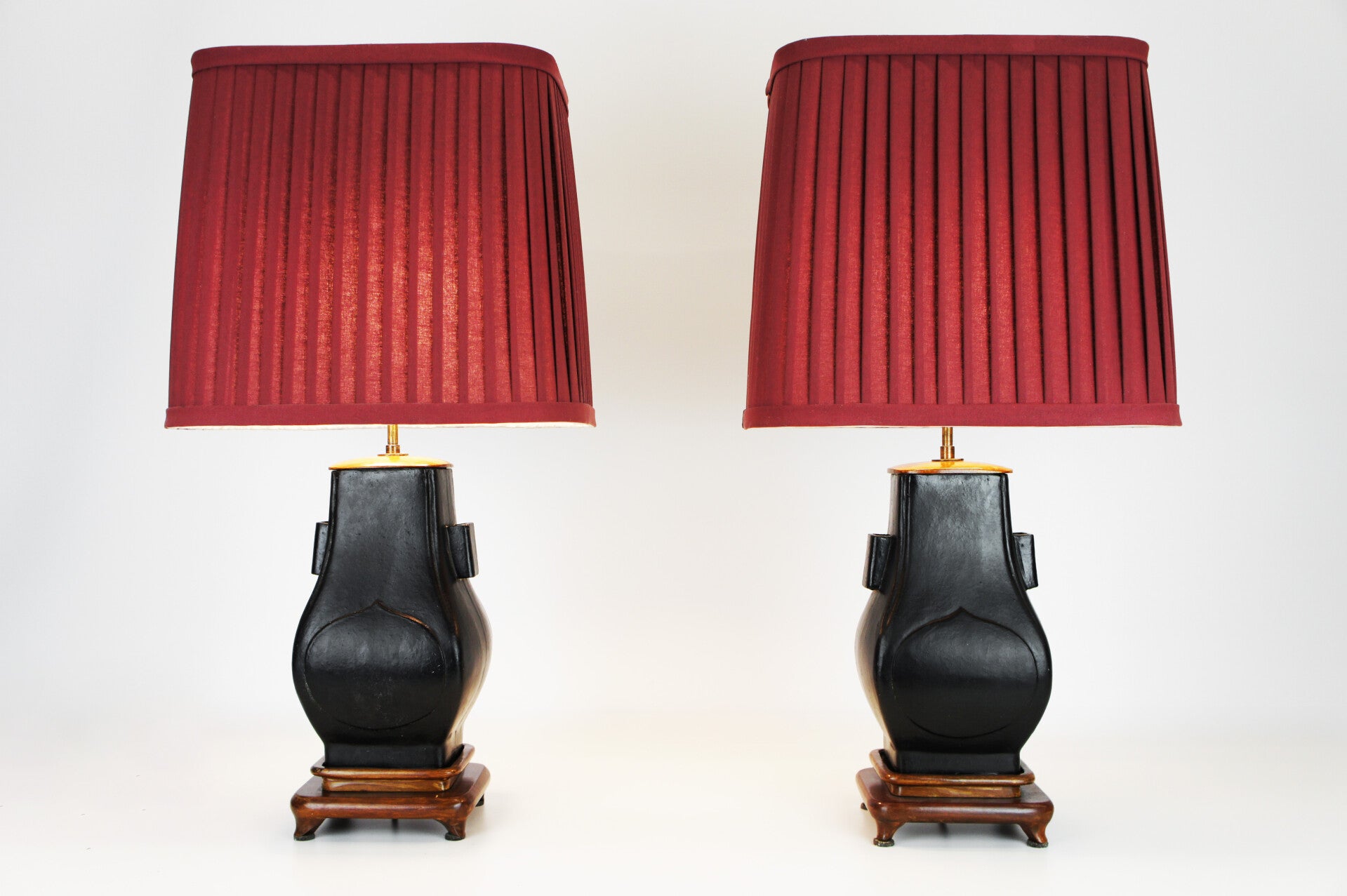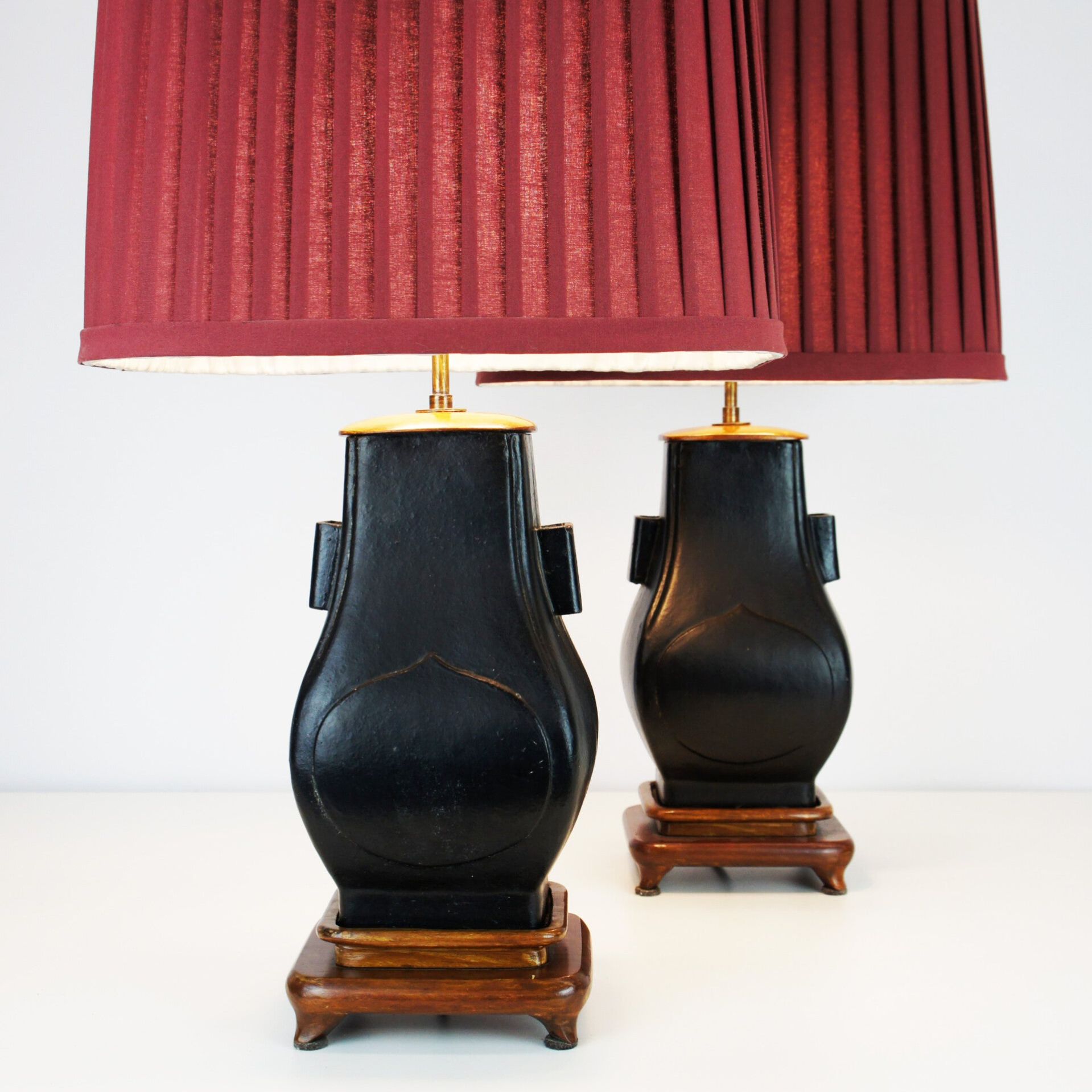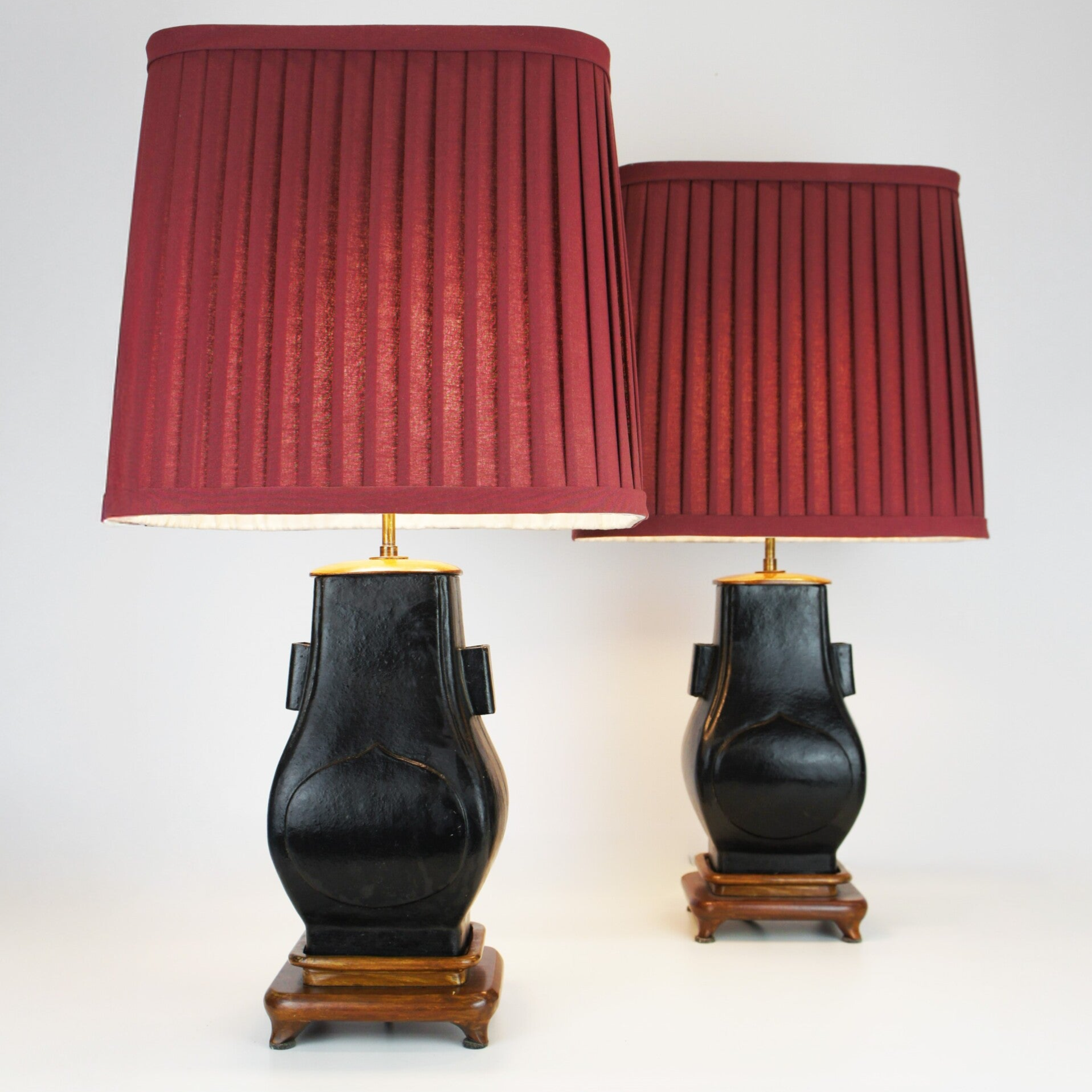 Pair of black ceramic urn table lamps with classic red pleated lampshades.