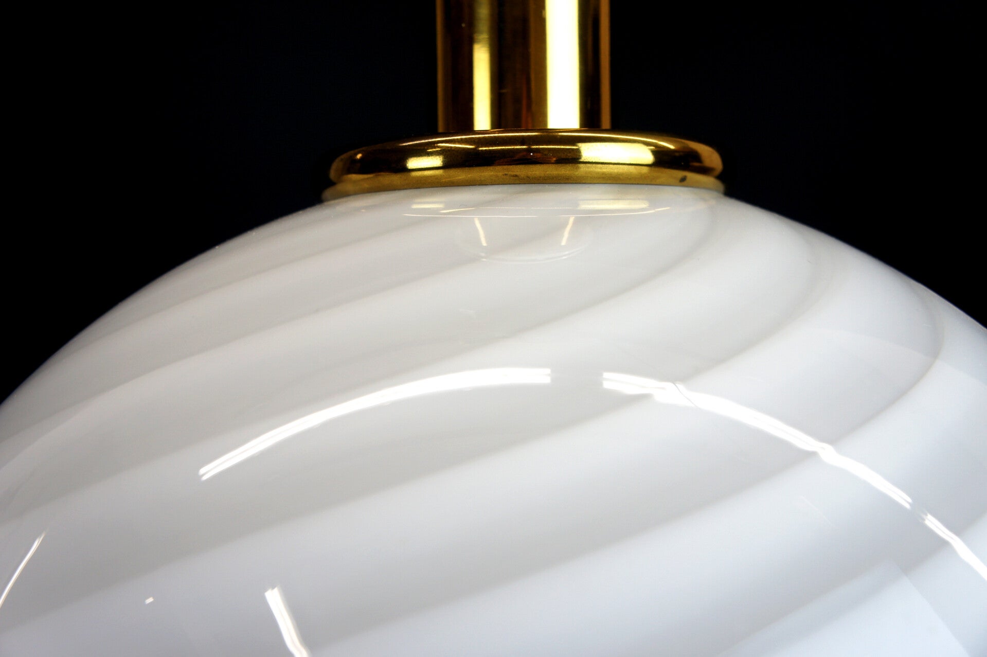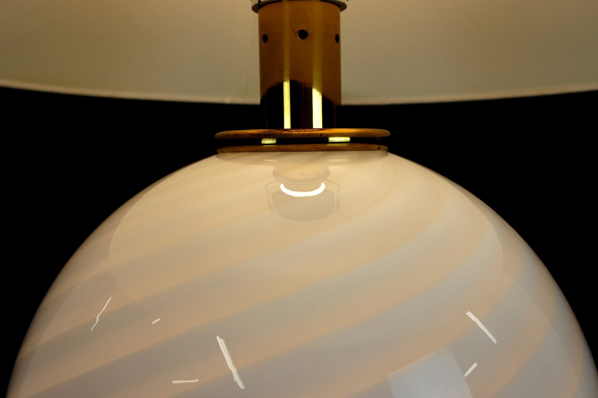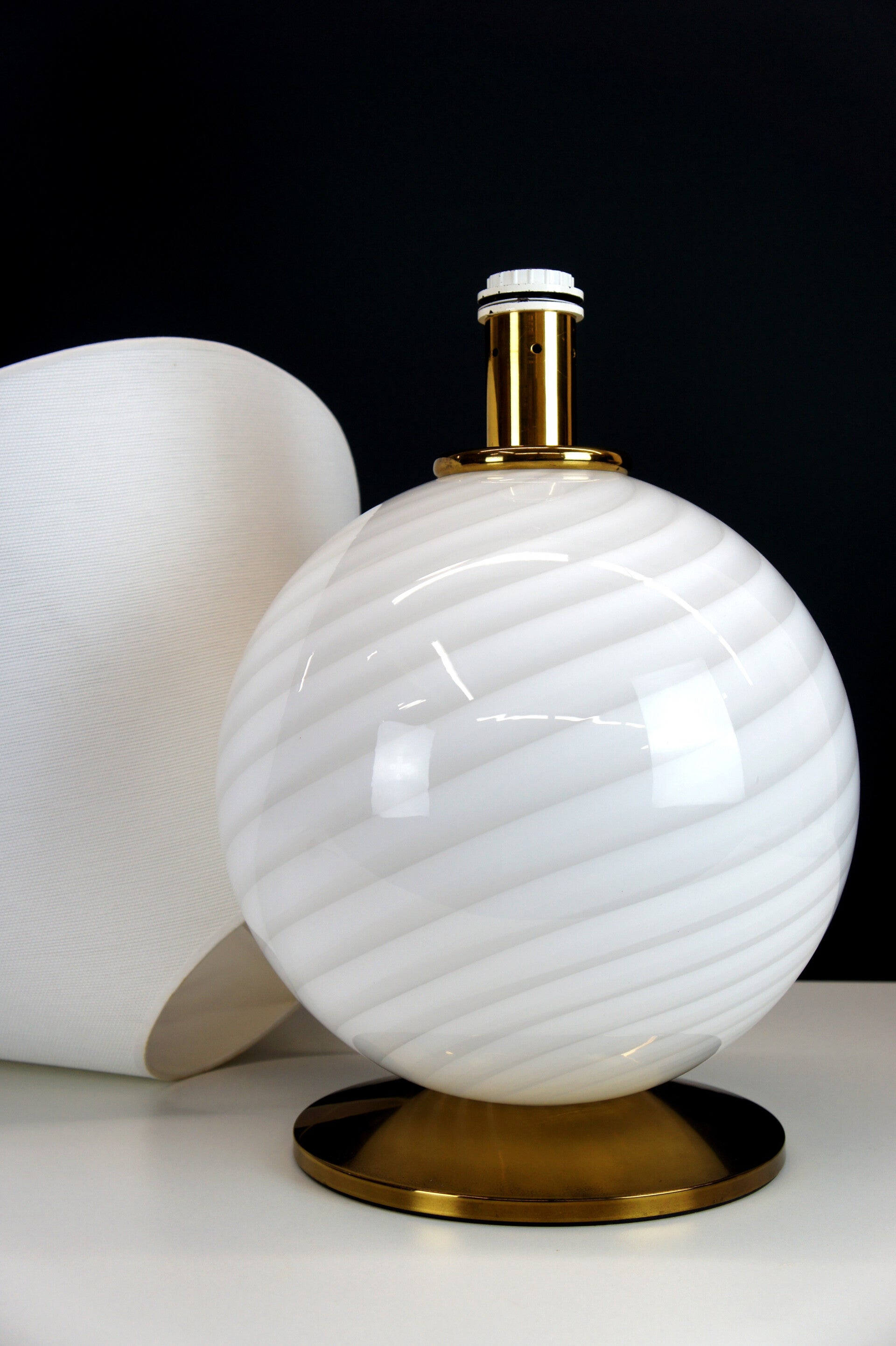 The lamp carries a large white lampshade, the Murano sphere is mounted on a brass base, there is a second light point in the glasswork, with the switch you can switch it on separately as desired.