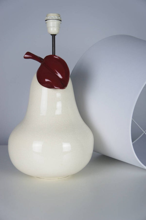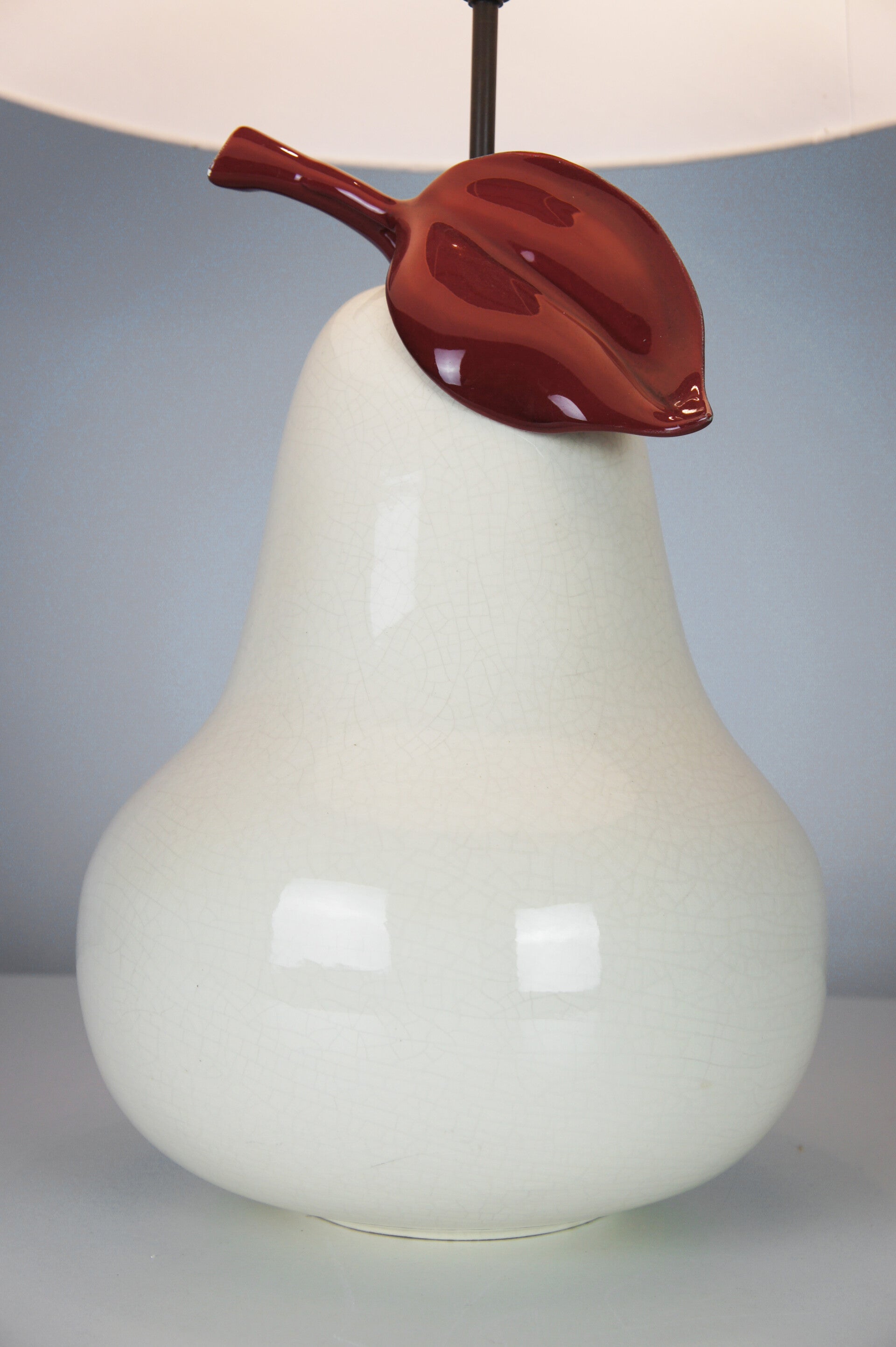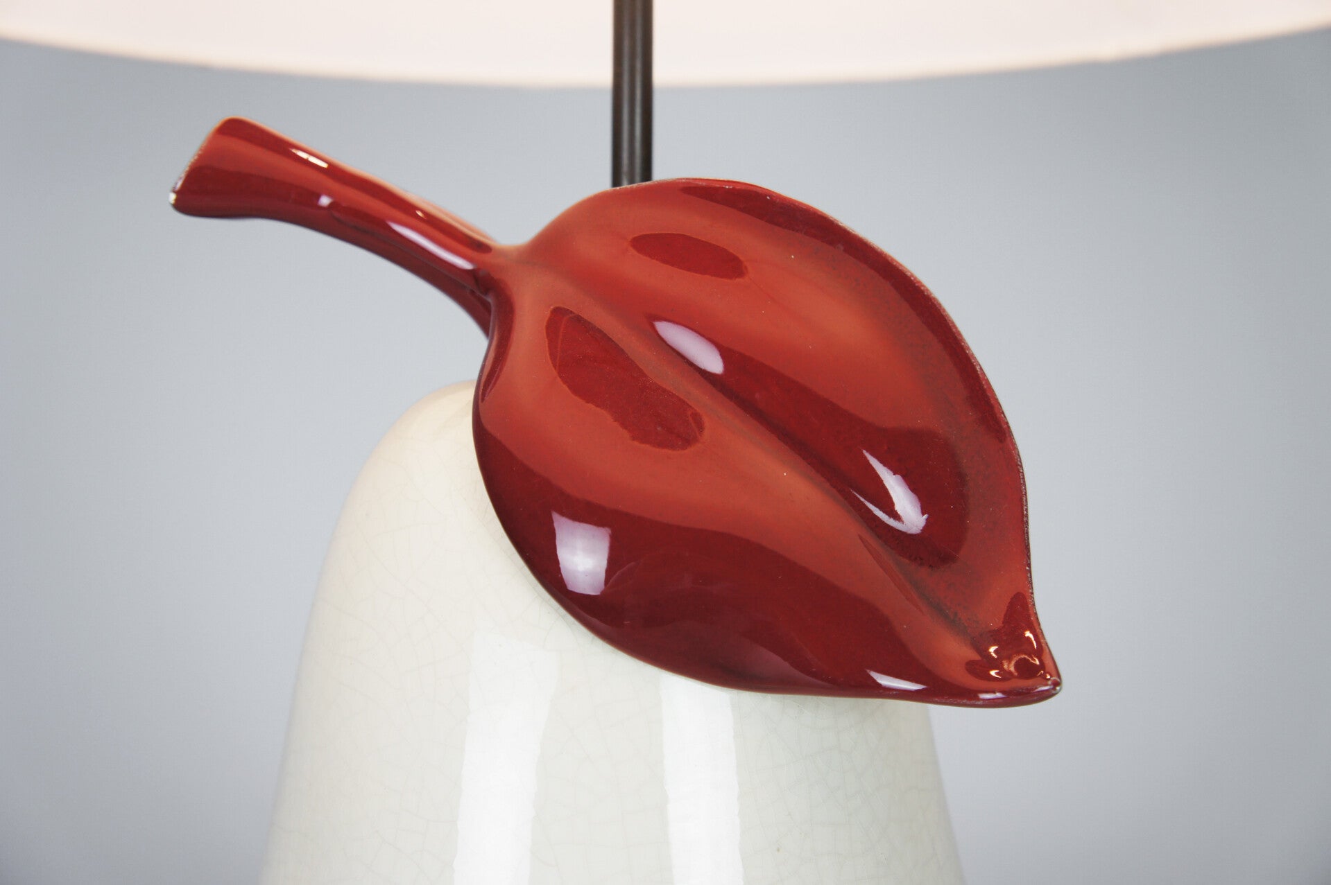 The pear is in a white glaze, with a red glossy leaf and stem.