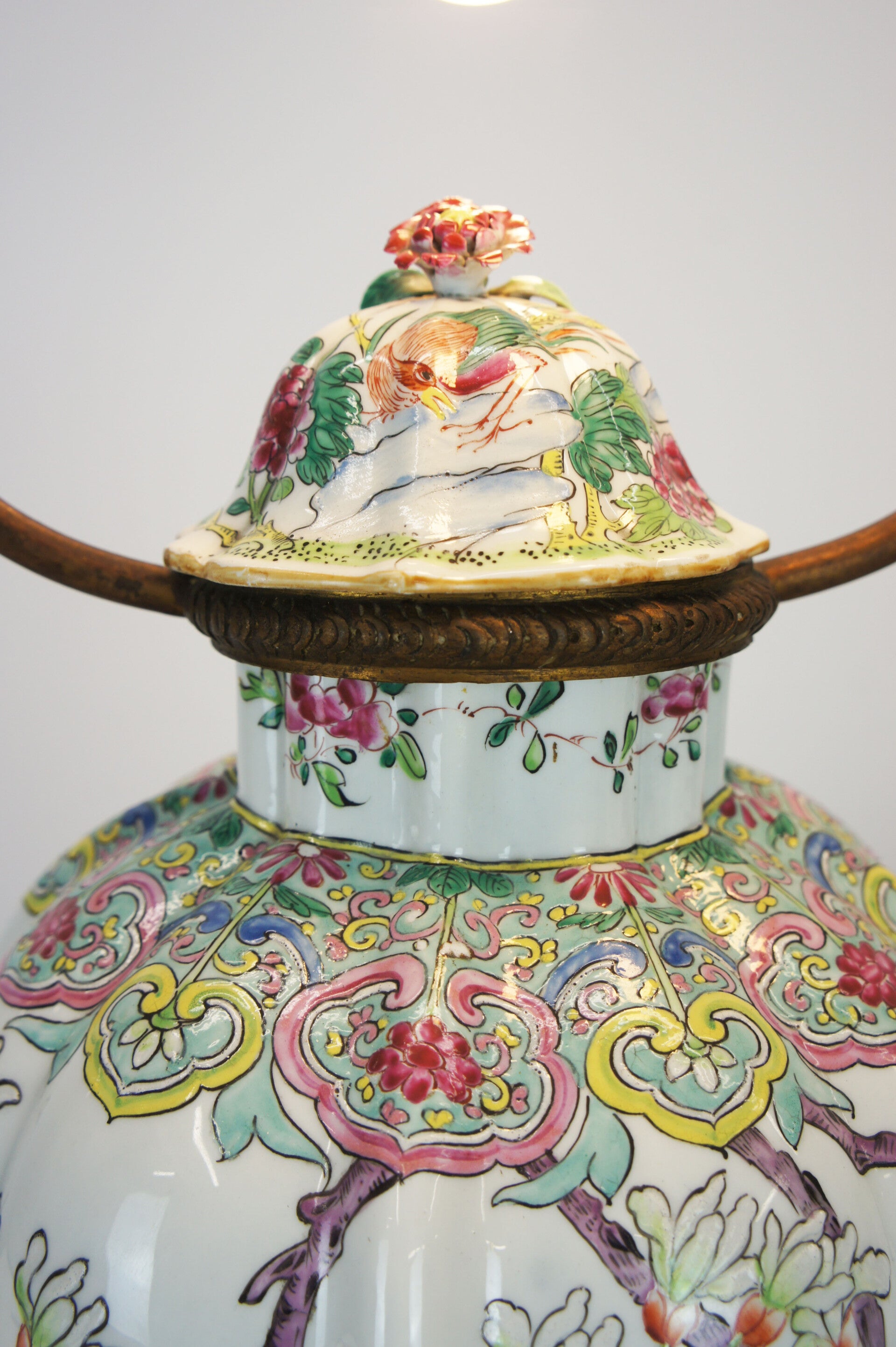 The lamp’s base is shaped like a vase and is mounted on an ornate bronze stand. The white fabric lampshade adds a soft, warm glow that complements the vibrant colors of the porcelain. A beautiful floral finial adorns the top lid of the lamp, adding a refined finishing touch.