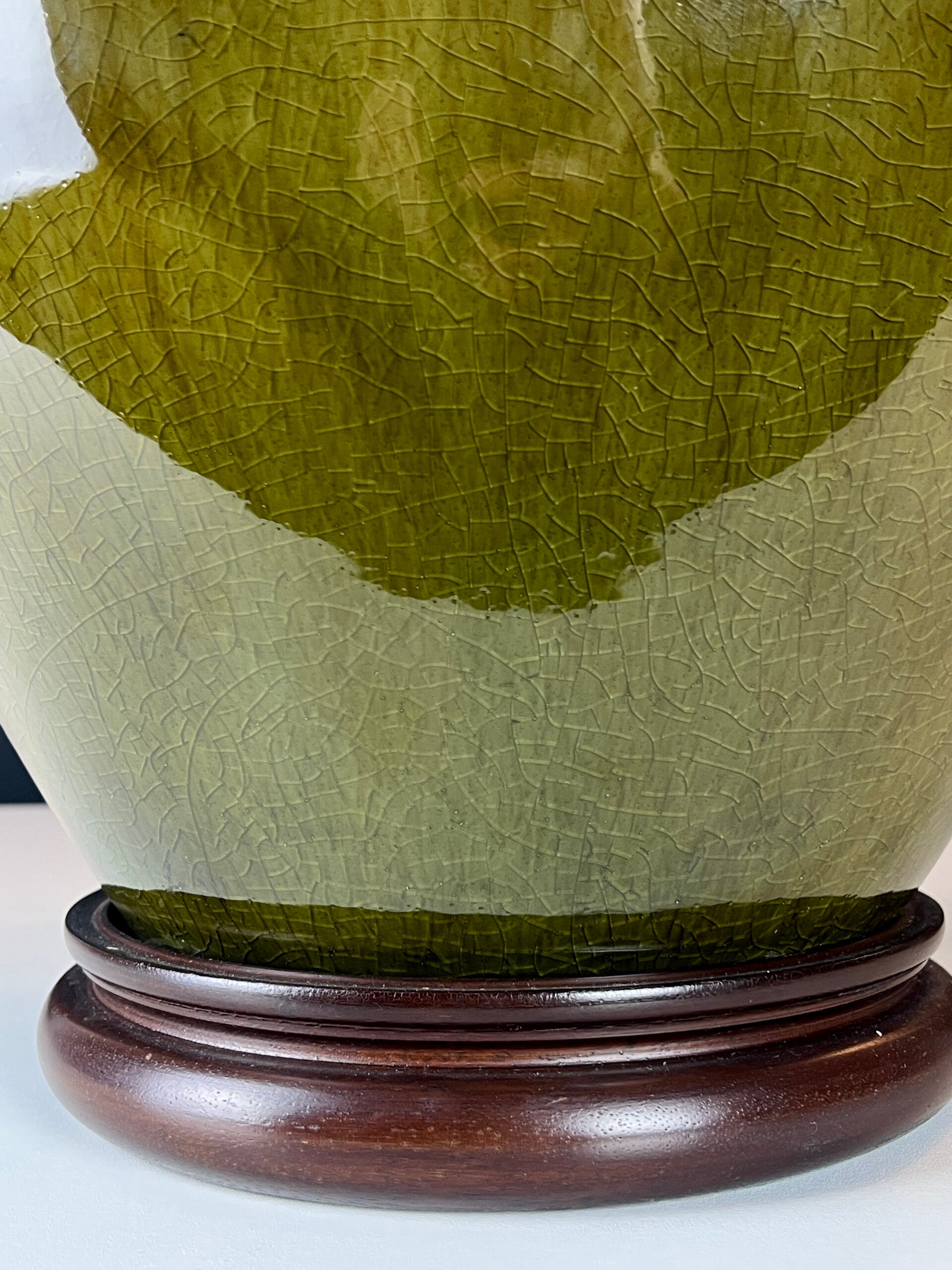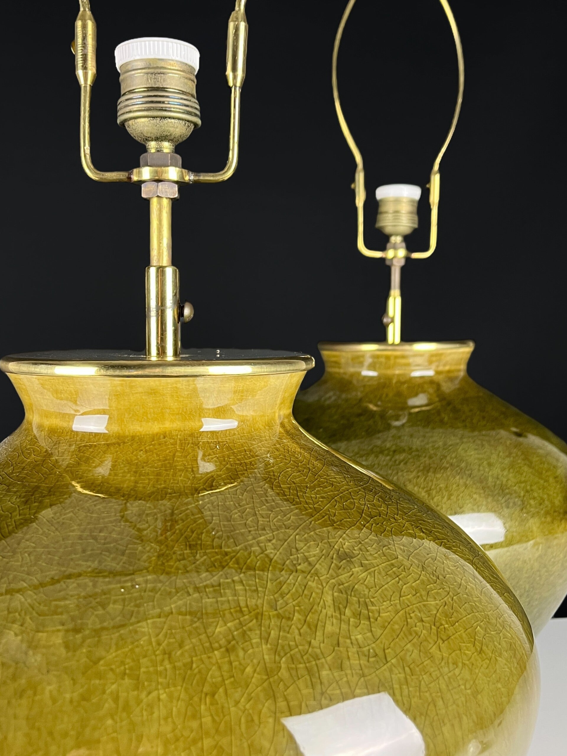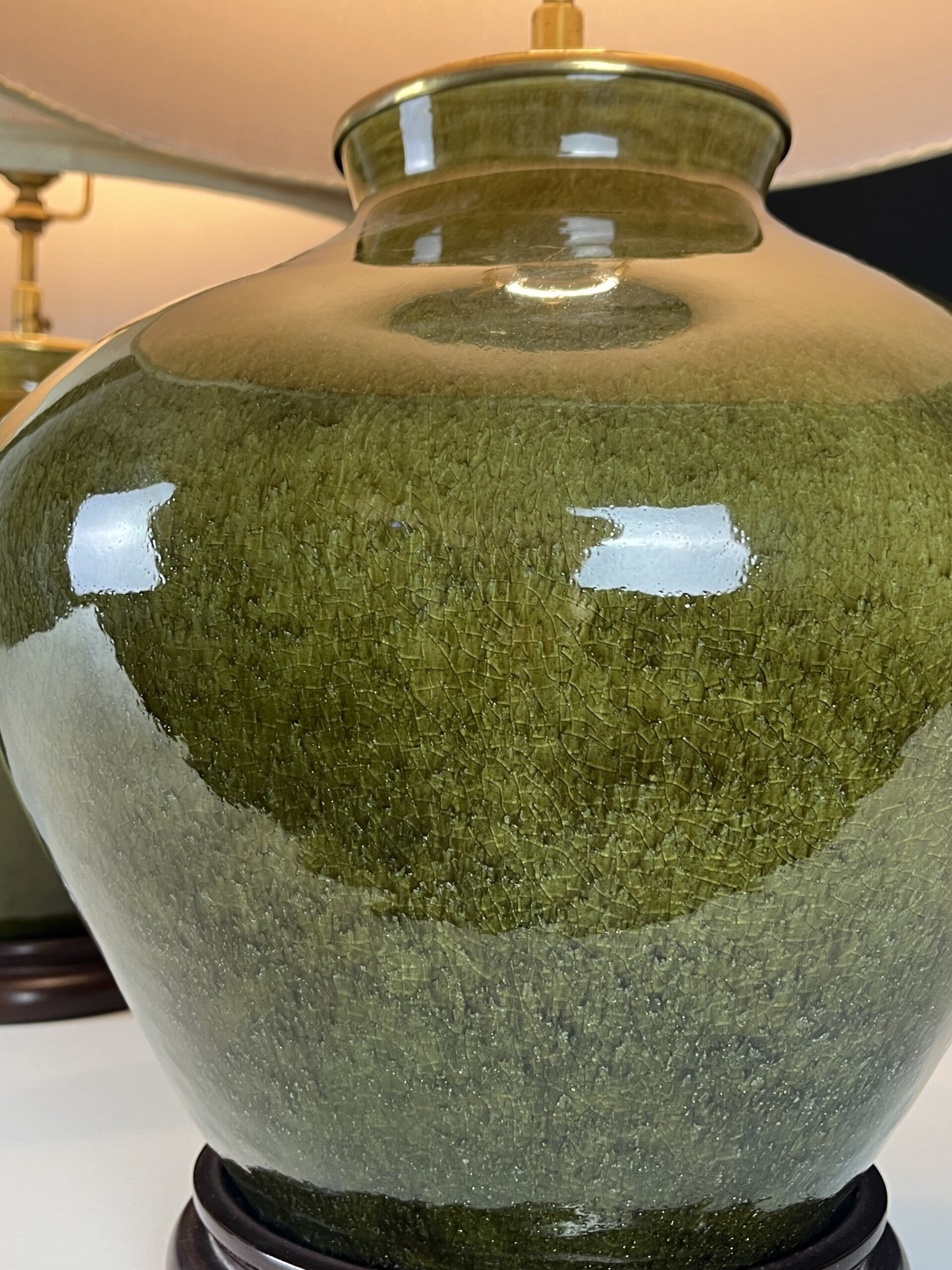 A pair of ceramic table lamps in a green glaze with a beautiful crackled pattern.