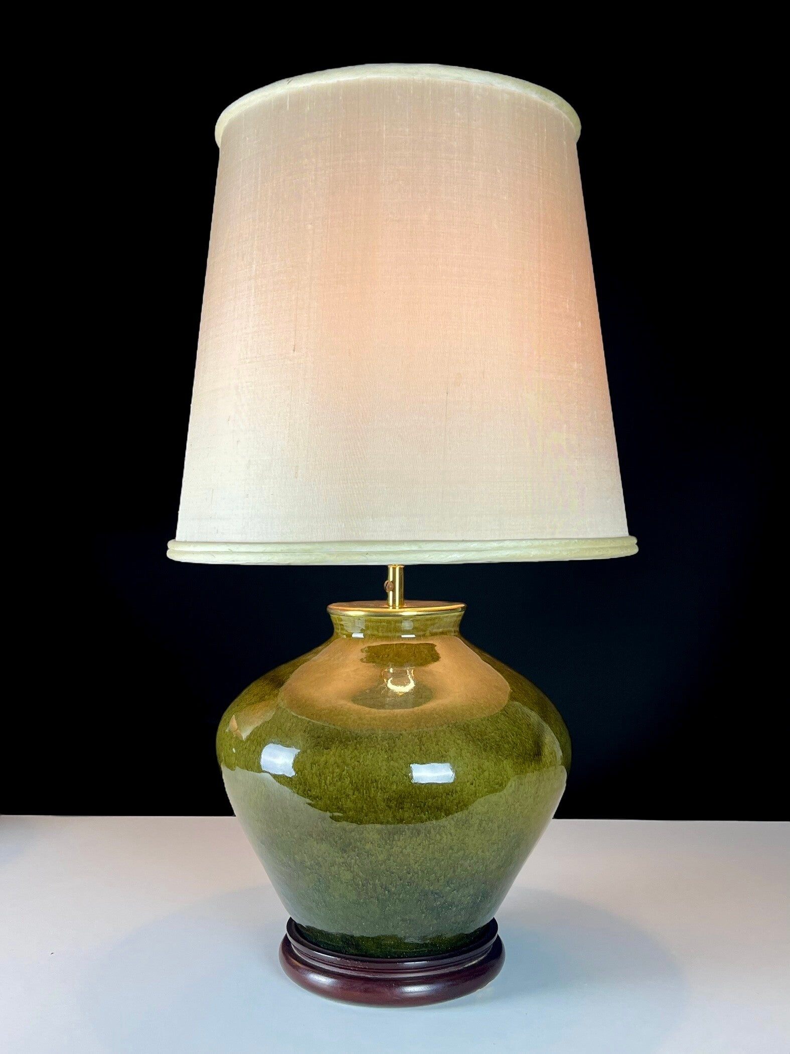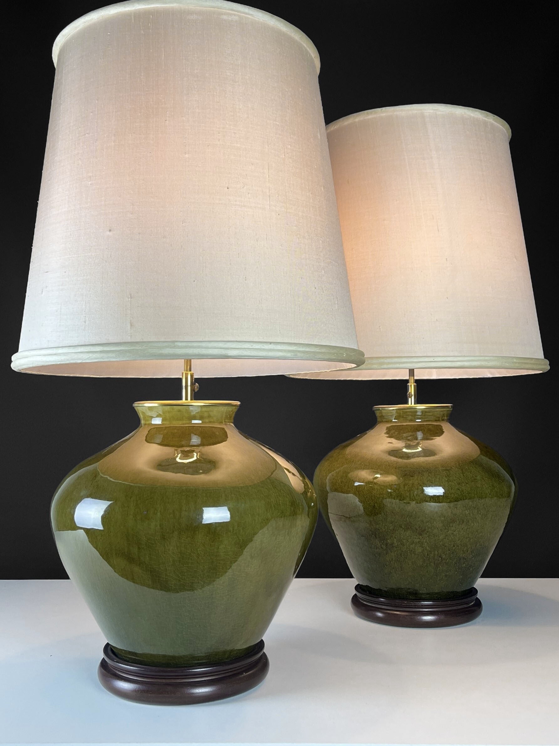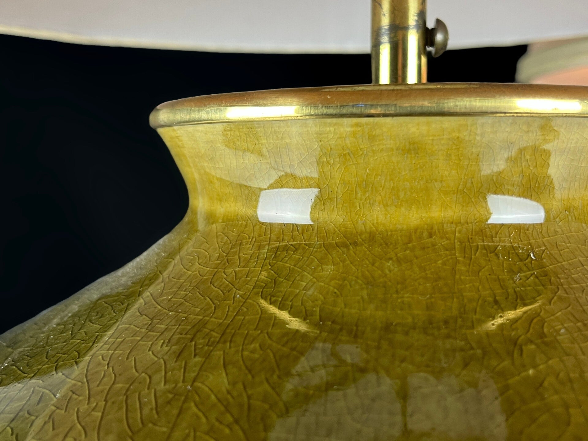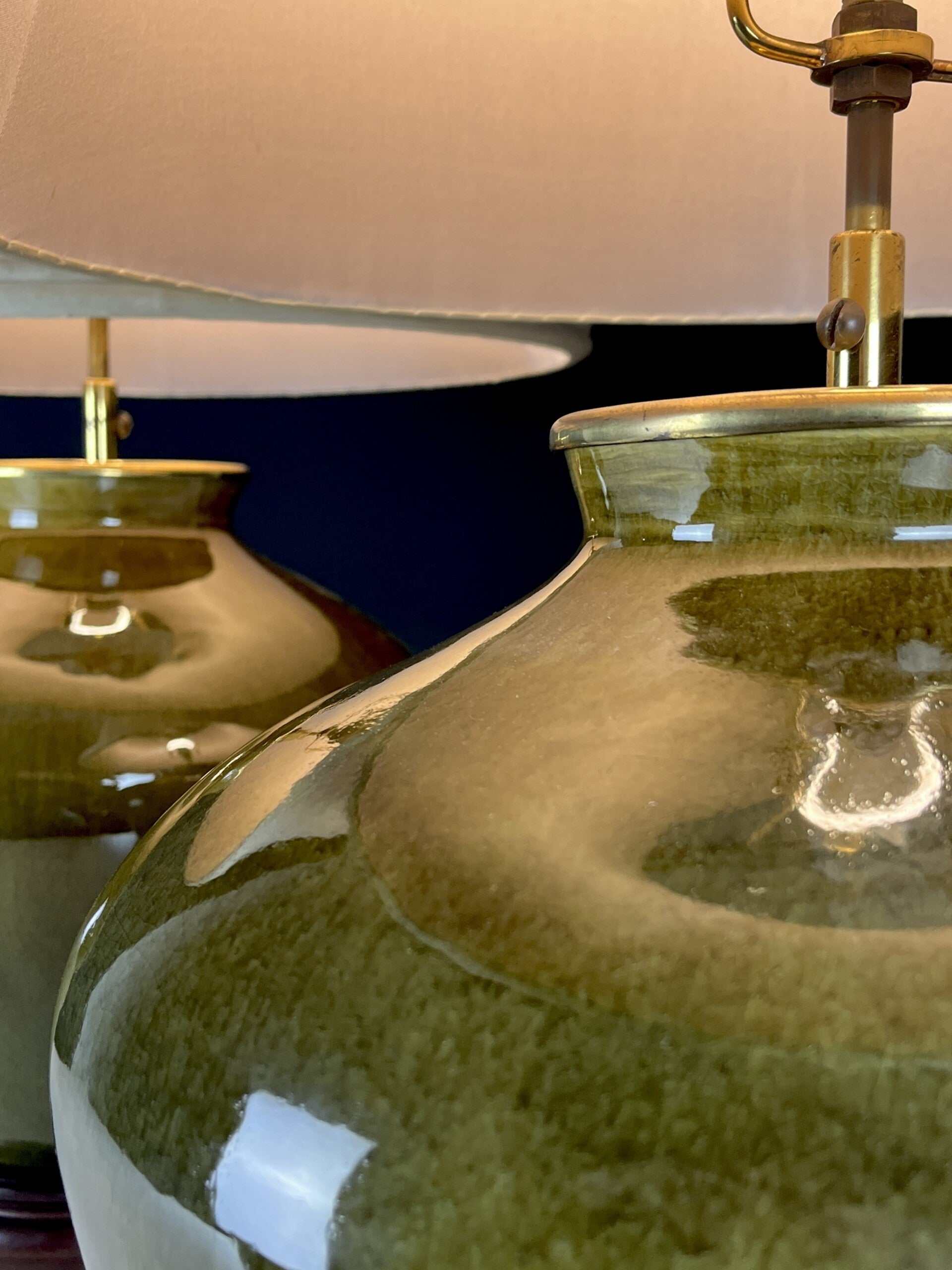 A pair of ceramic table lamps in a green glaze with a beautiful crackled pattern.
