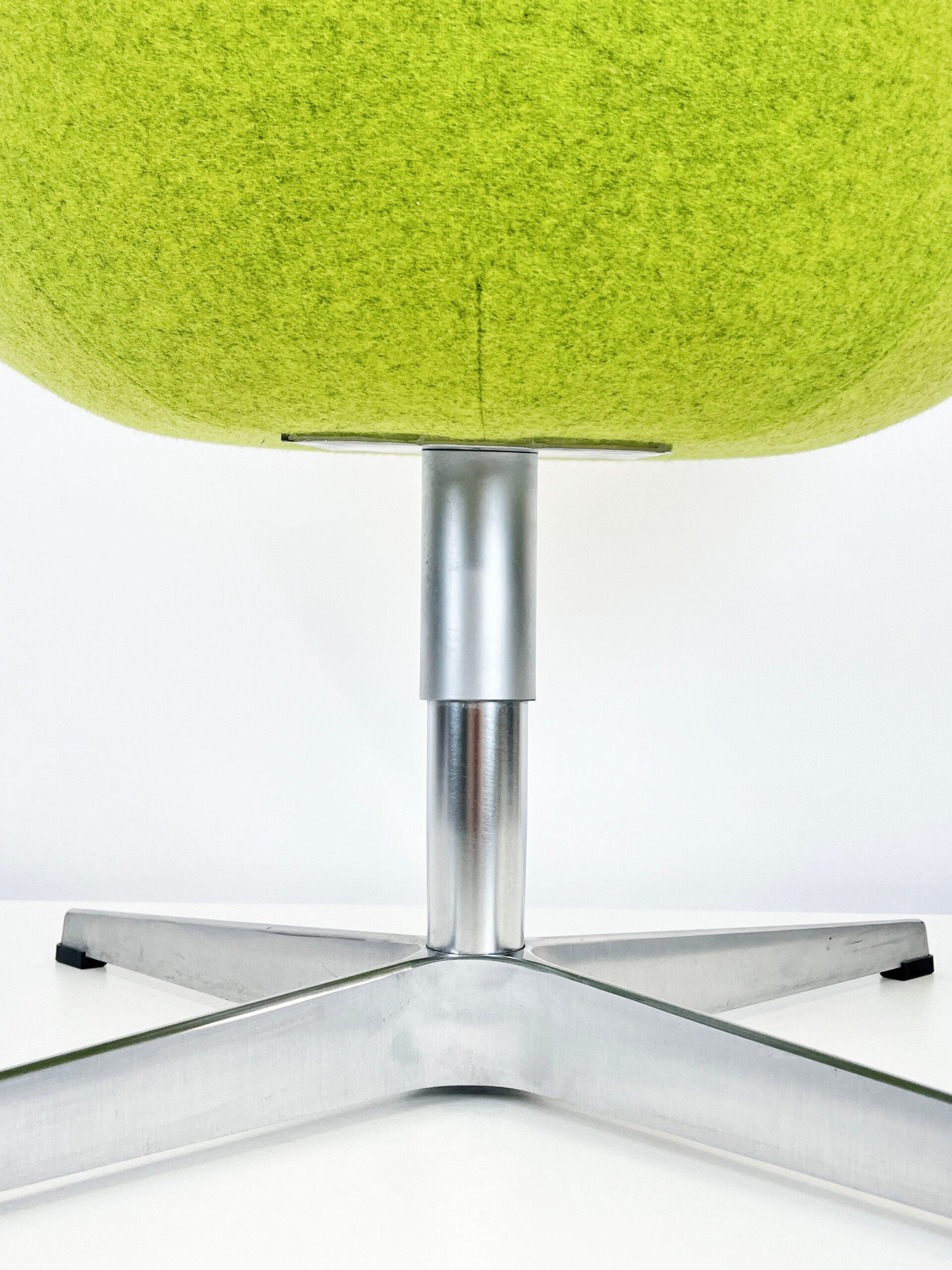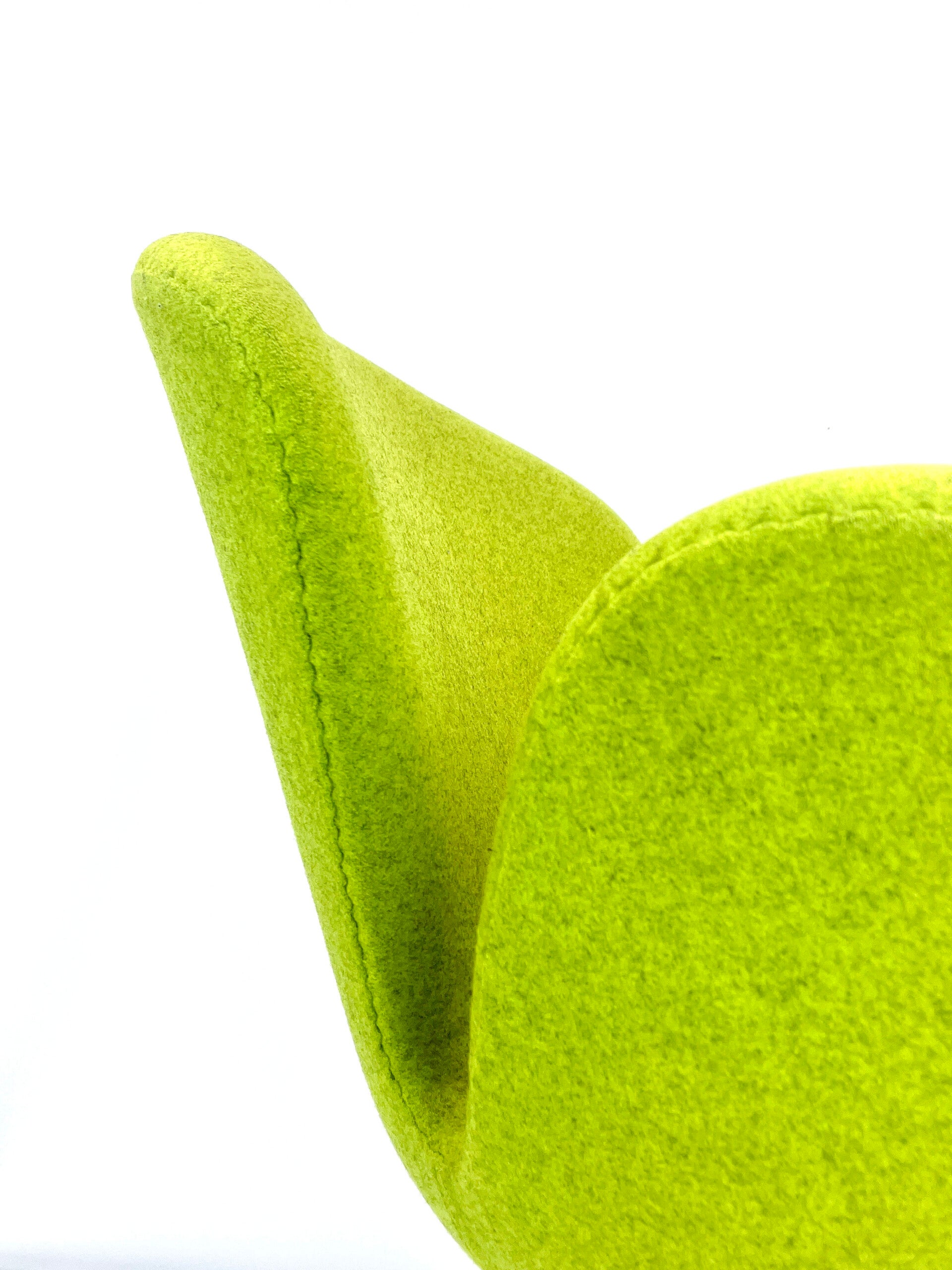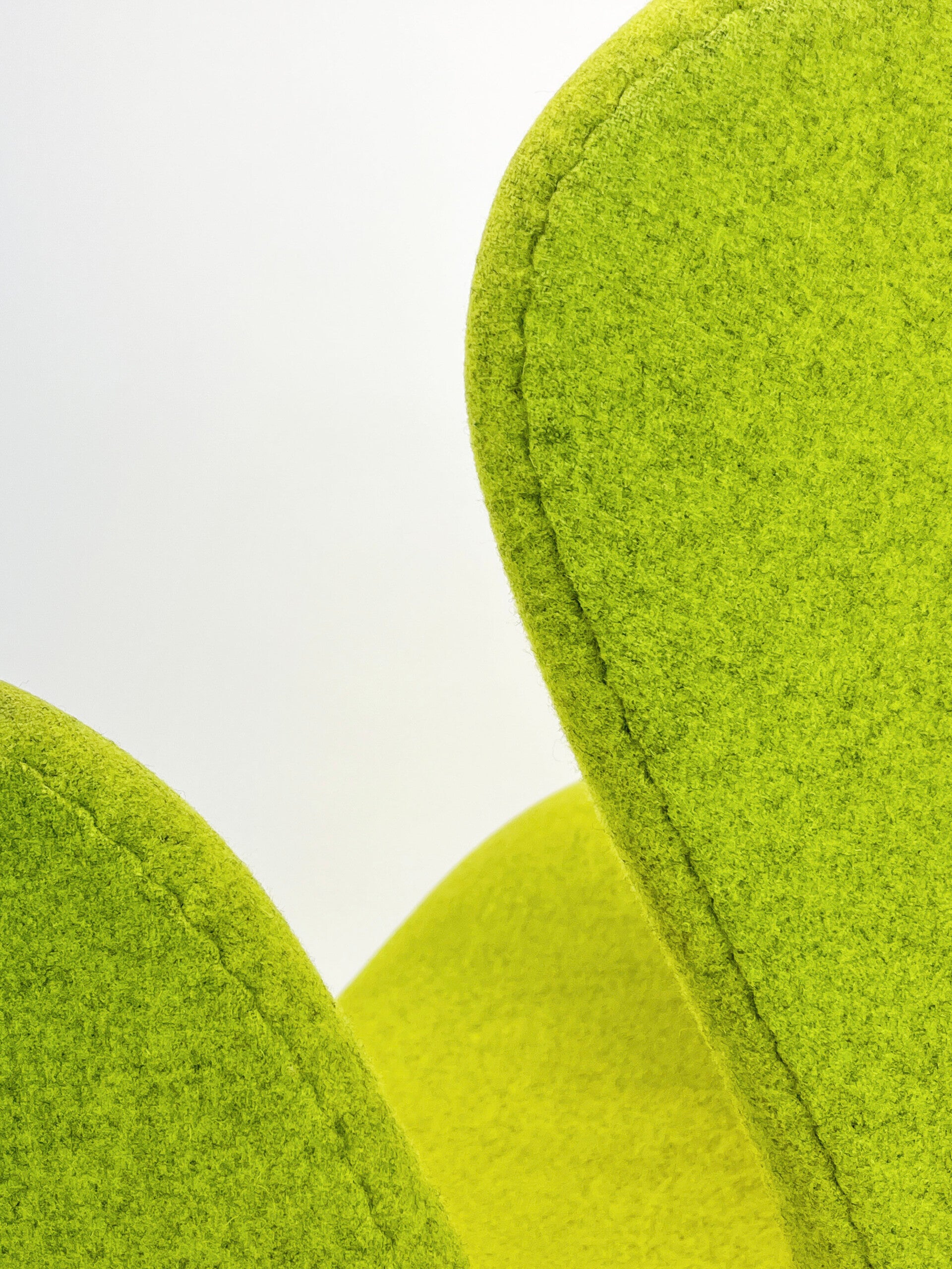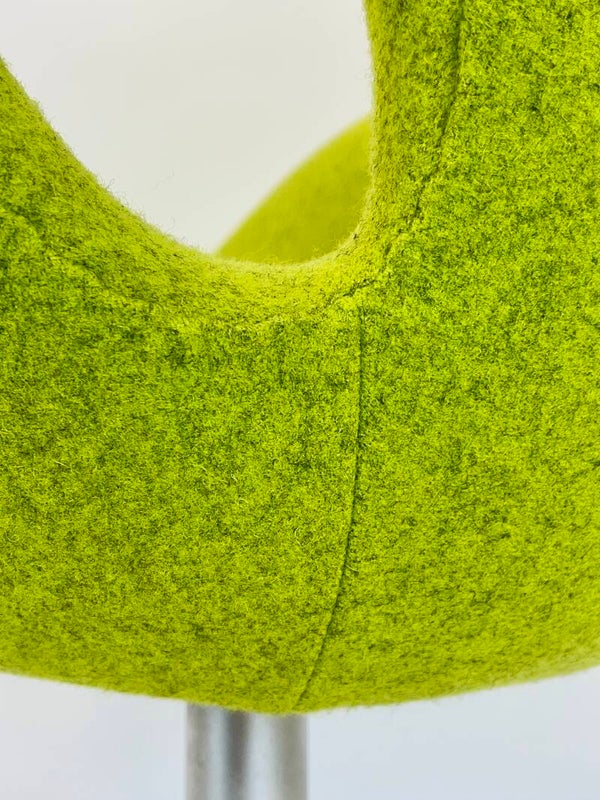 An iconic Danish design piece: the Swan Chair, designed in 1958 by Arne Jacobsen for the Royal Hotel in Copenhagen, remains a timeless masterpiece to this day. This particular set of chairs was produced in 2007 by Fritz Hansen and is upholstered in the high-quality Kvadrat Divina Melange fabric (color 931 – lime green), a warm and elegant 100% wool upholstery that creates a modern, vibrant look.