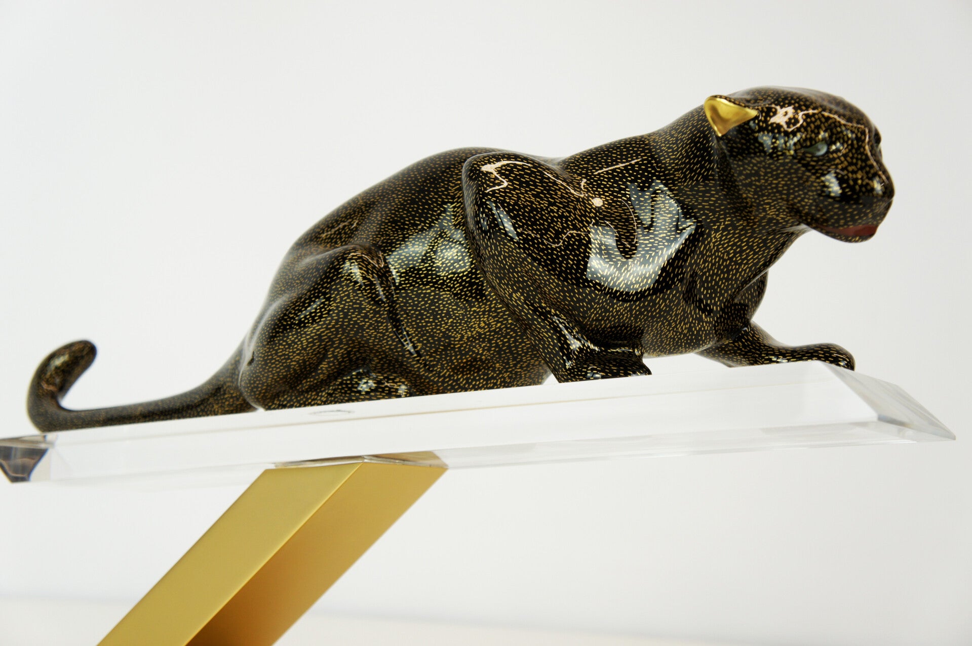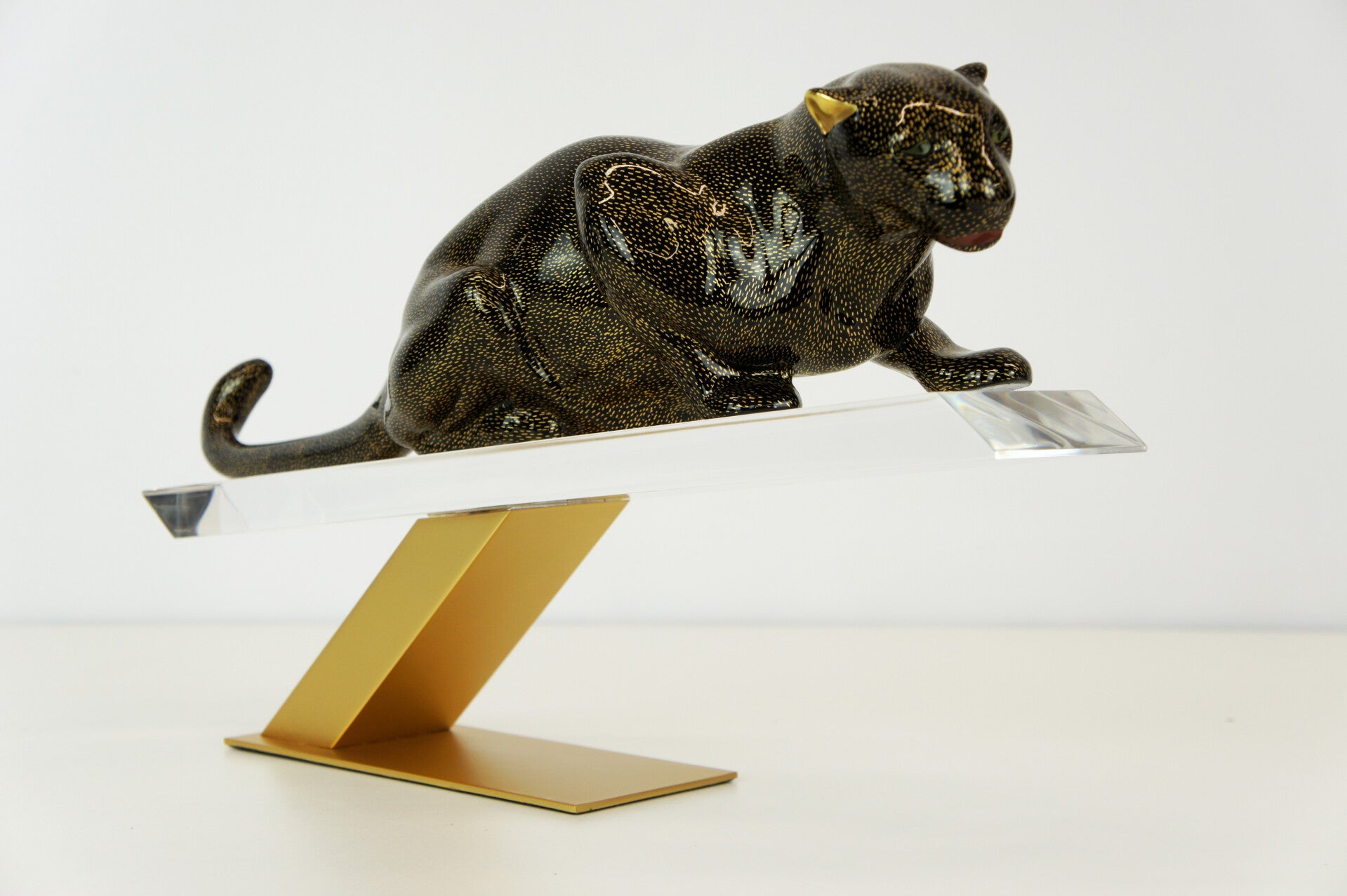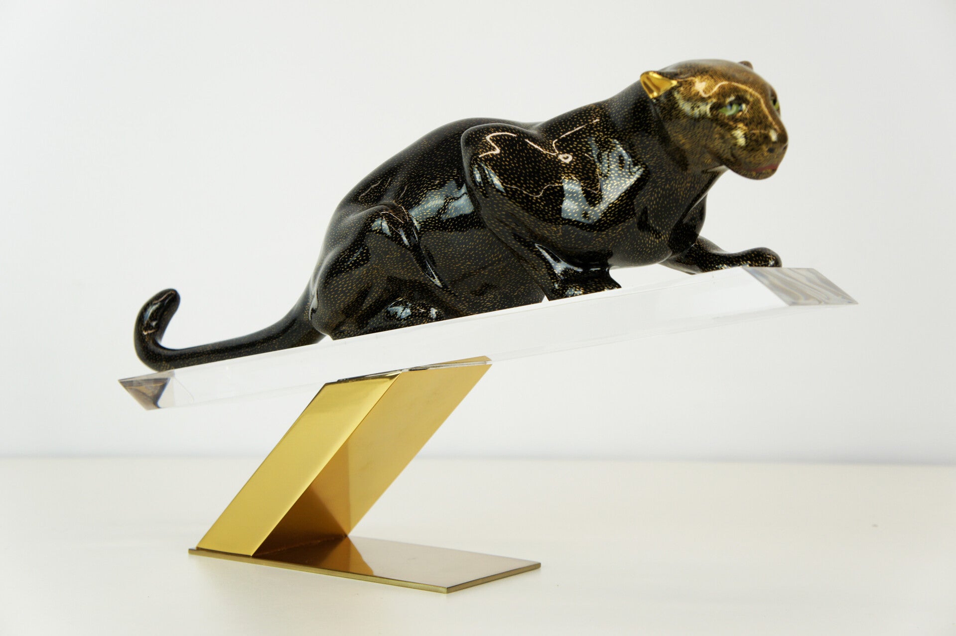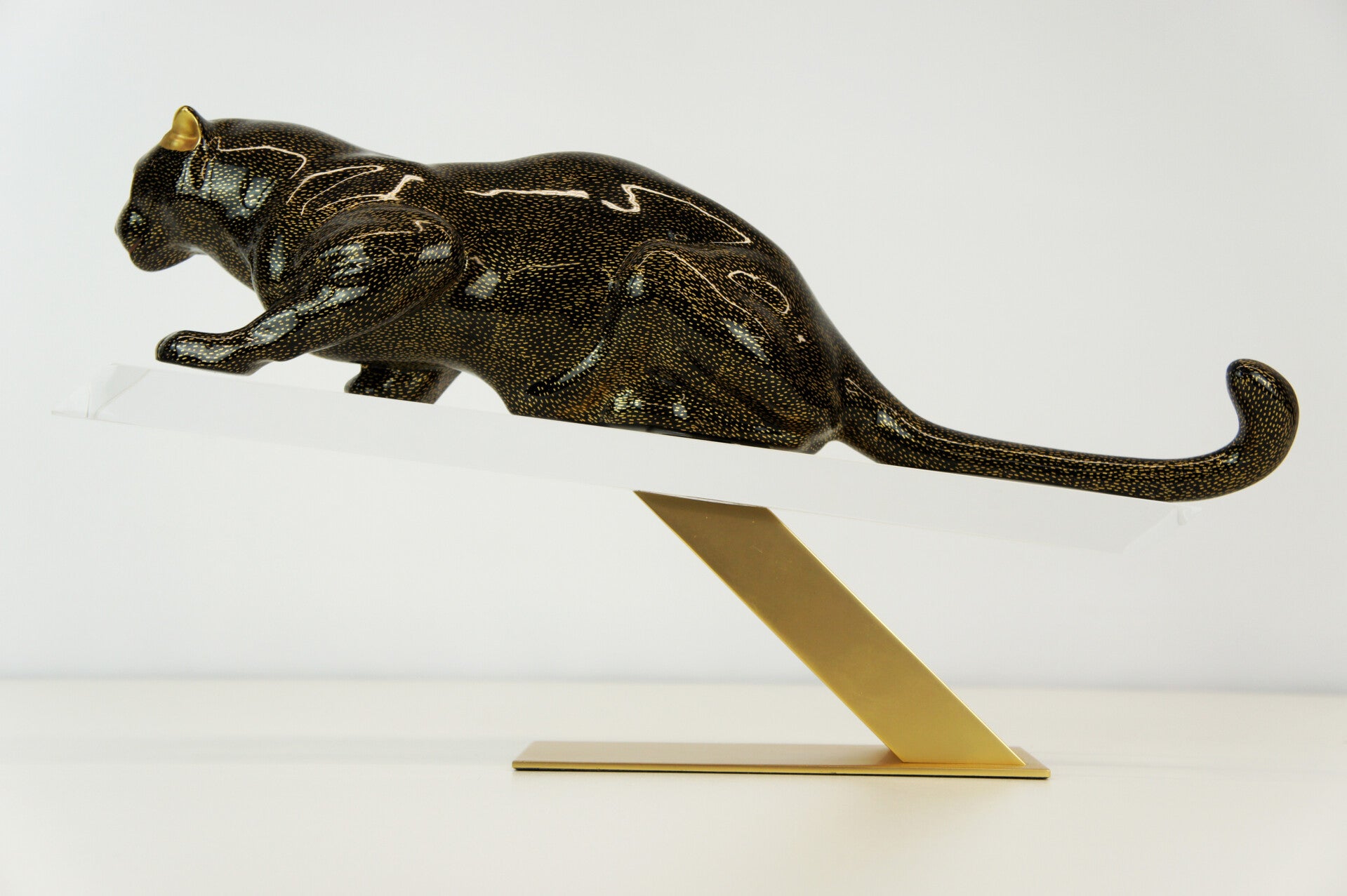 The panther has a black body with a gold-flecked pattern and is mounted on a brass stand.
