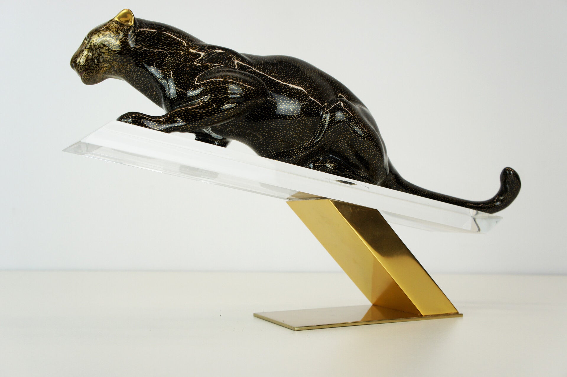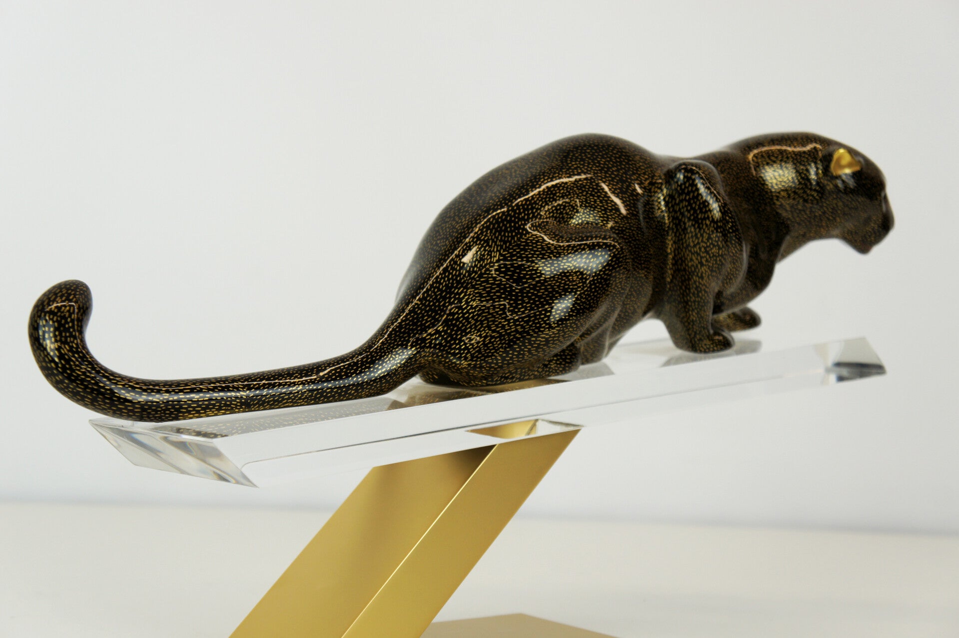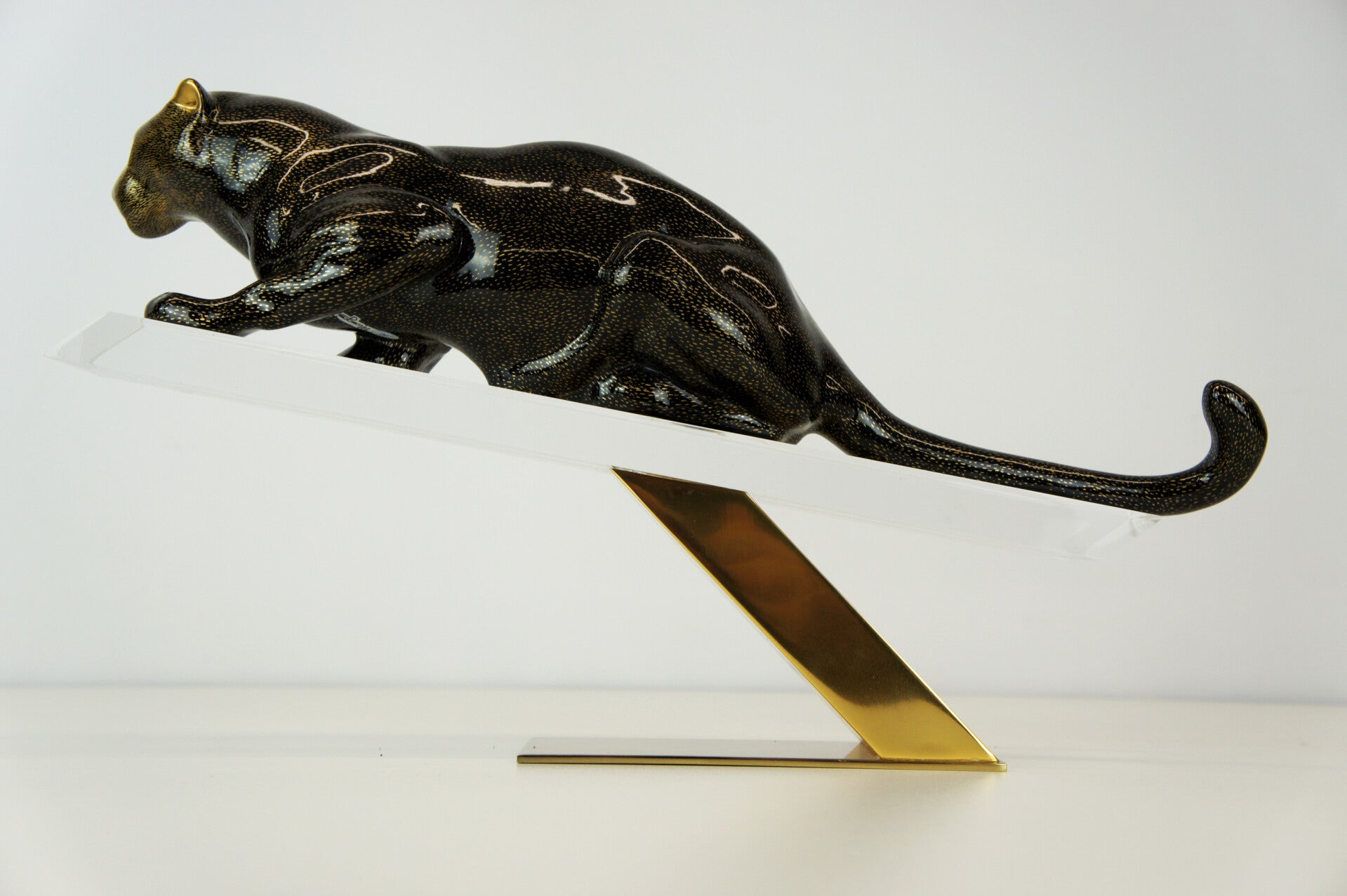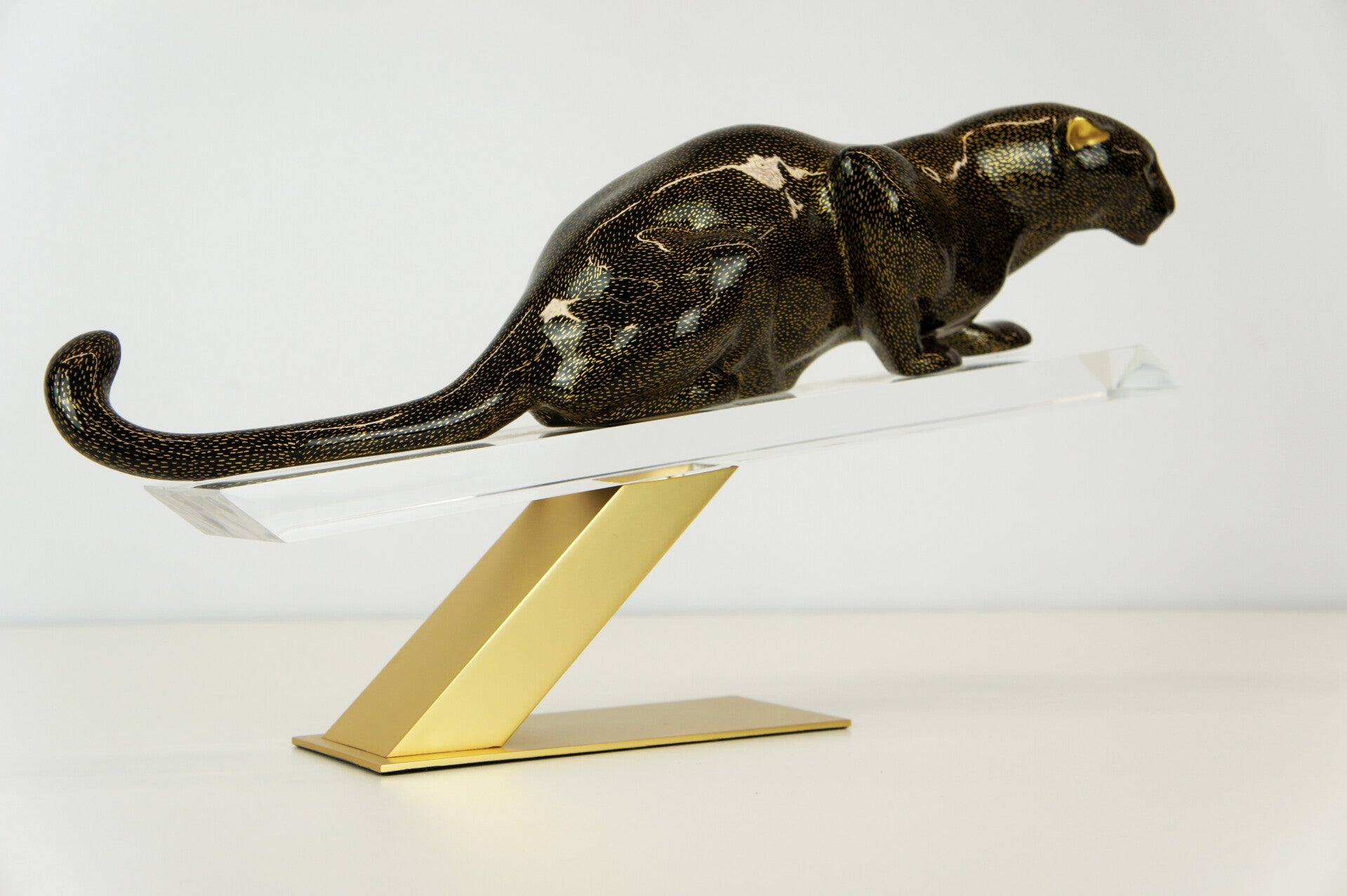The panther has a black body with a gold-flecked pattern and is mounted on a brass stand.