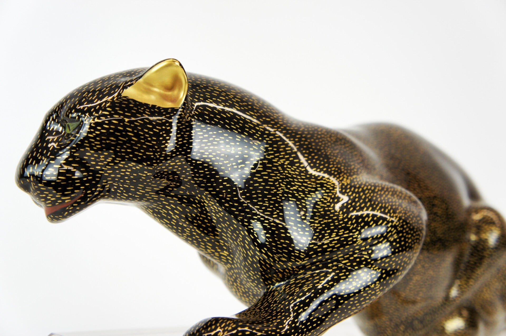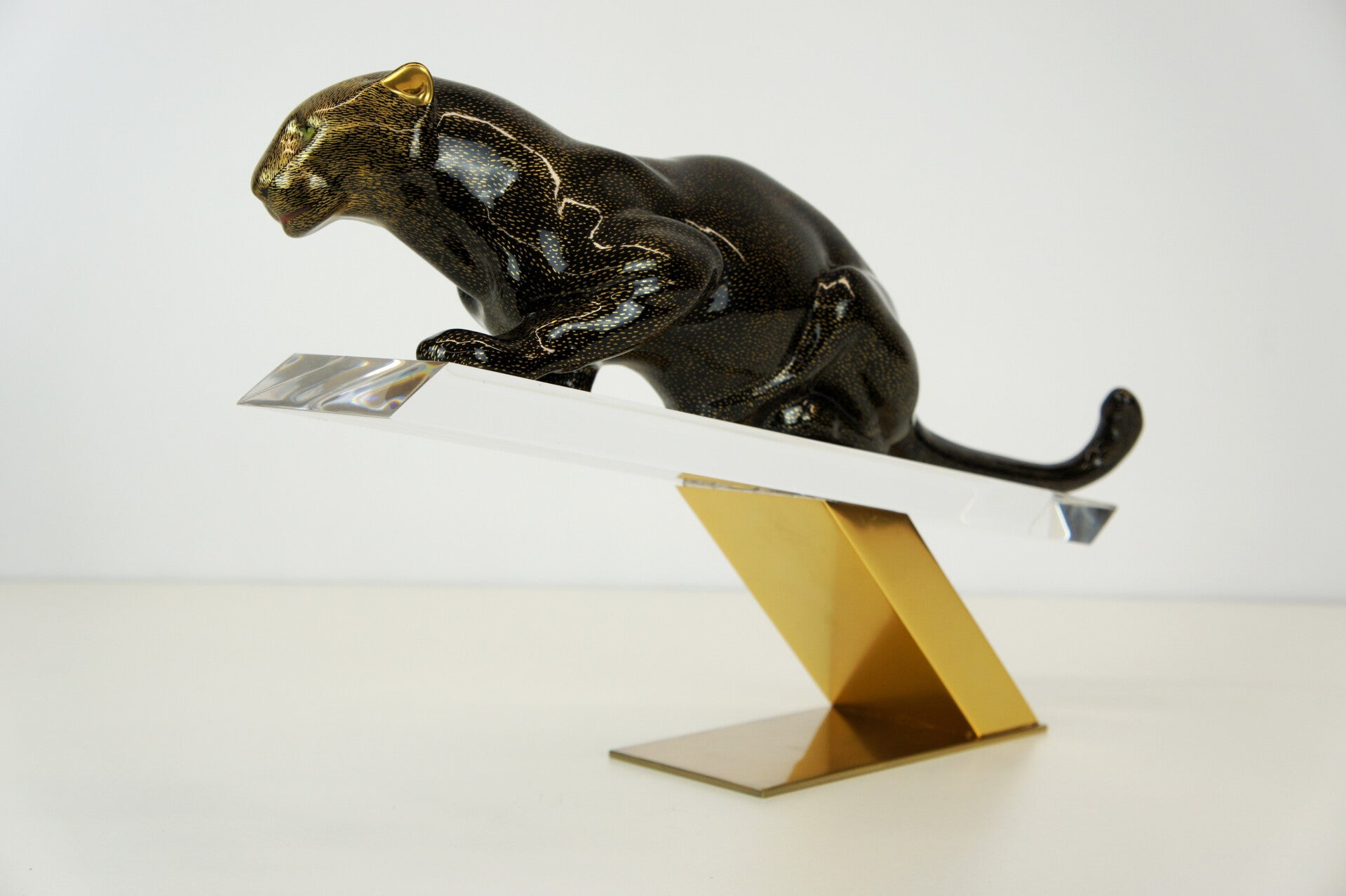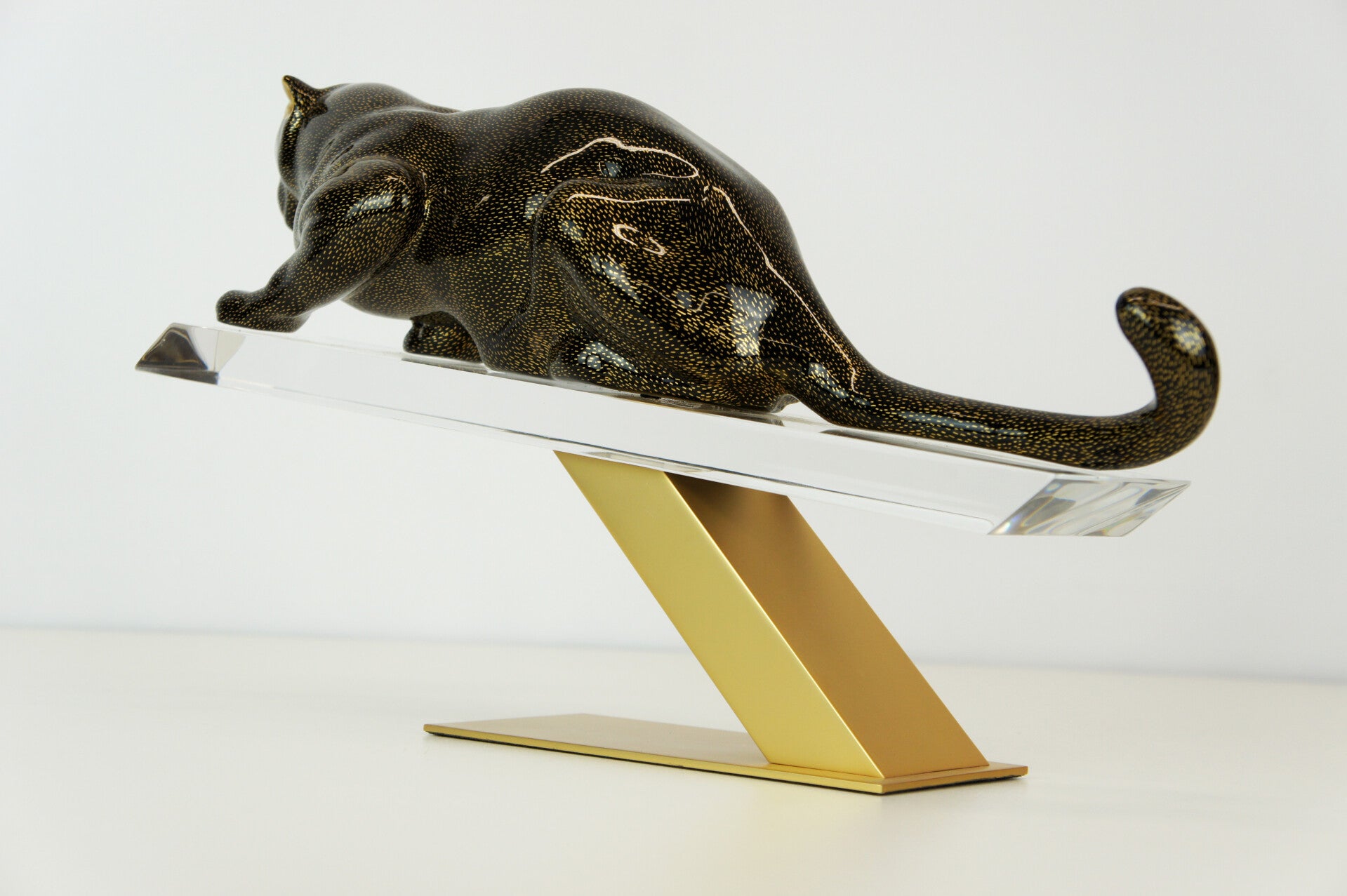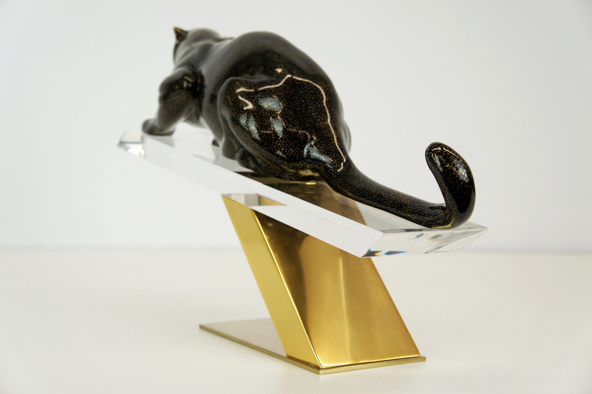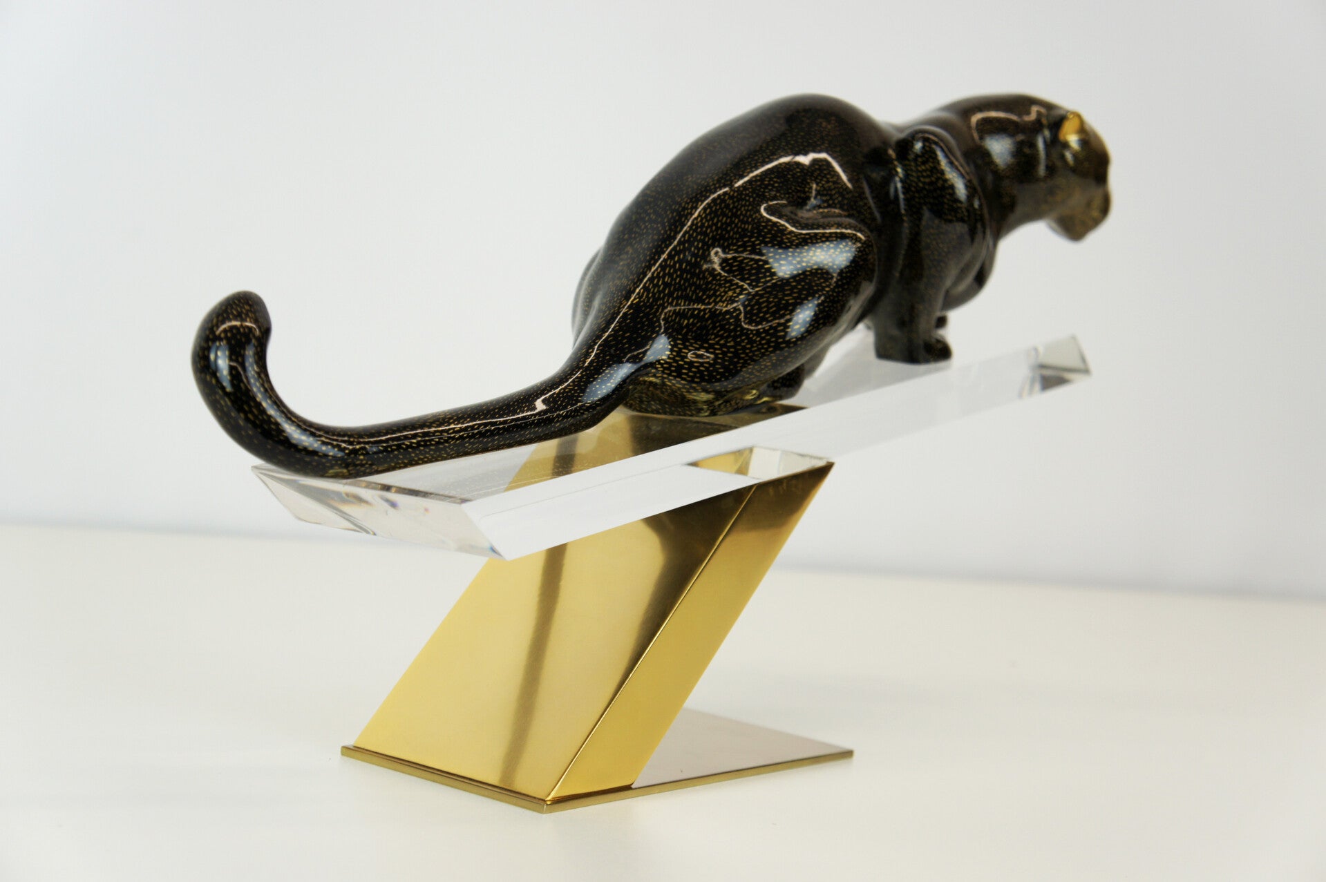 The panther has a black body with a gold-flecked pattern and is mounted on a brass stand.