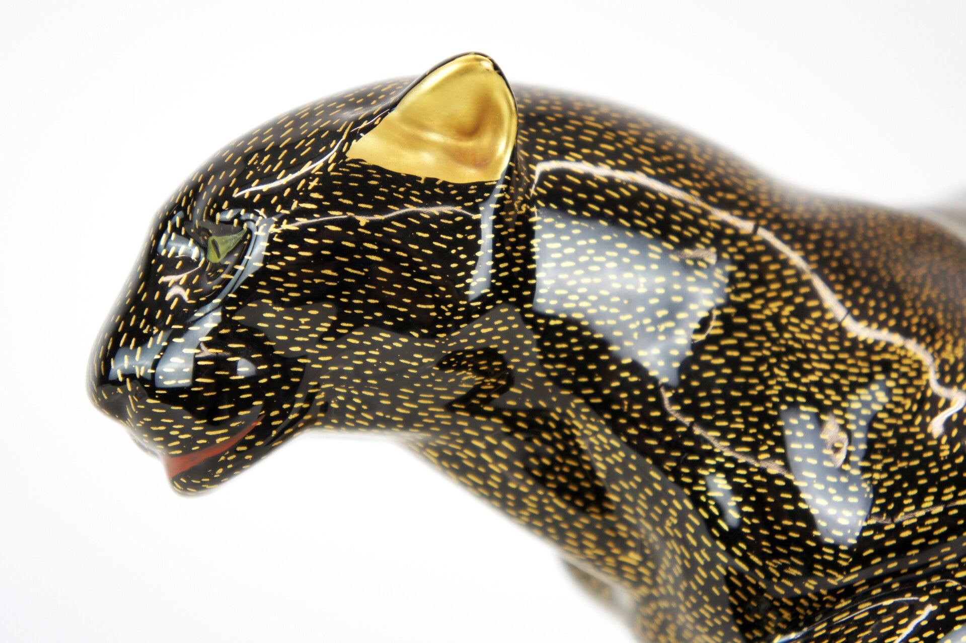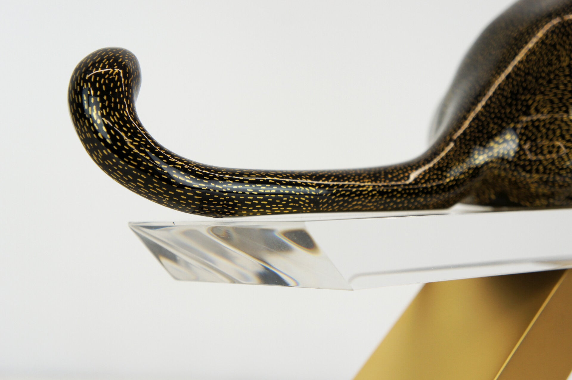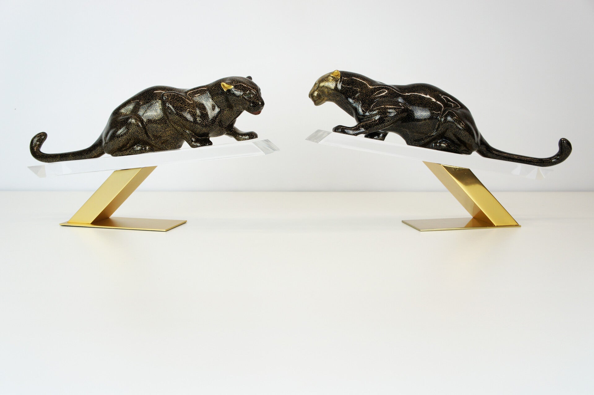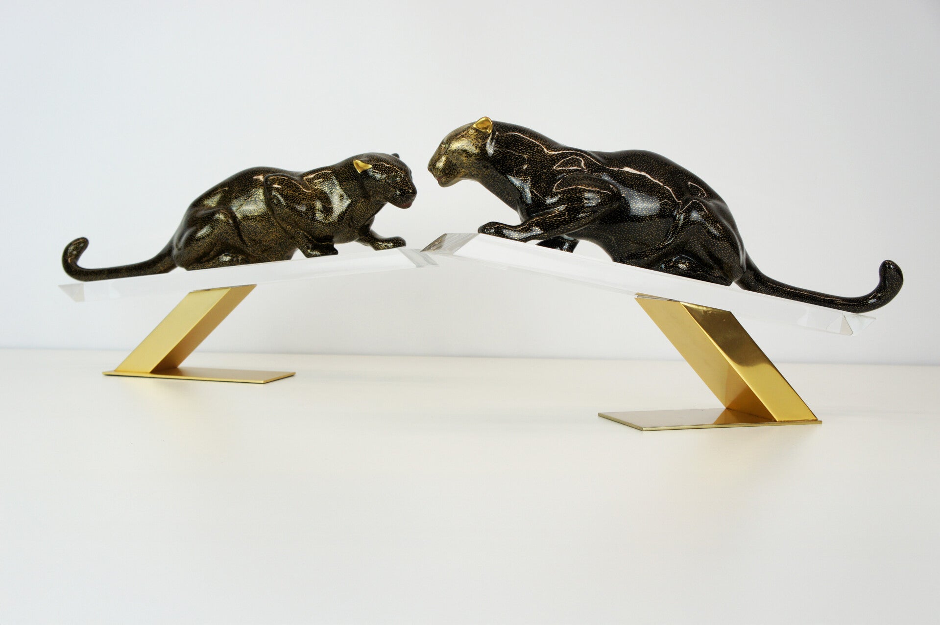 The panther has a black body with a gold-flecked pattern and is mounted on a brass stand.