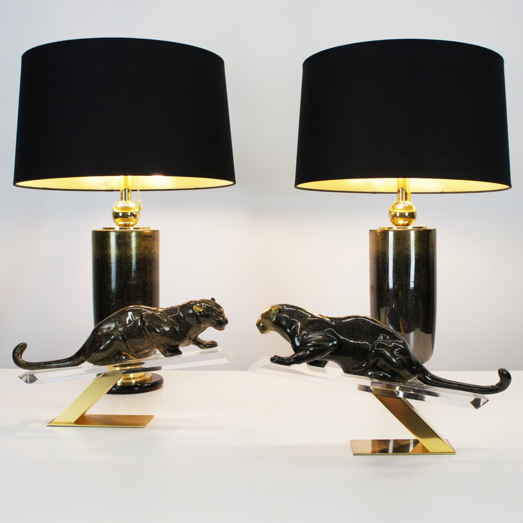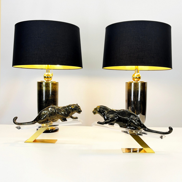 This item can be purchased in combination with a pair of table lamps from the same series, featuring an identical pattern to the panthers and a brass finish.