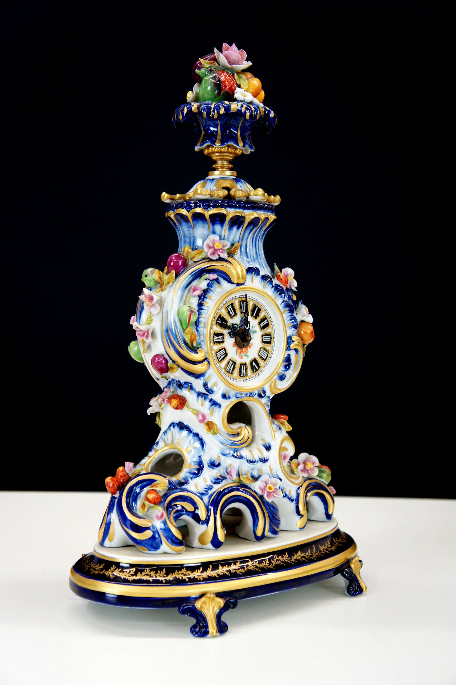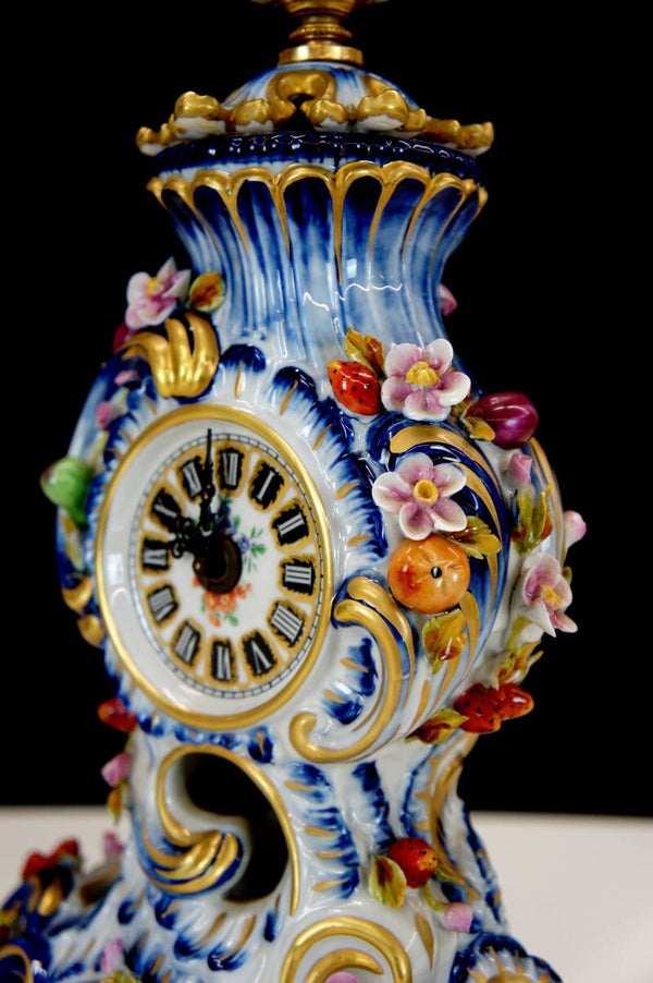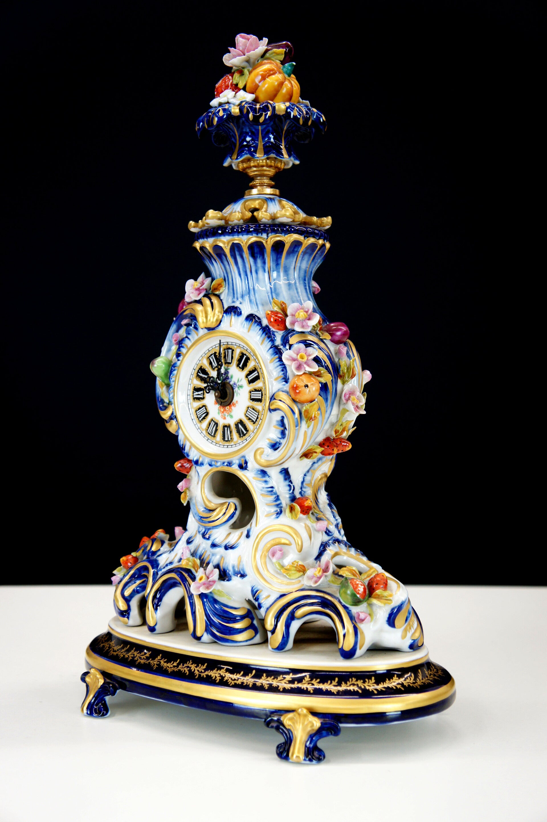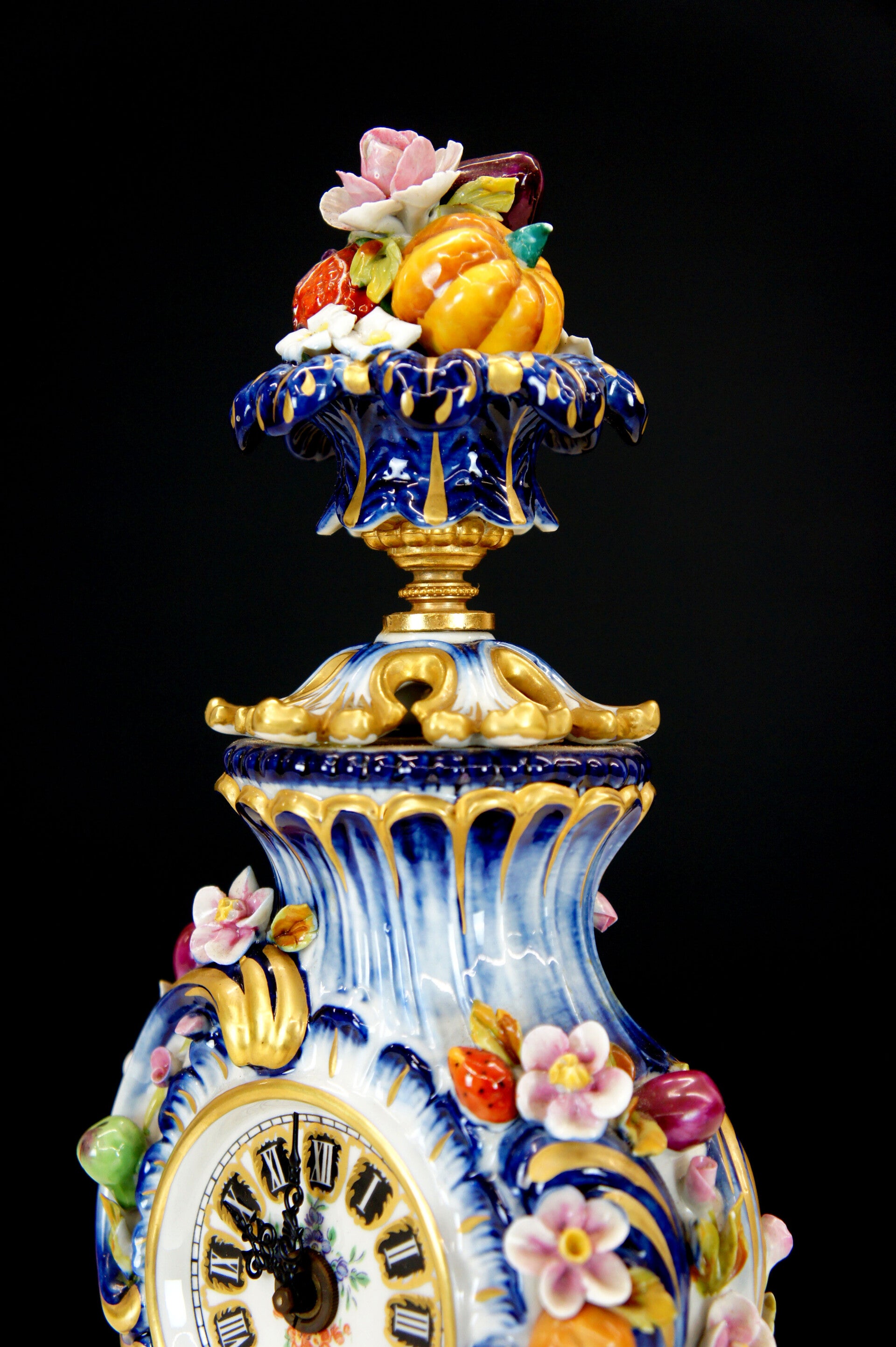 Exceptionally finely crafted and elegant clock by Giulia Mangani in Rococo style, filled with fruit and colorful flowers.