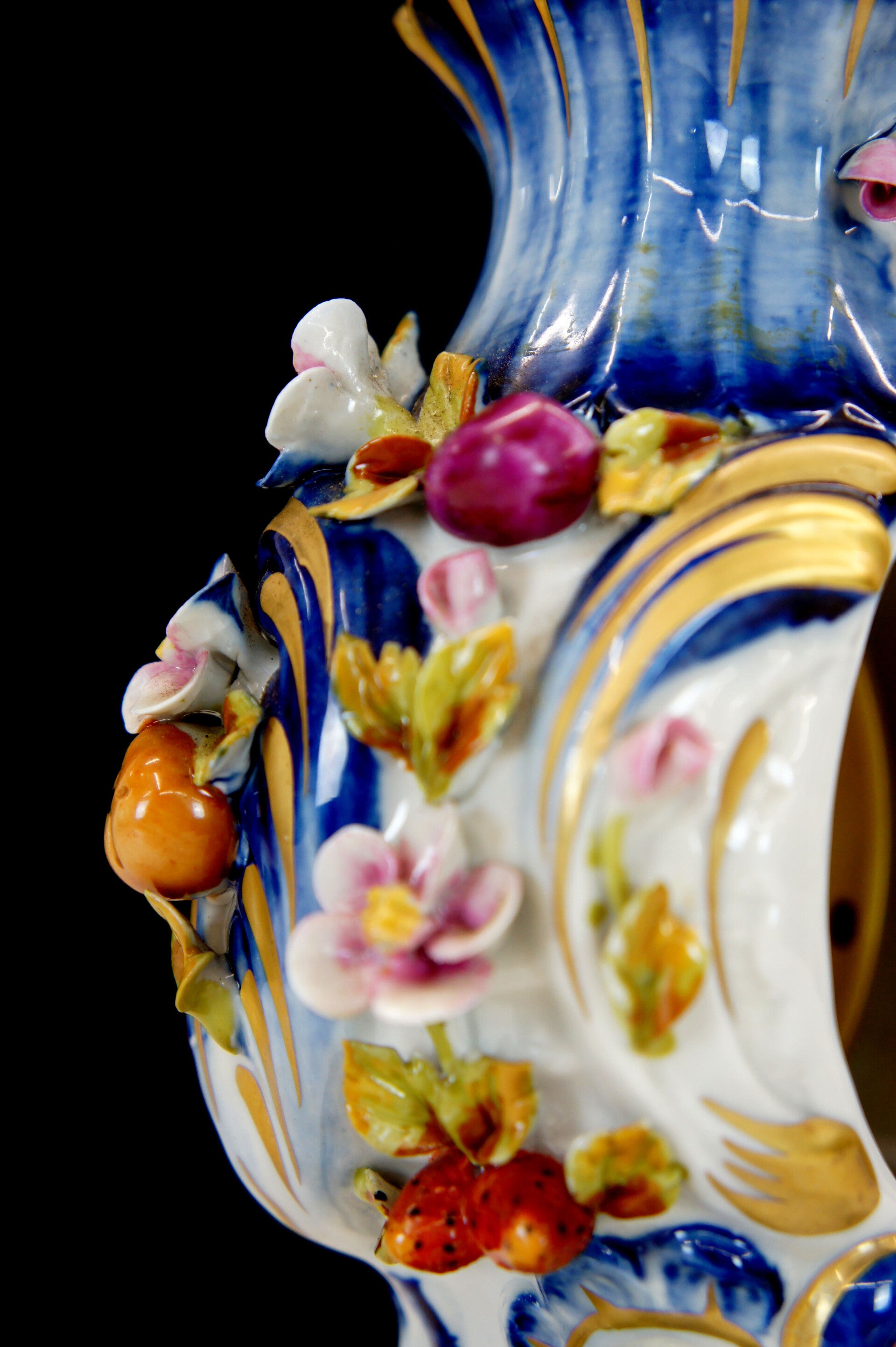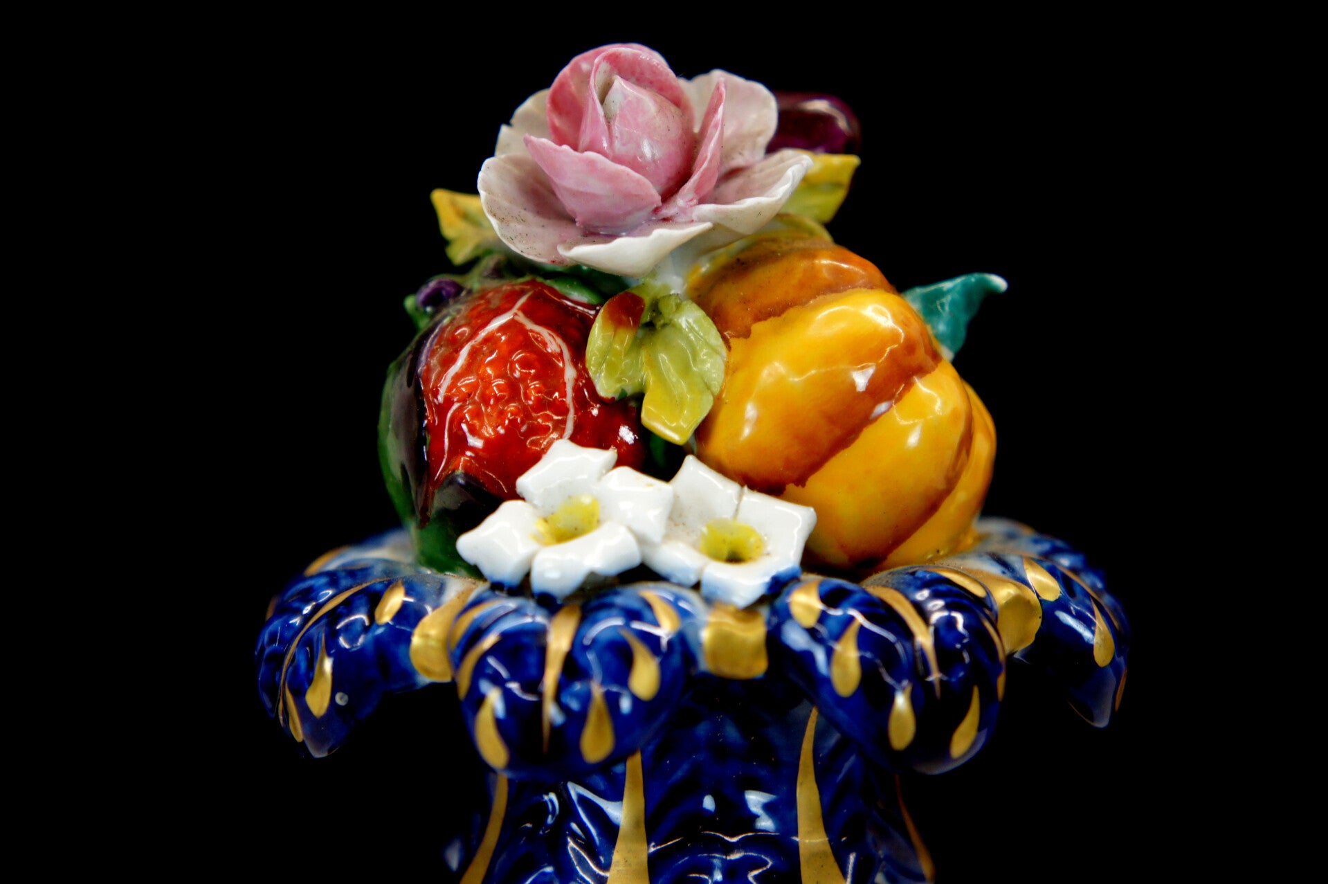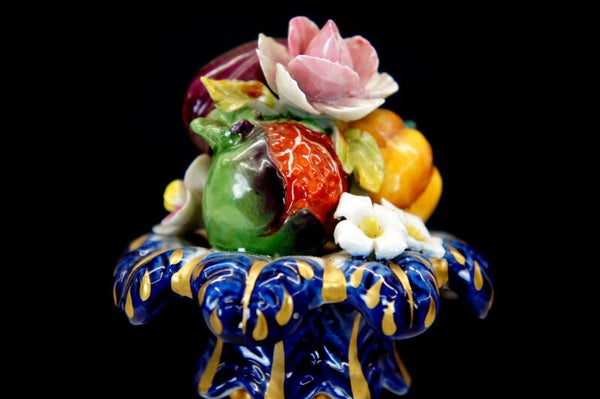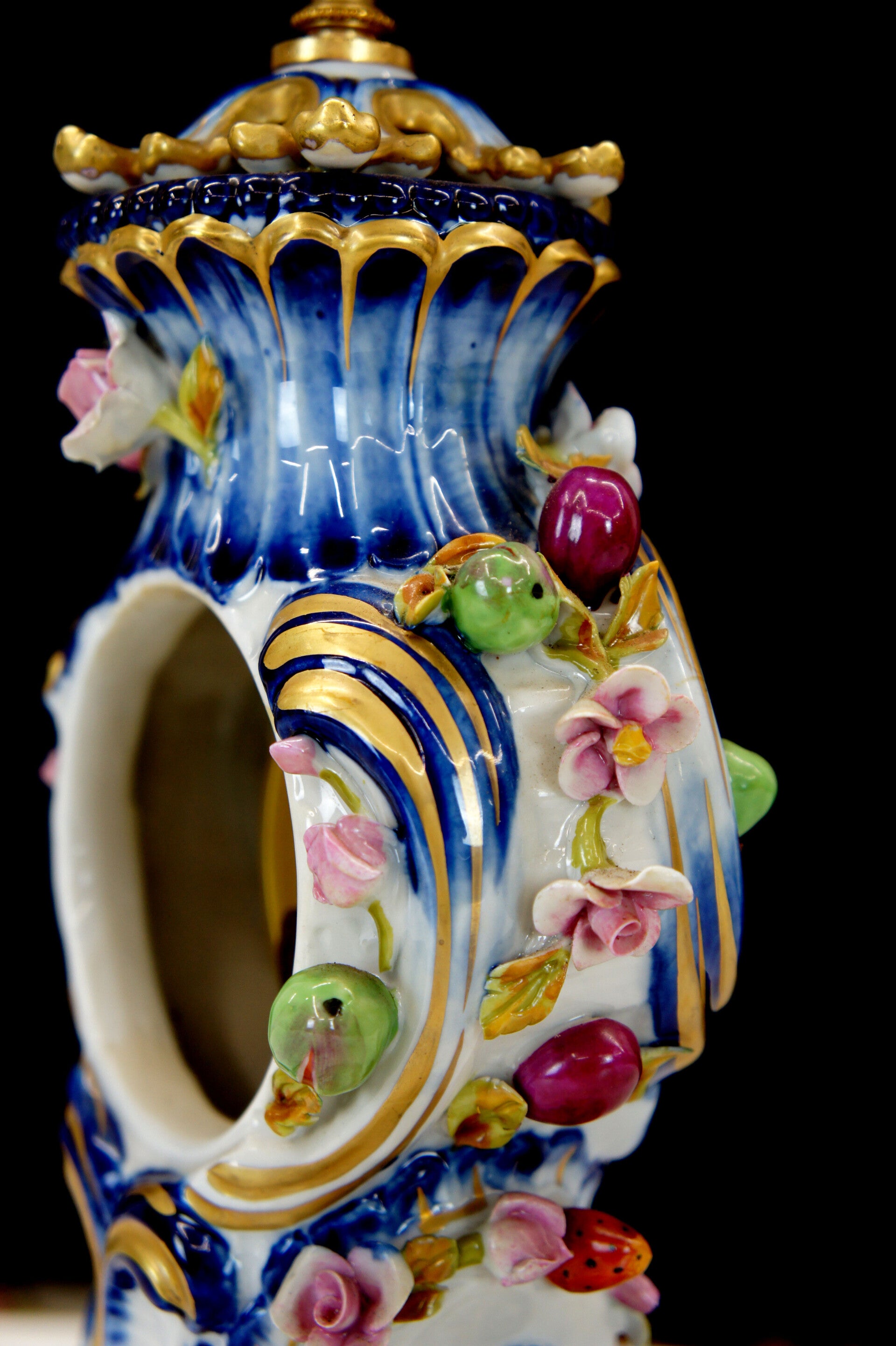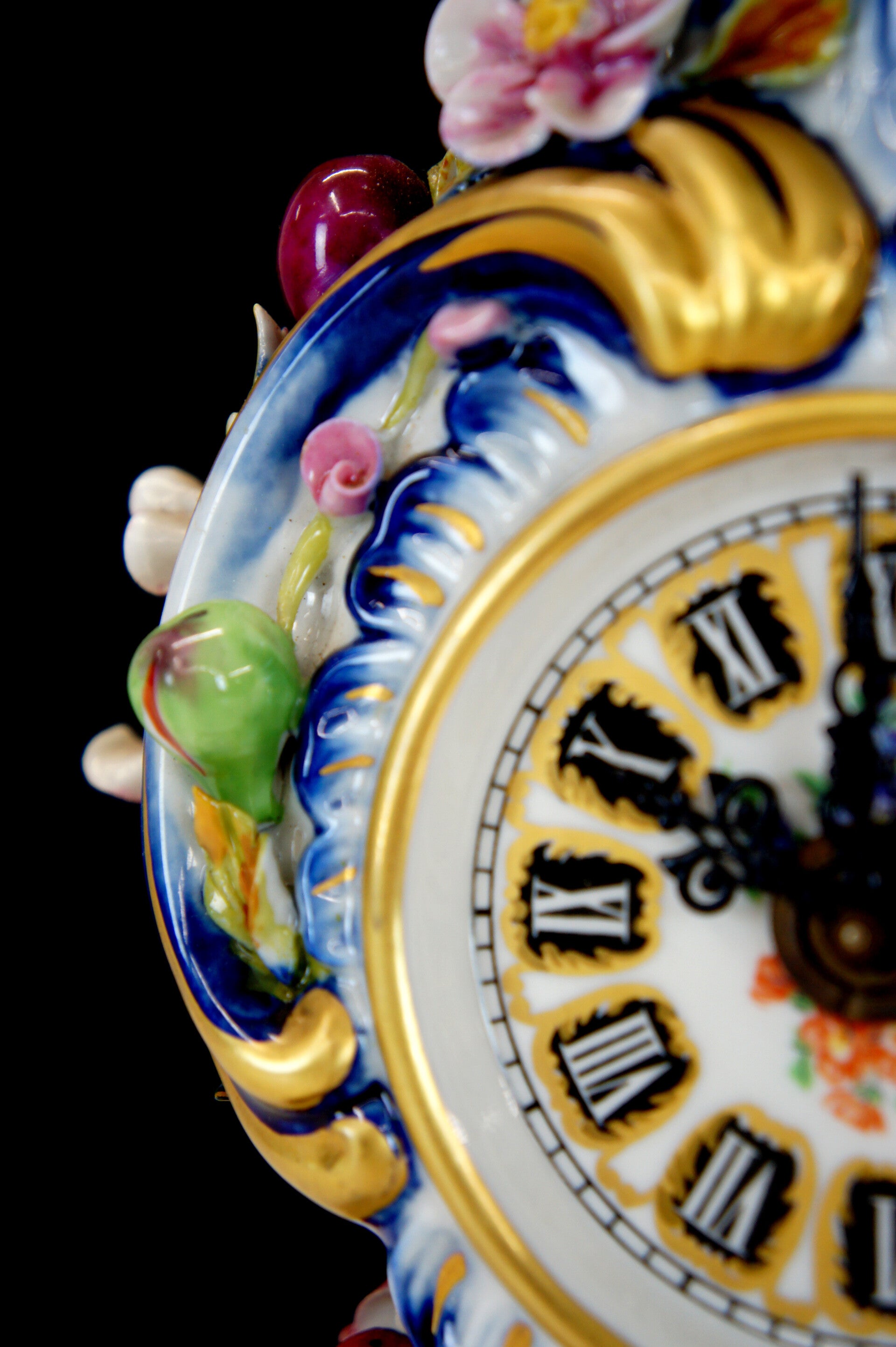 Exceptionally finely crafted and elegant clock by Giulia Mangani in Rococo style, filled with fruit and colorful flowers.