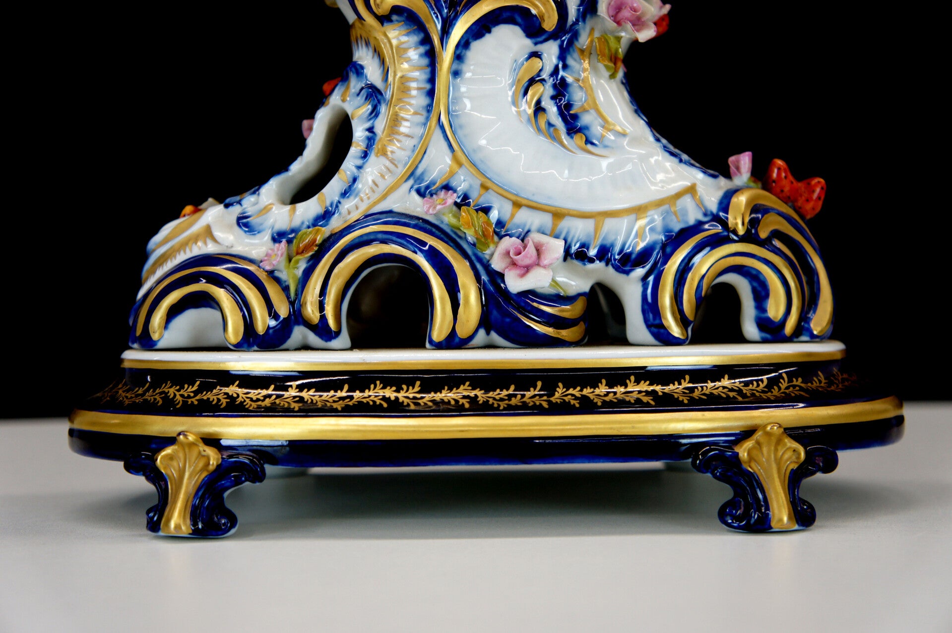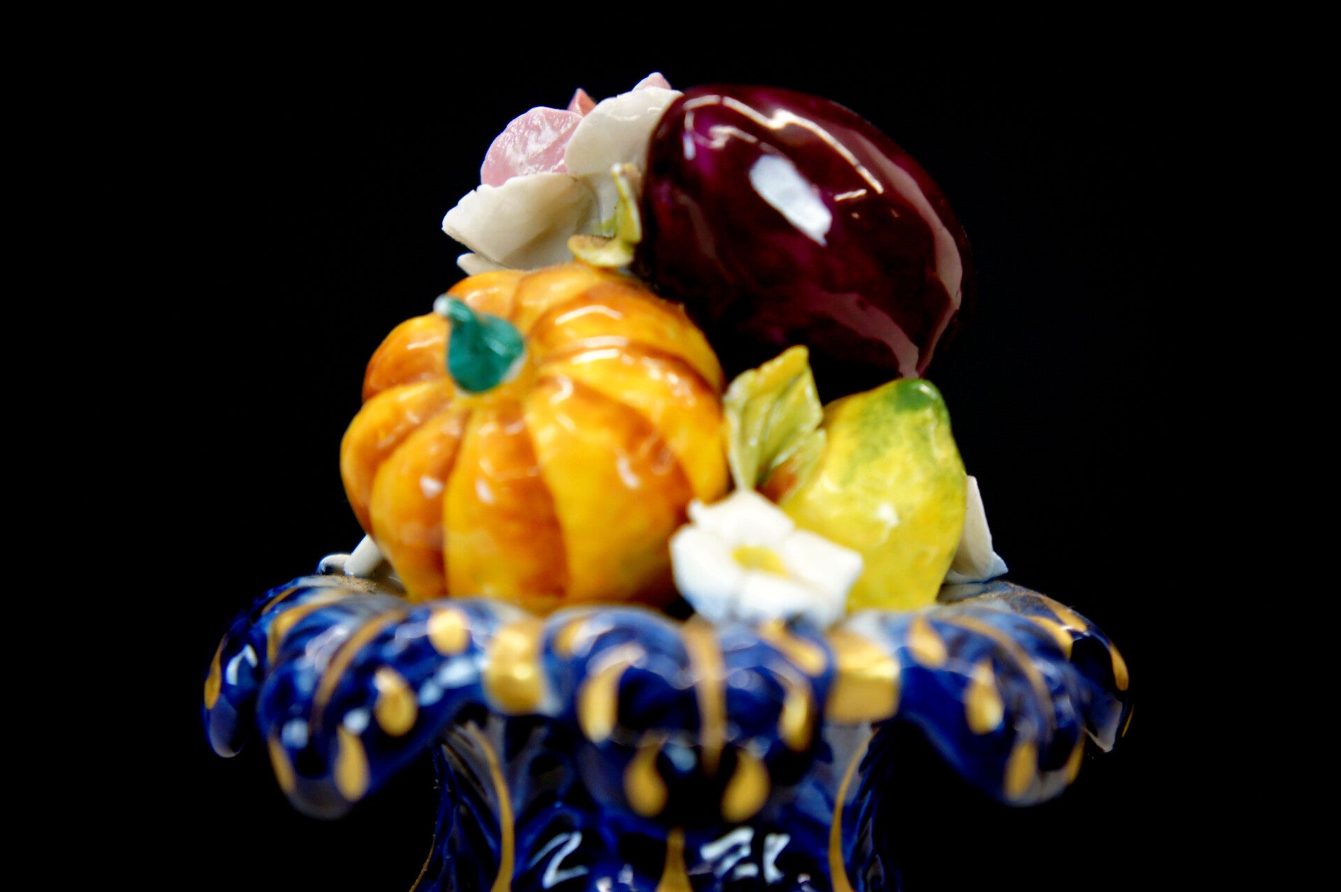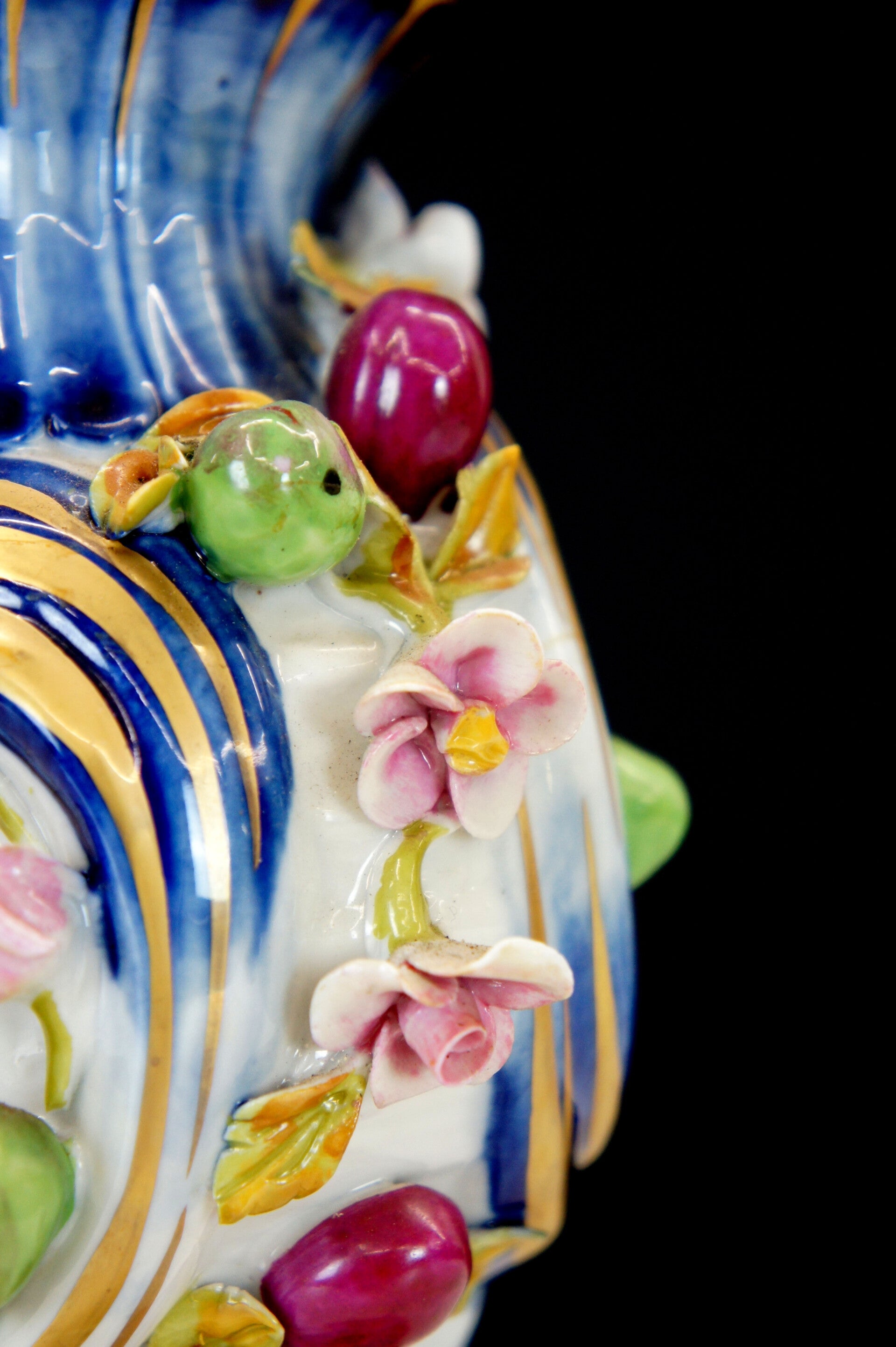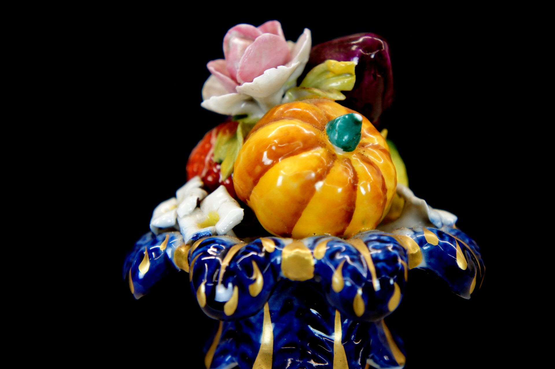 Exceptionally finely crafted and elegant clock by Giulia Mangani in Rococo style, filled with fruit and colorful flowers.