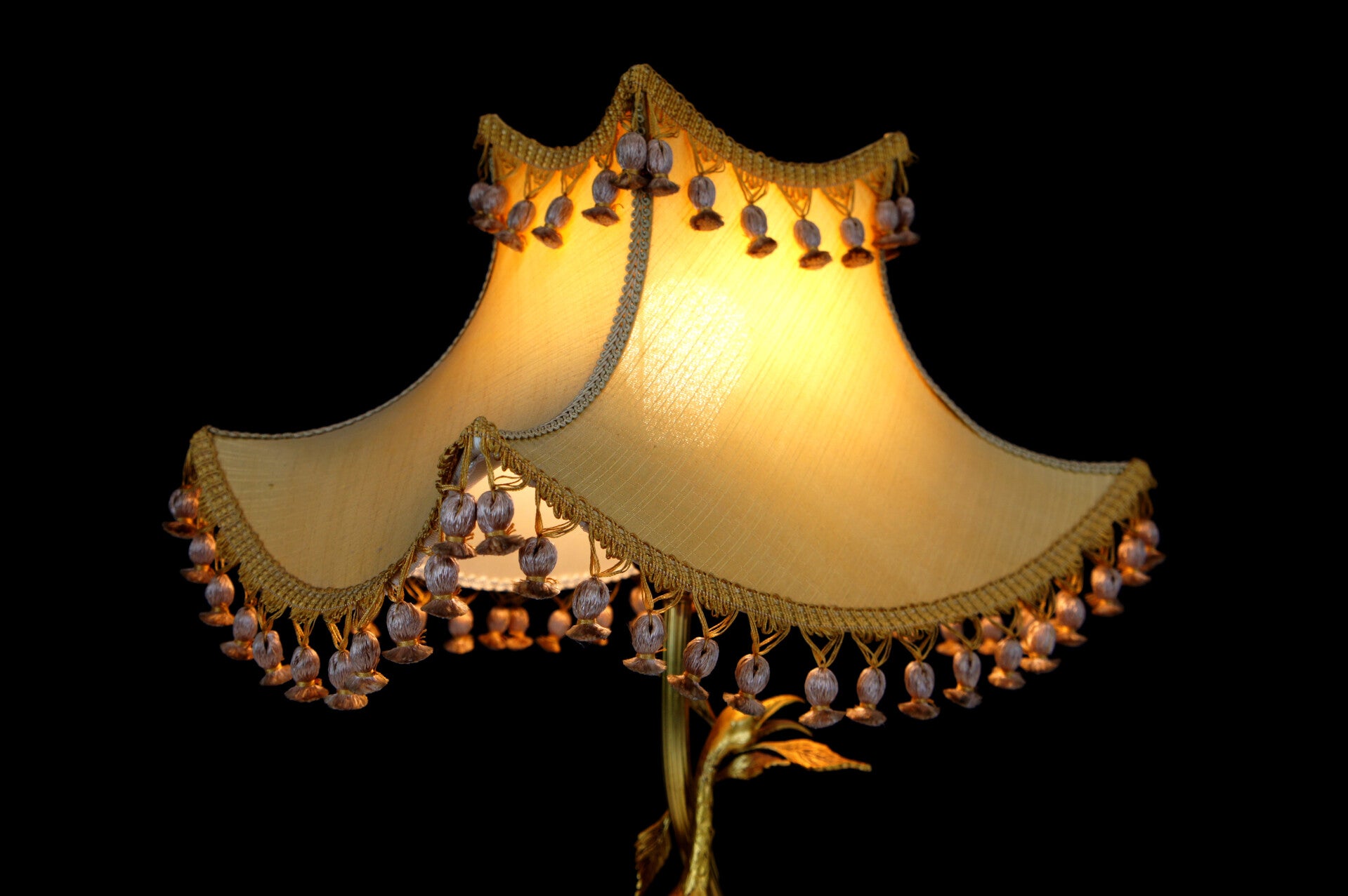 The lamp features a contemporary and very appropriate pagoda-style lampshade with fringes.