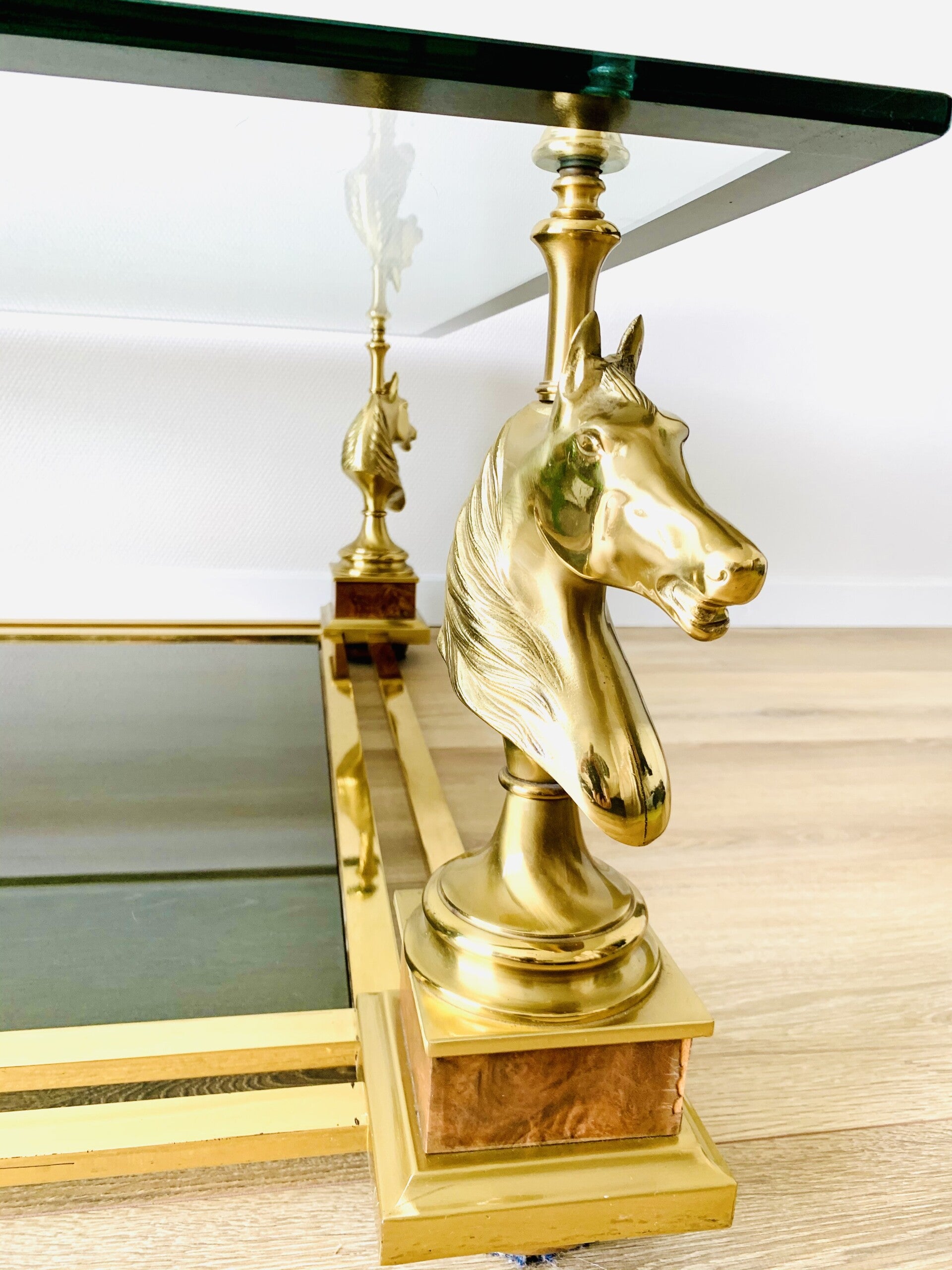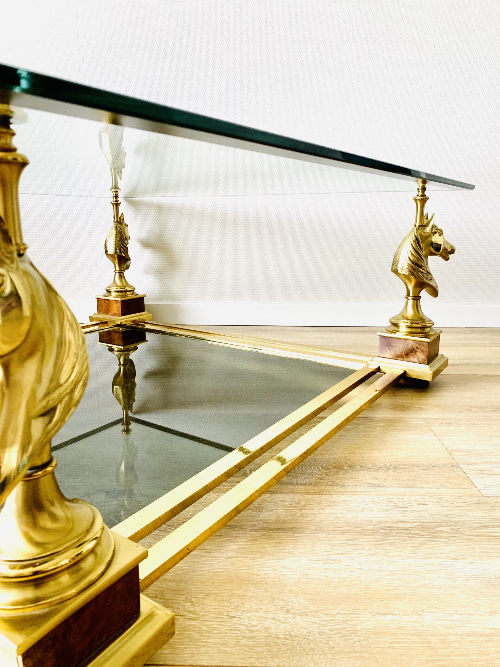 The table has a two-layer brass frame. The bottom glass layer is made of smoked glass, the top glass layer is made of clear glass and has a dark beveled edge.