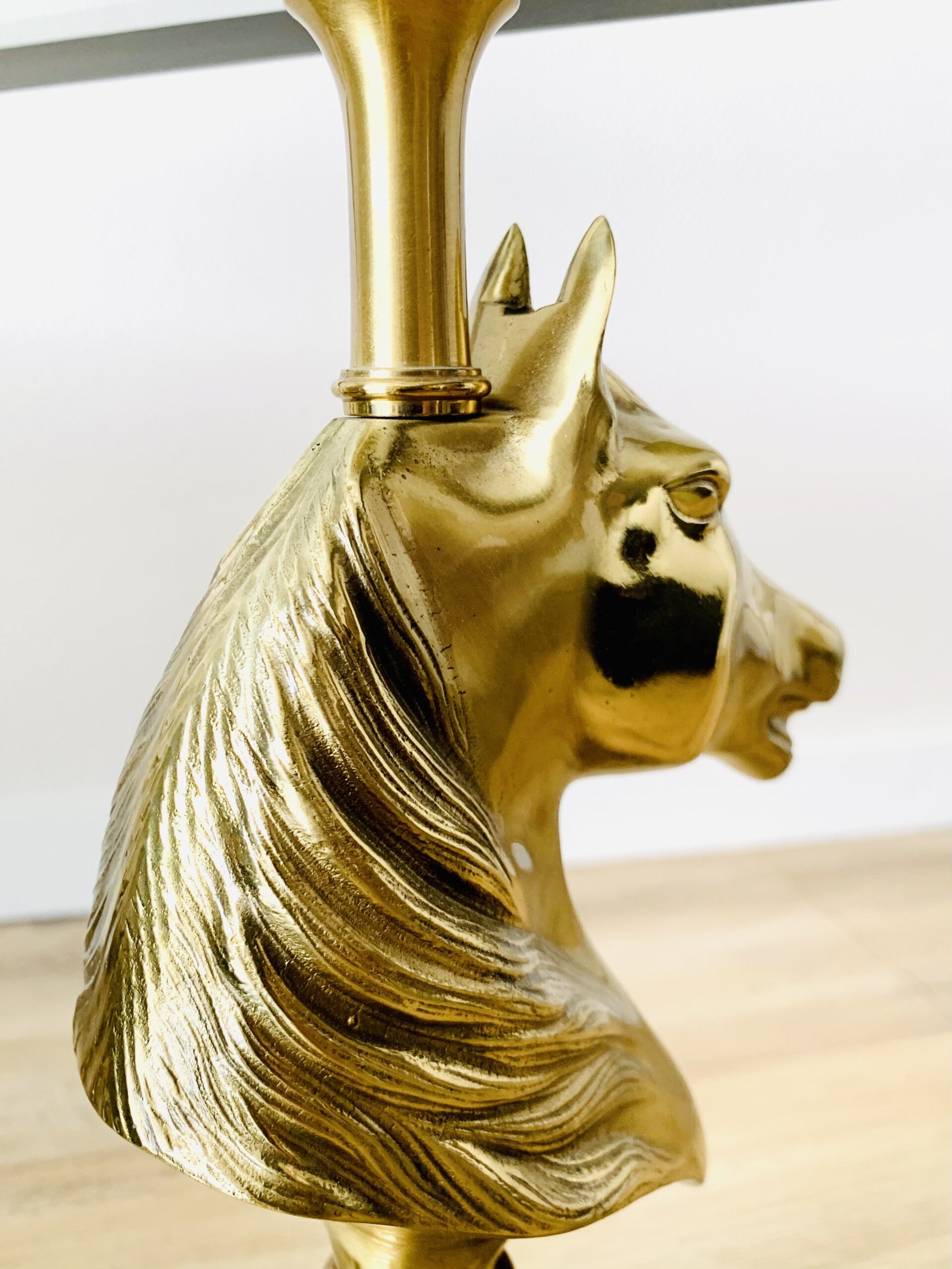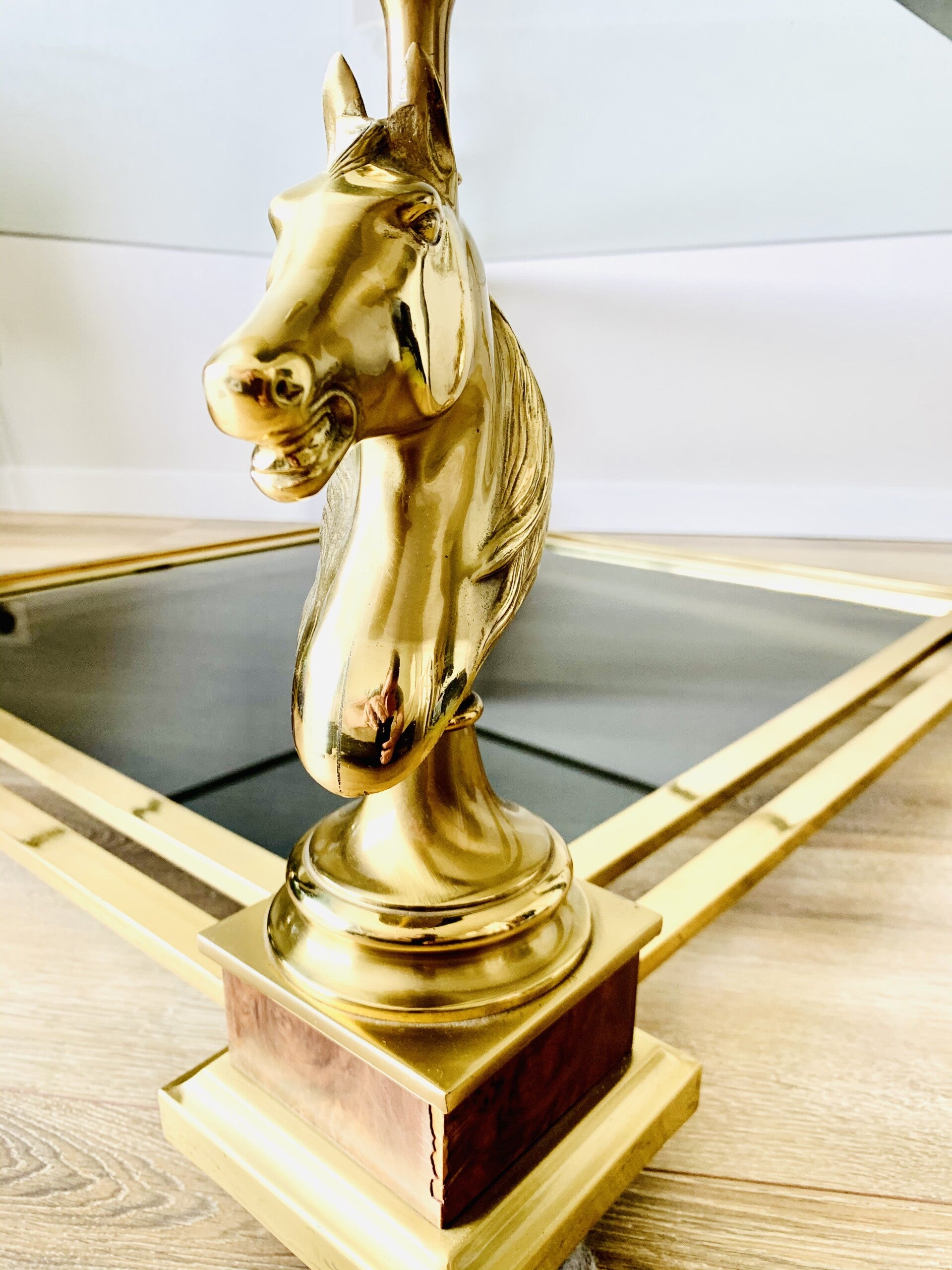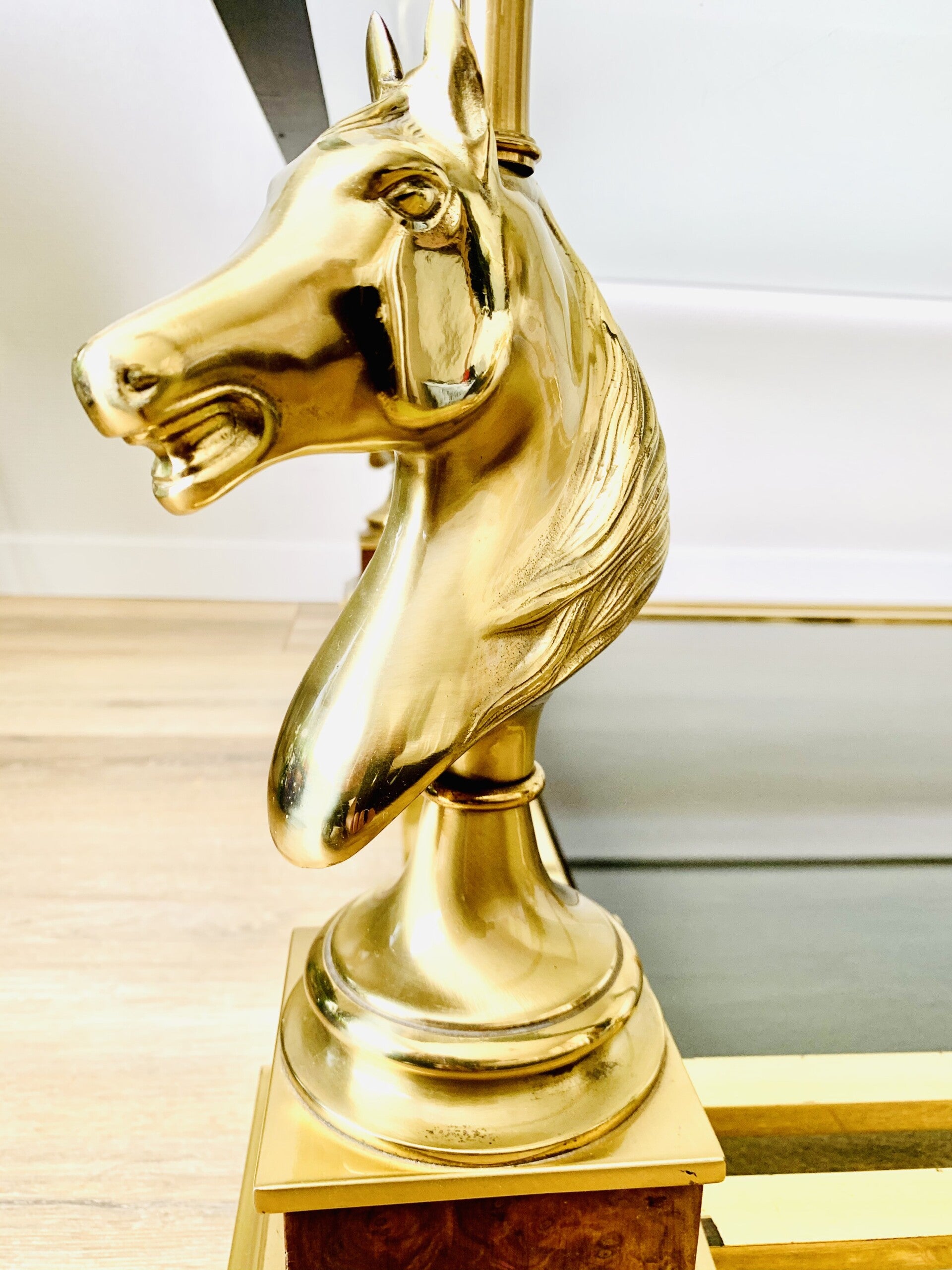 The horse heads rest on Burlwood pedestals, with double stretchers connecting them.