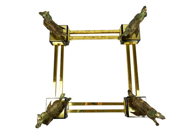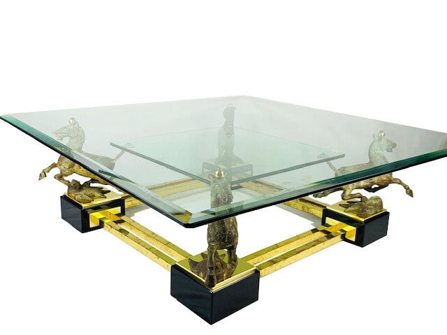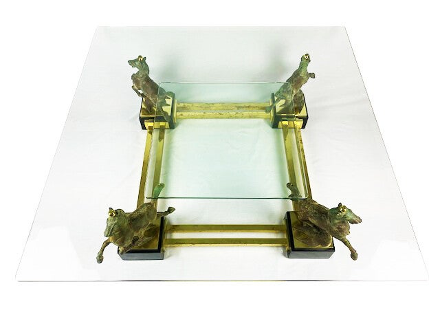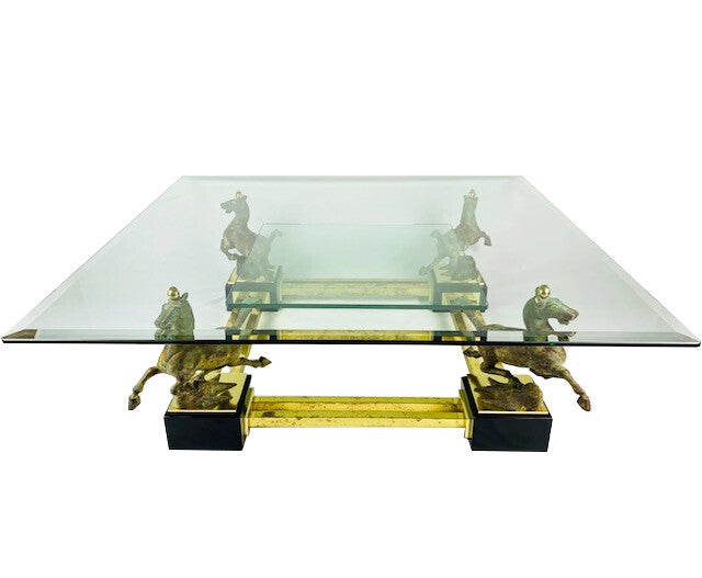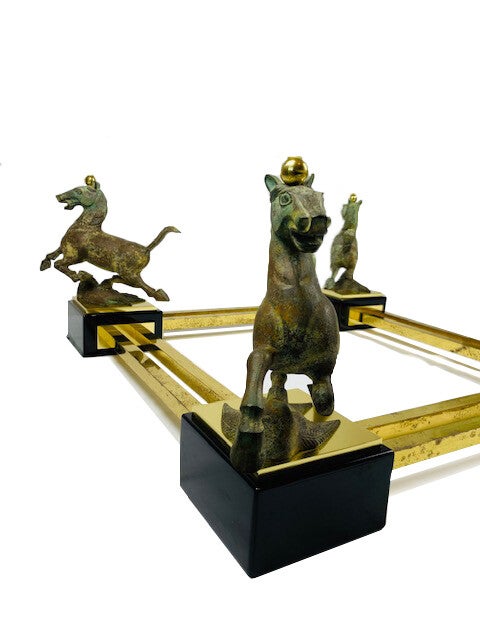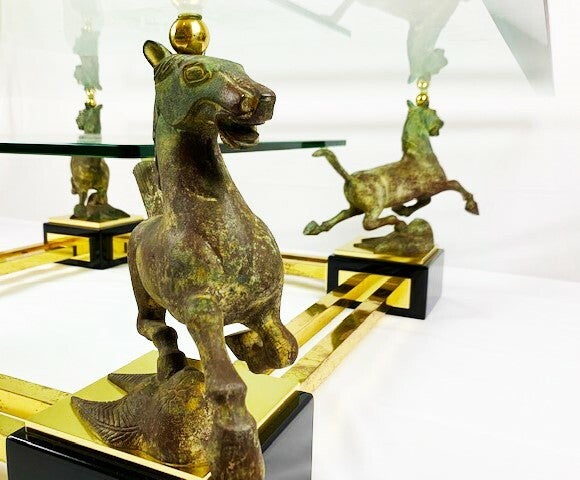 A stylish coffee table, with 4 bronze horses "flying horse of Gansu". Two glass table tops of 1 cm thick, the largest of which has a beveled edge of 3 cm feet, very high-quality finished.