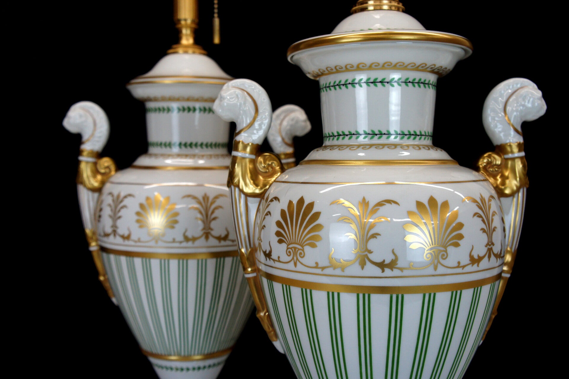 Pair of high imposing porcelain table lamps by Italian Giulia Mangani with lion heads.