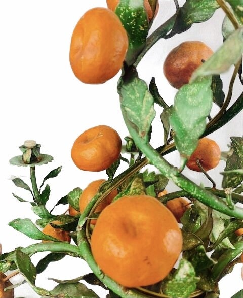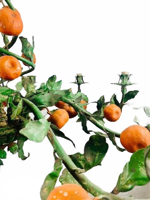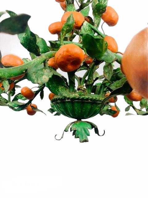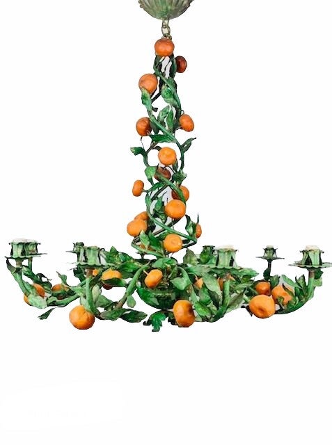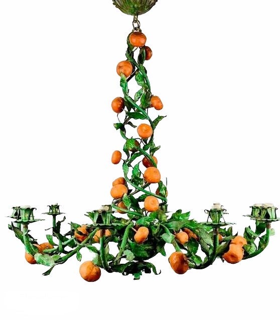 Typical Italian Tole (hand painted) Chandelier, very early model 1940-1945. Still completely original. counts no less than 38 oranges around the 10 branches to the light points and twisted upwards to the ceiling cap.