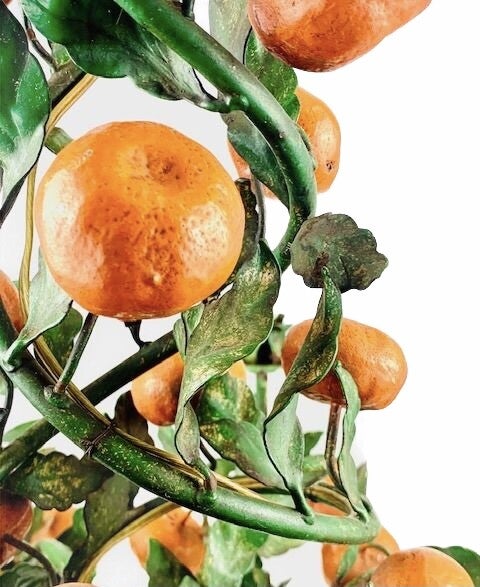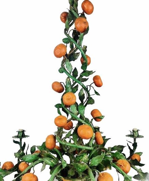 A large and very charming Italian chandelier with ten light points, a presentation of green branches and leaves, covered with oranges.