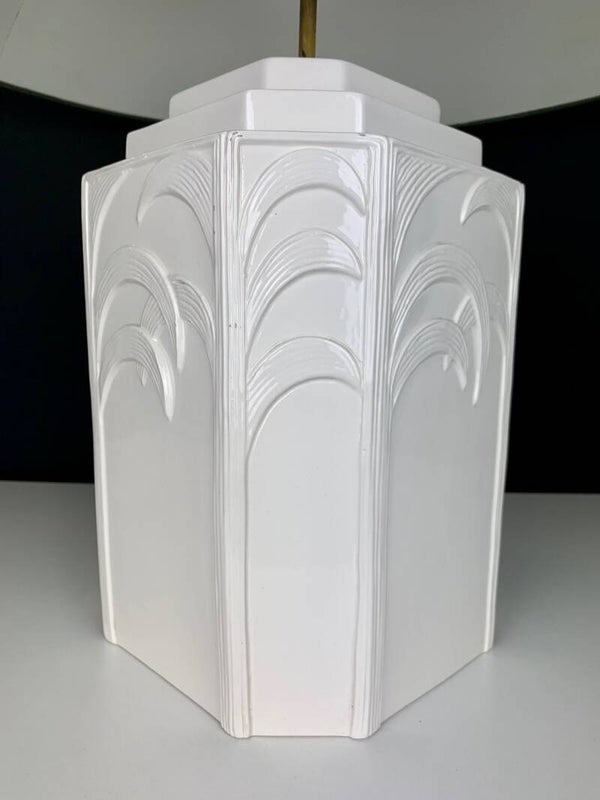 Clear ceramic octagonal lamp in trapeze shape upwards decorated with palm trees. Adjustable in height, with a contemporary green lampshade.