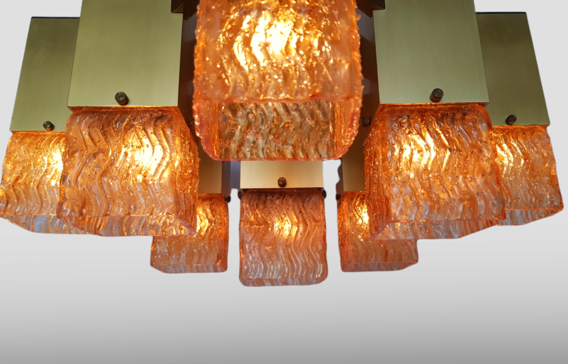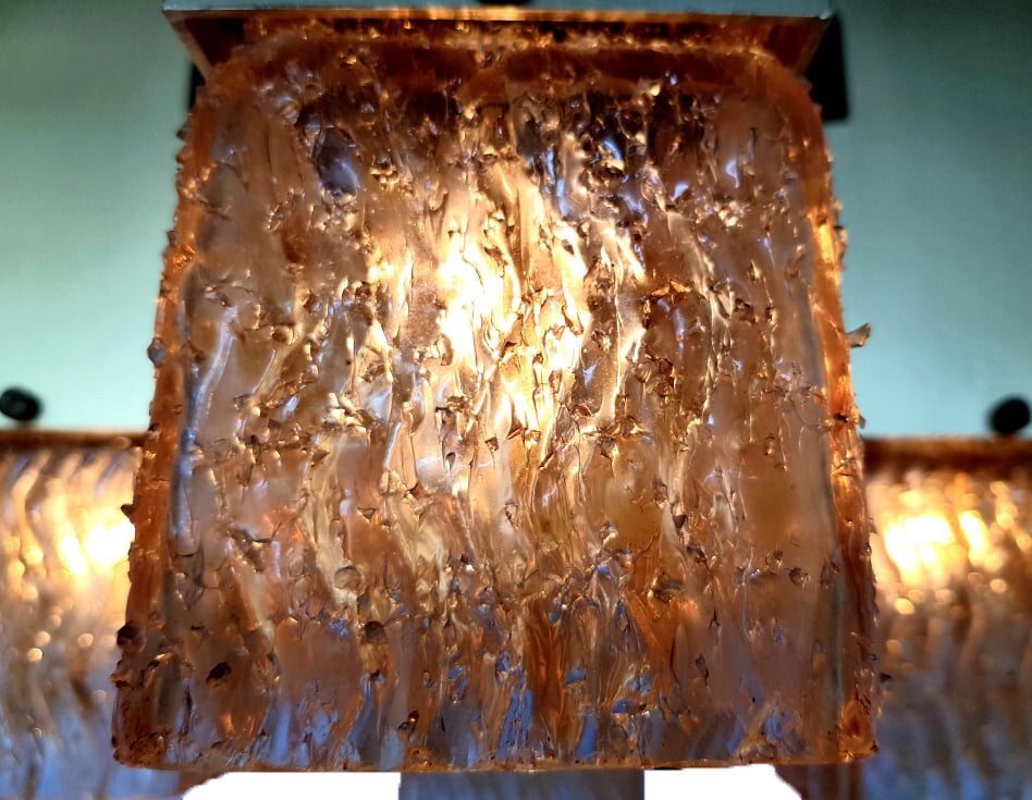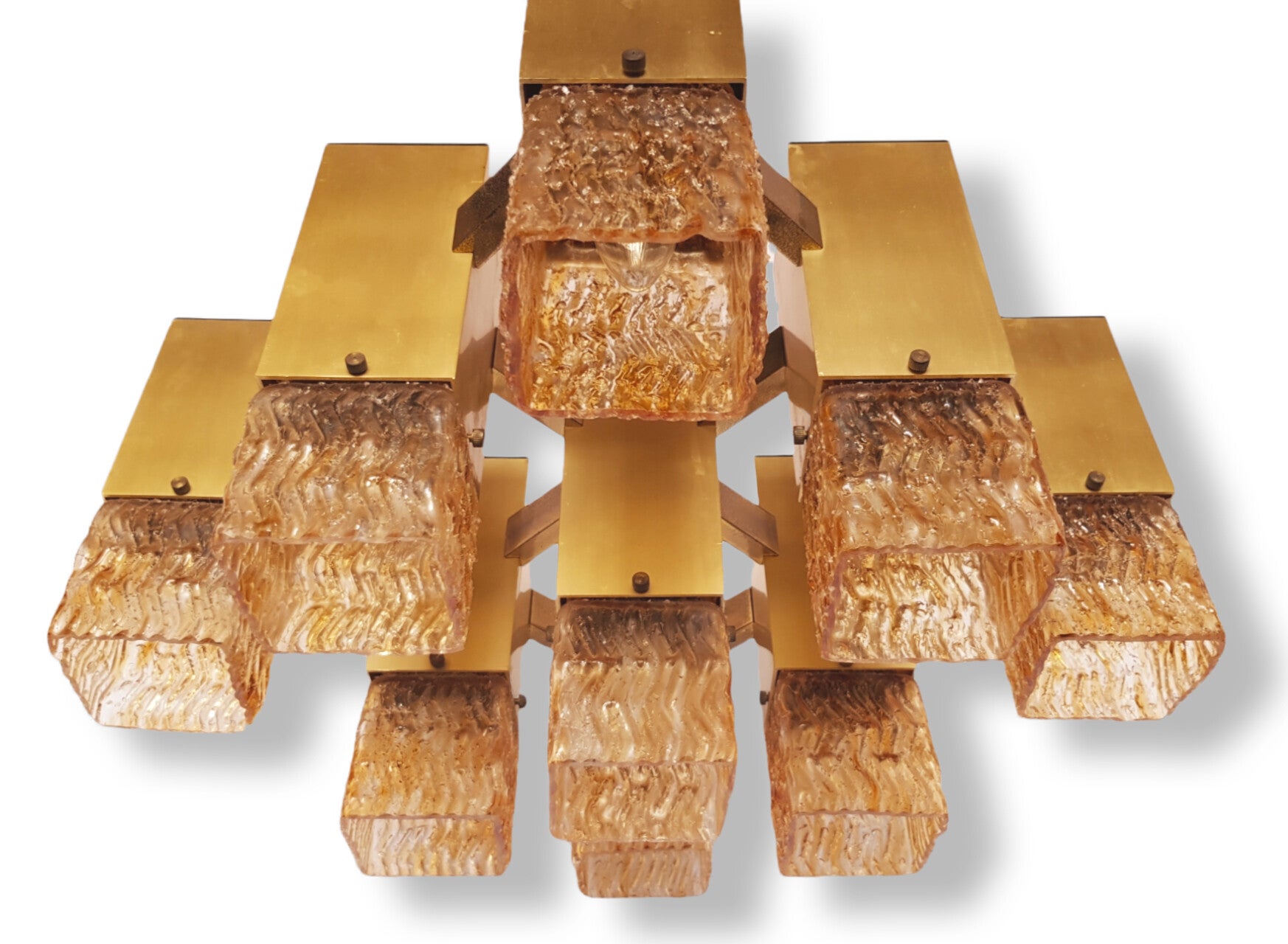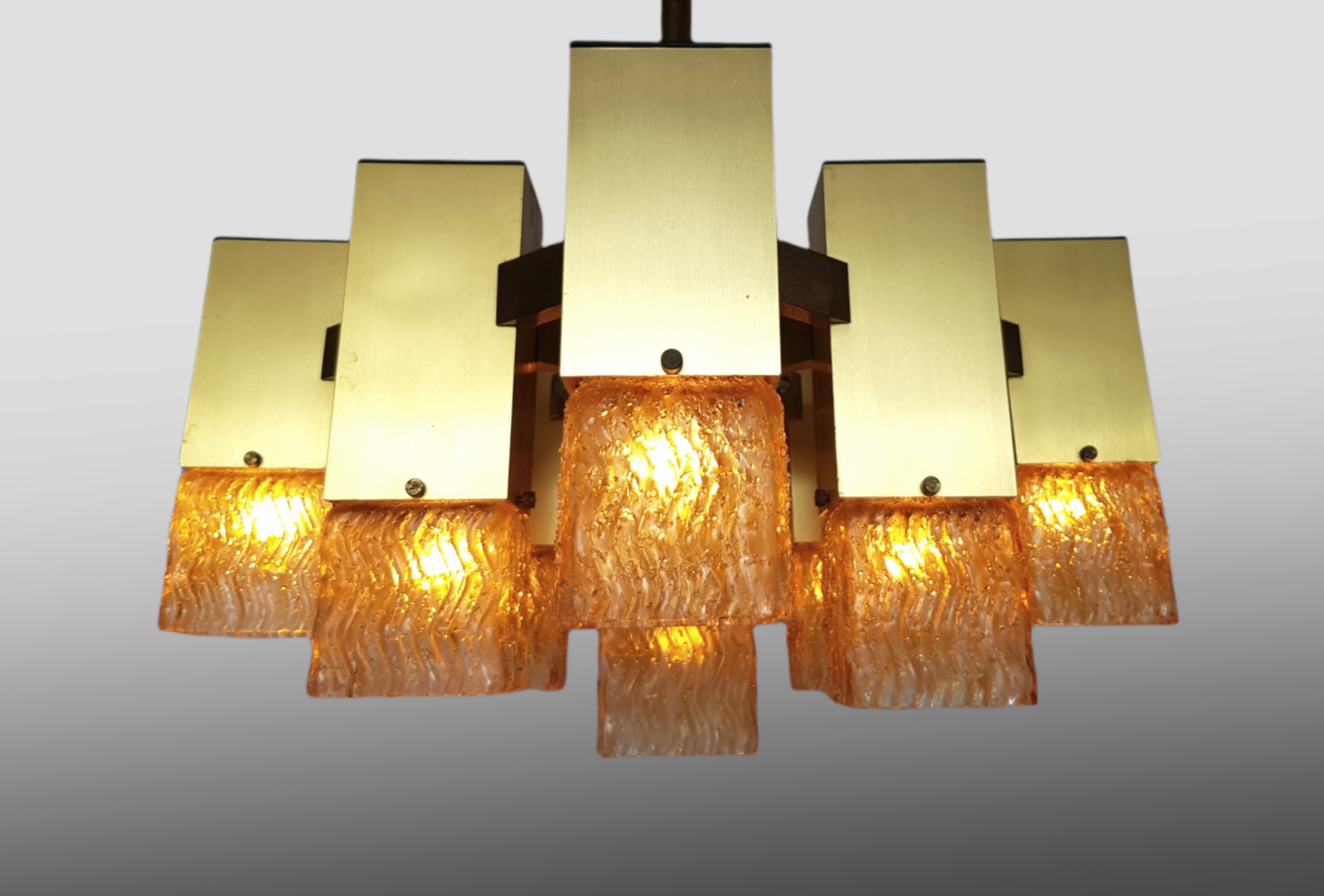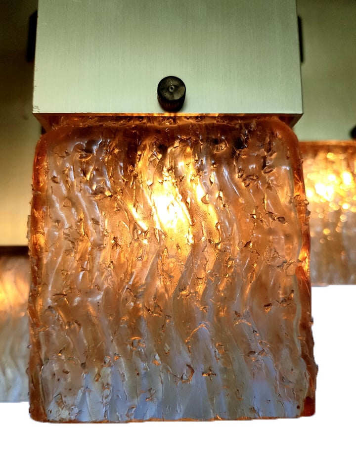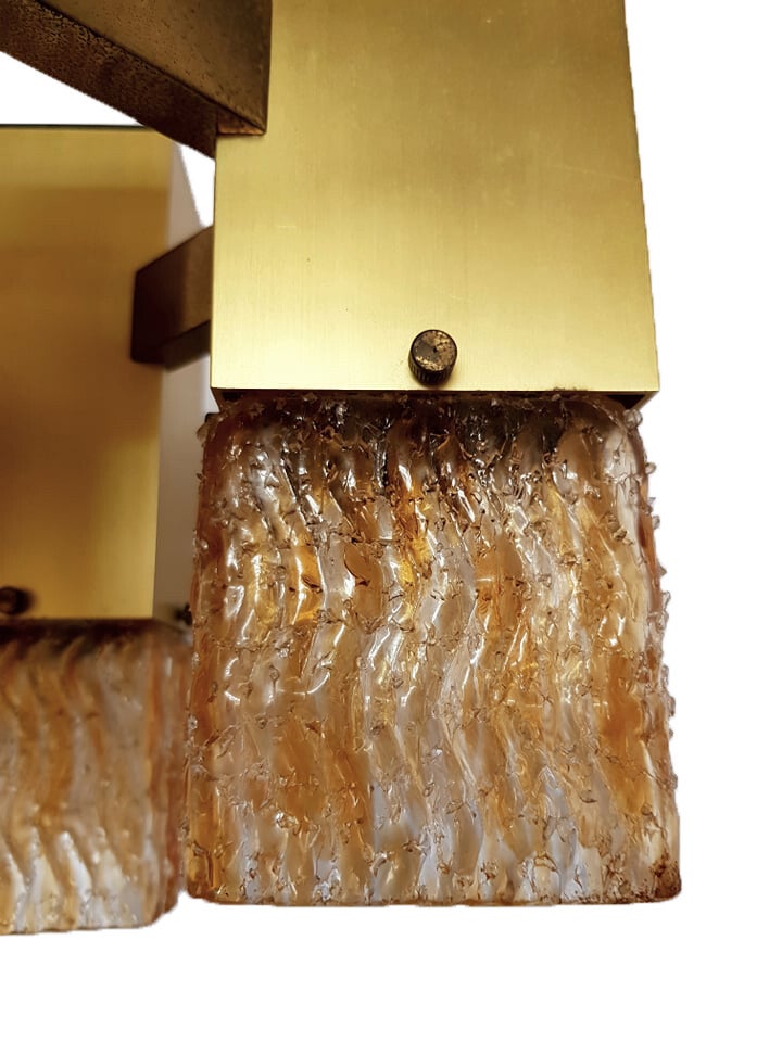 Suspension completely made of brass. The glass cups have the effect of coarse sugar glass, in warm tones.