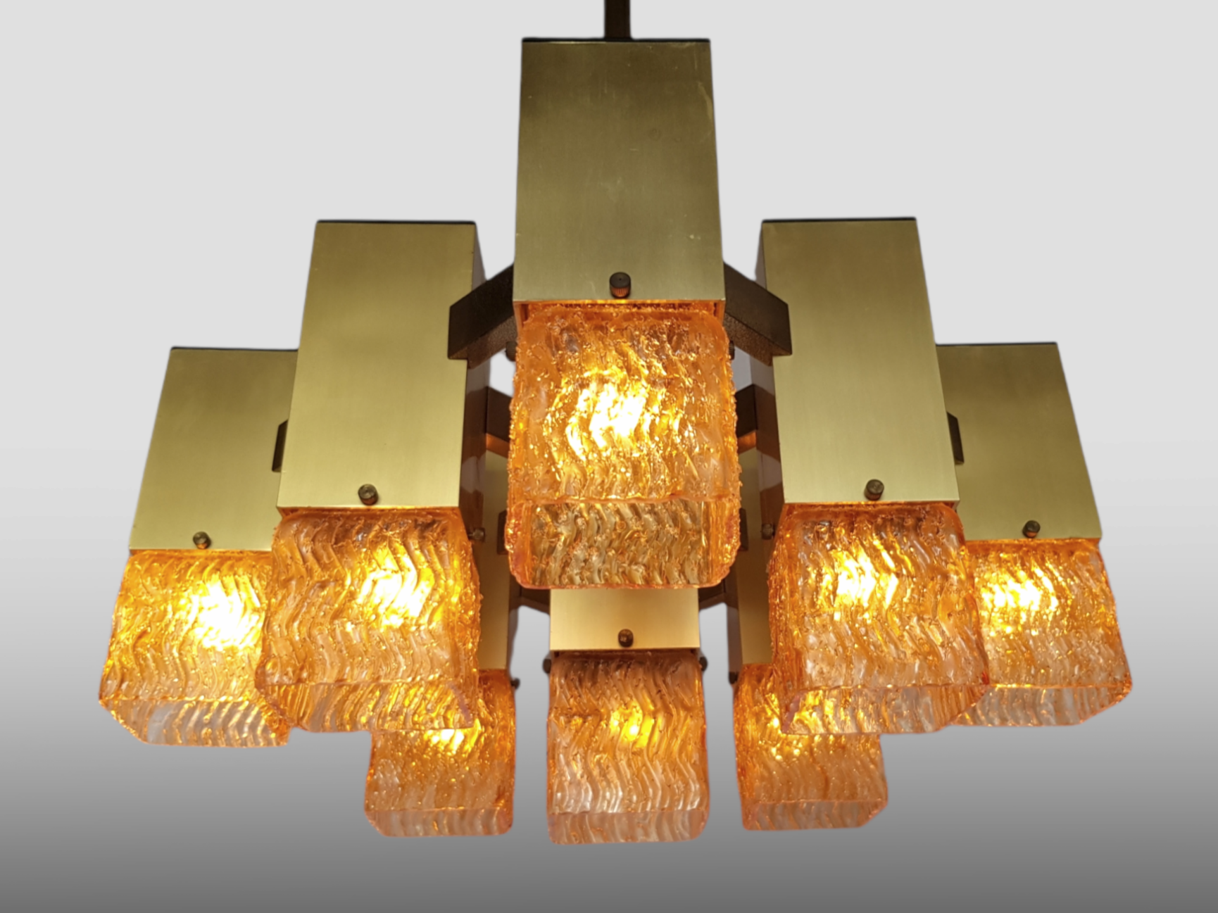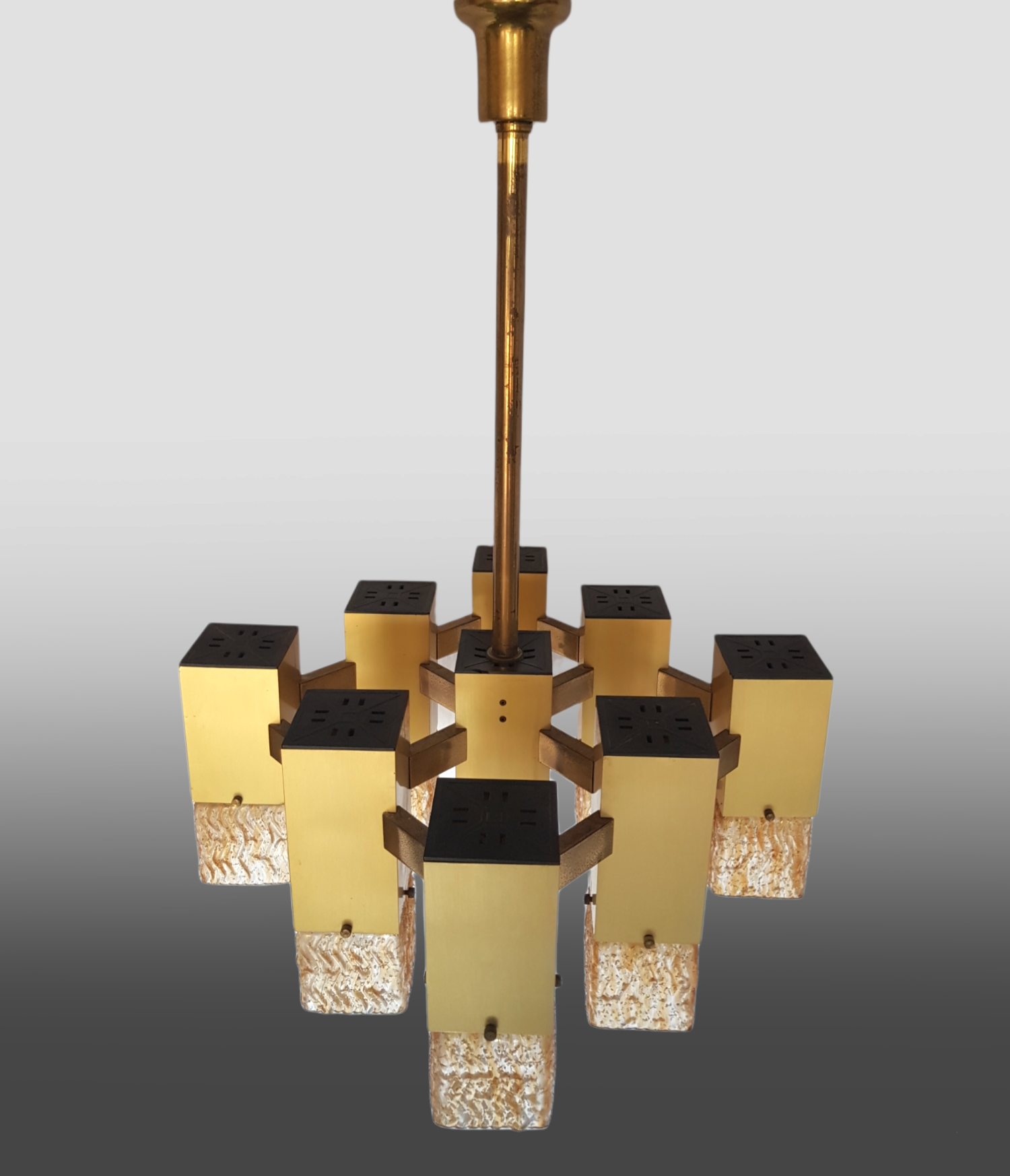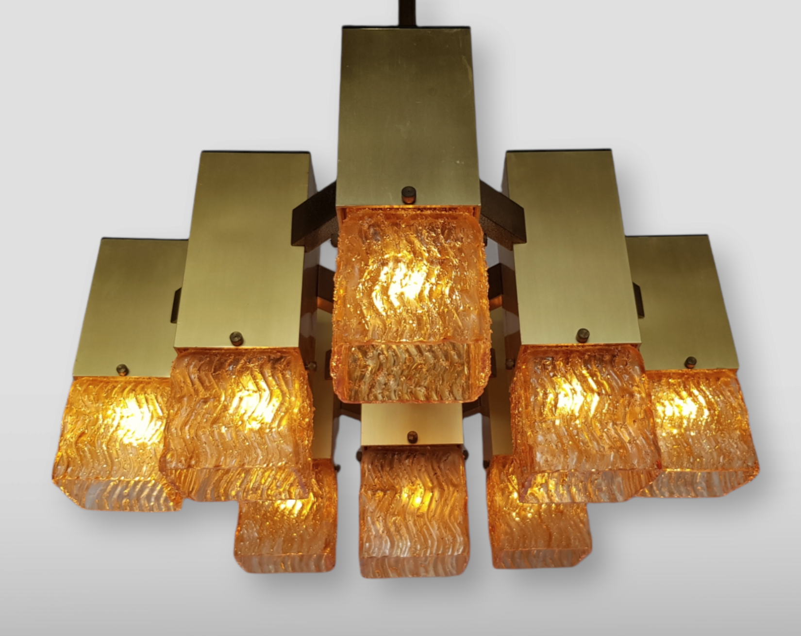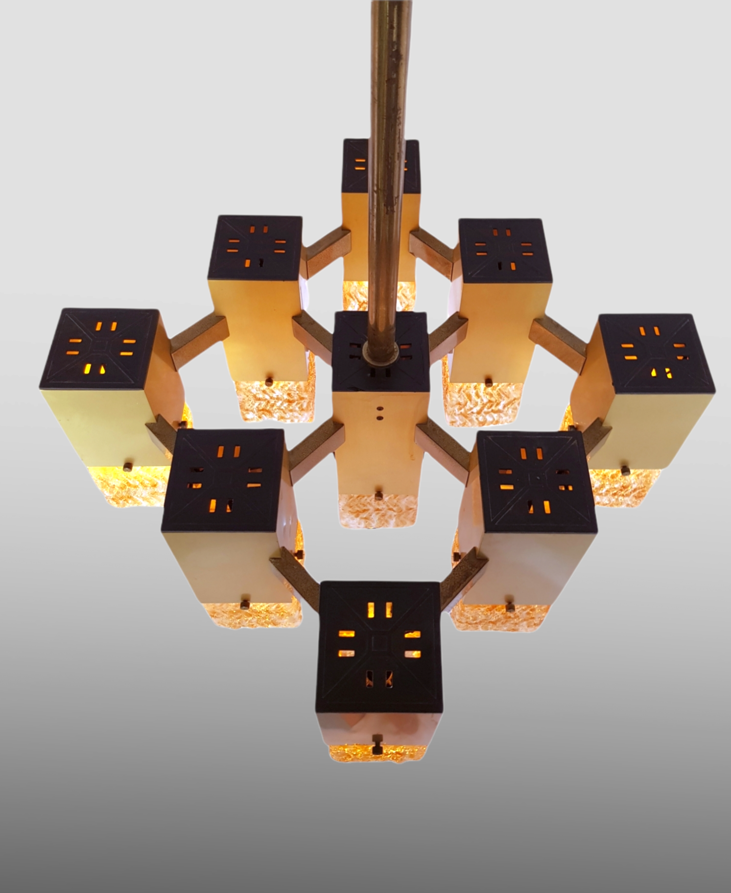 Cubic chandelier with 9 light points designed by Gaetano Sciolari, produced by the Italian Stilkronen in the 1970s.