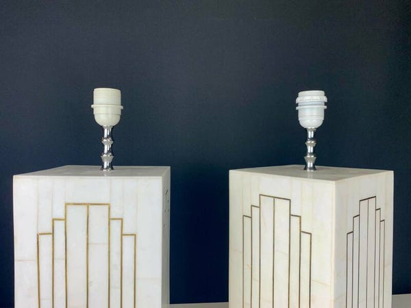 A pair of geometric inlaid table lamps, in Hollywood Regency Style.