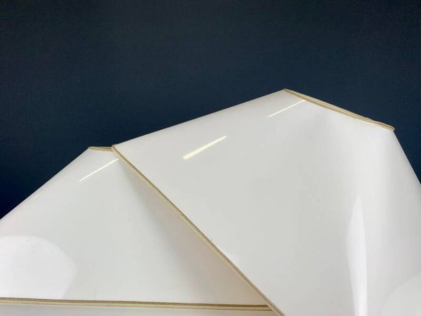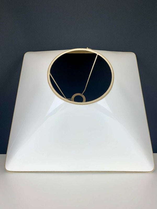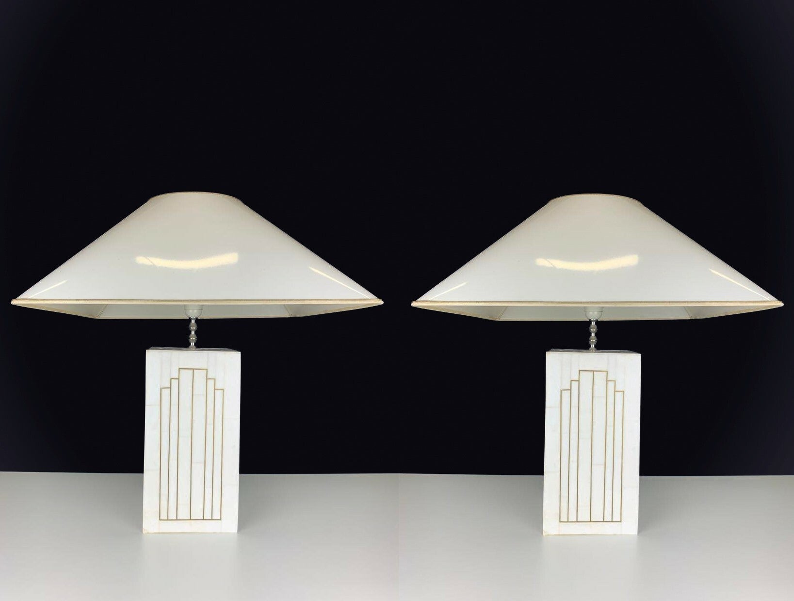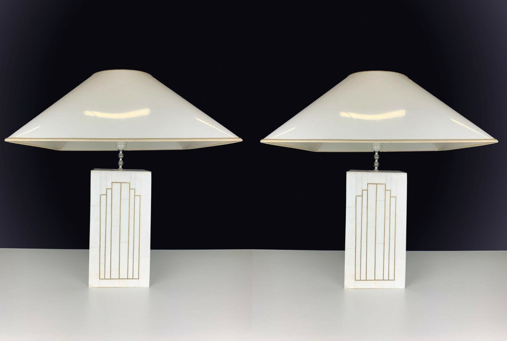 The lampshades are of a nice size and finished in a glossy white lacquer layer. Beautifully assorted with the base of the lamp and certainly belongs to the originality of this pair of lamps.