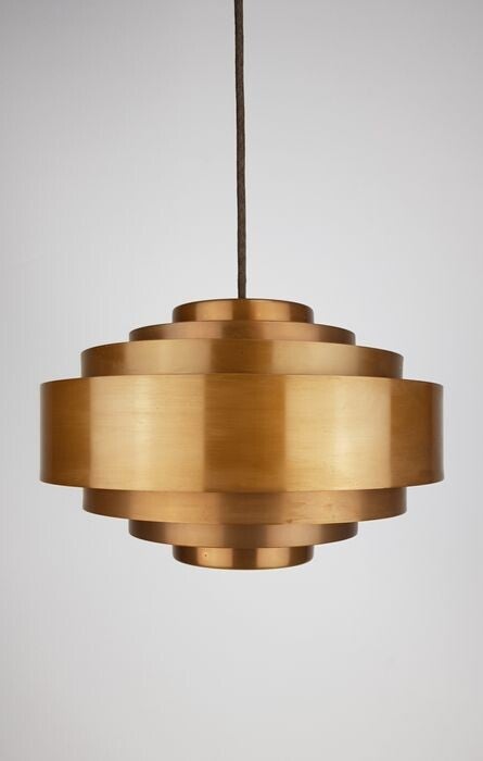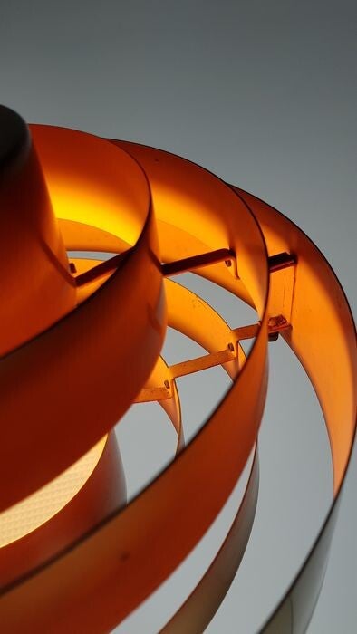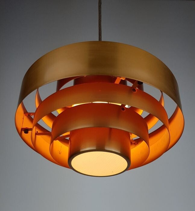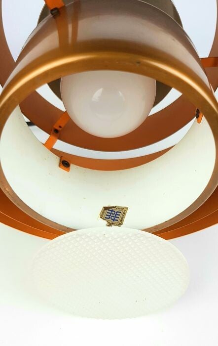 This lamp still has the original perspex diffuser round plate at the bottom and also the Original Fog and Morup factory label is present. see the close-up photos.