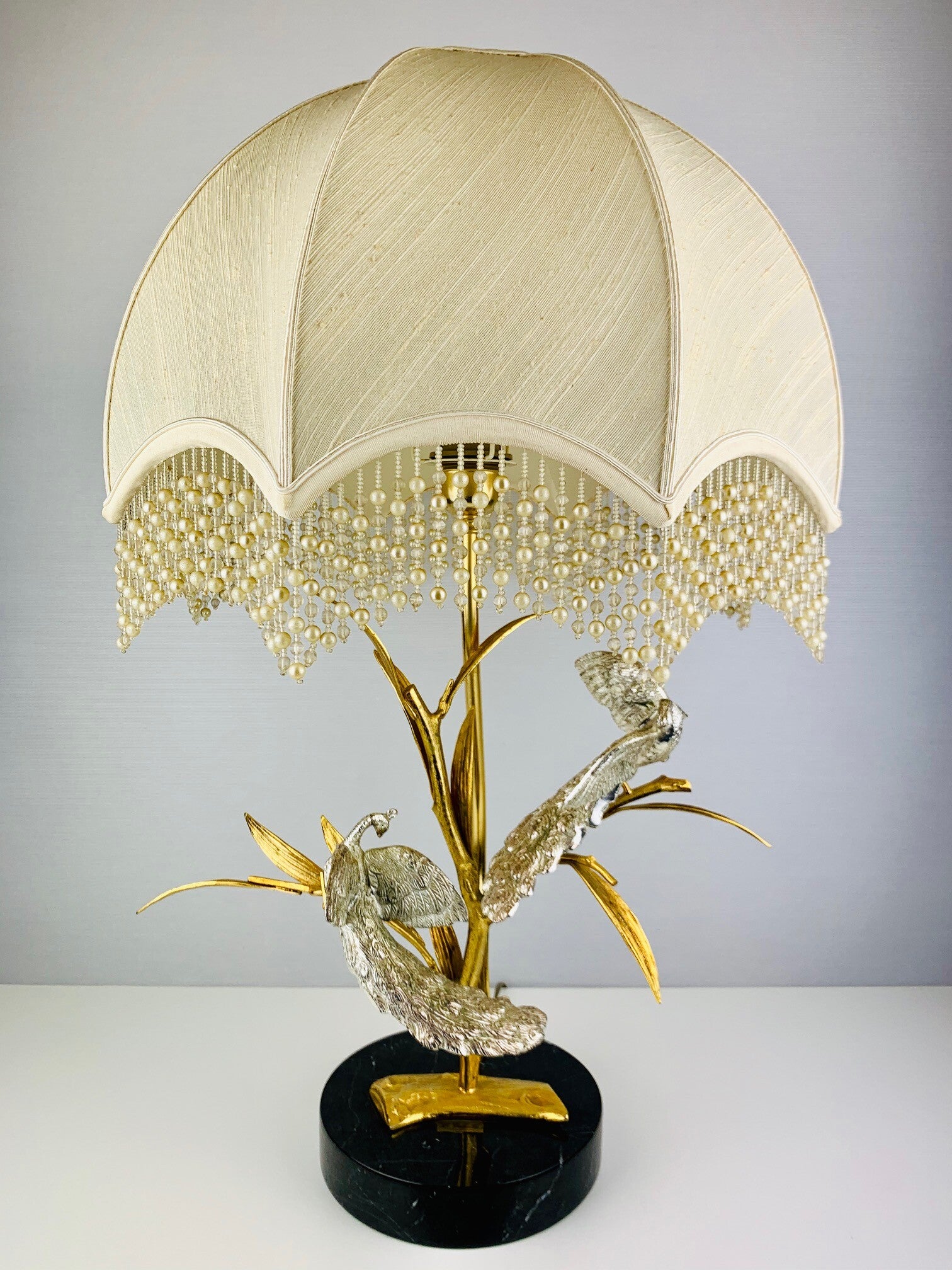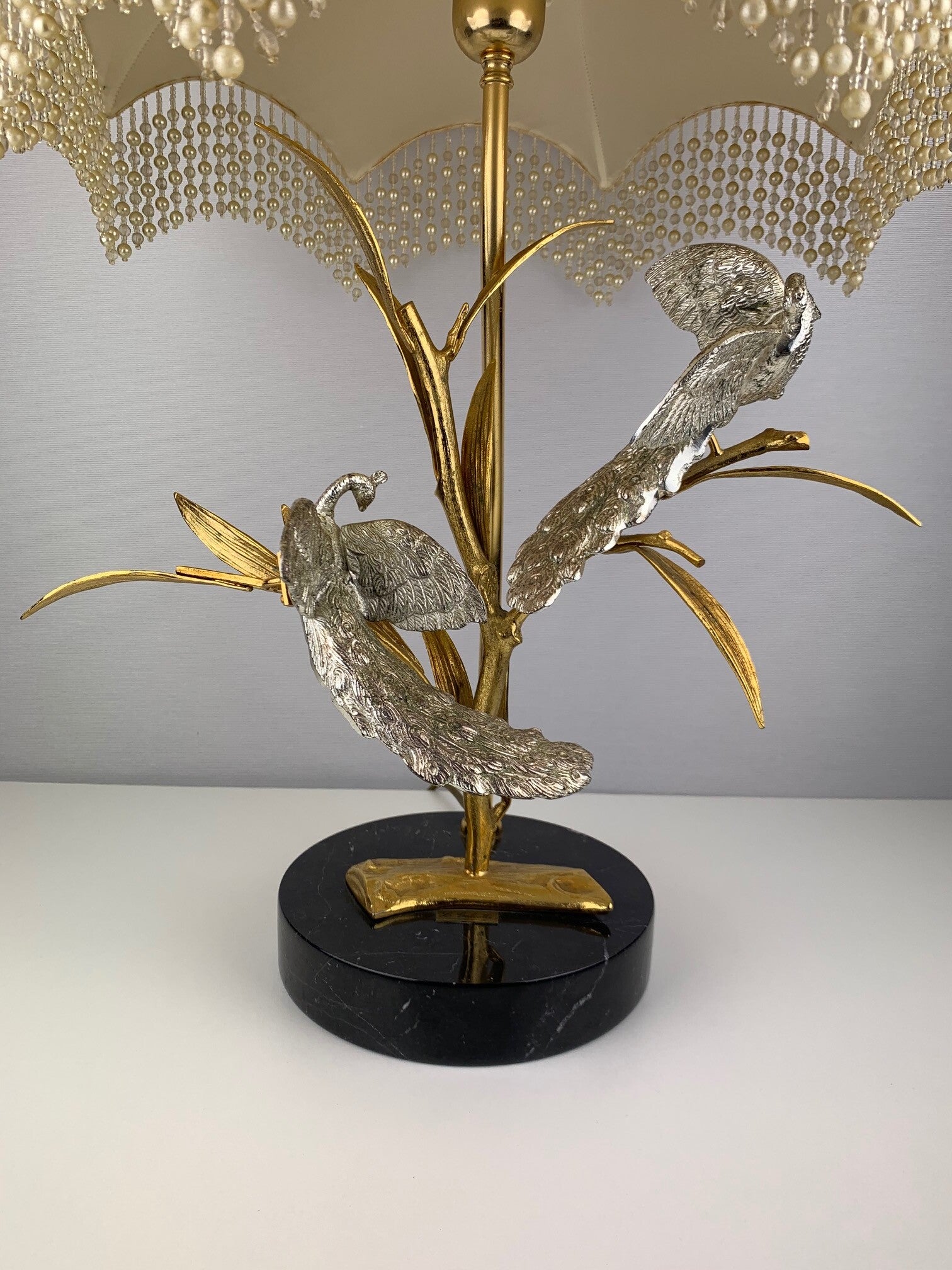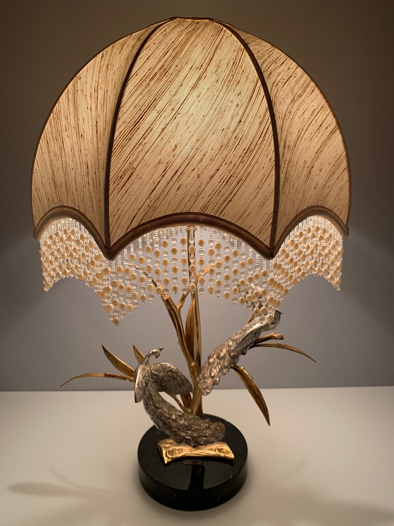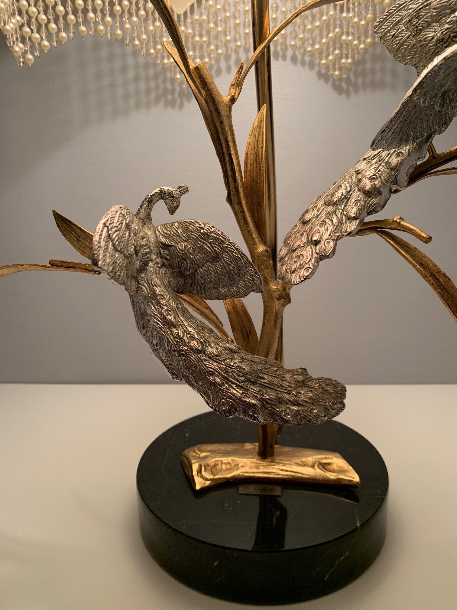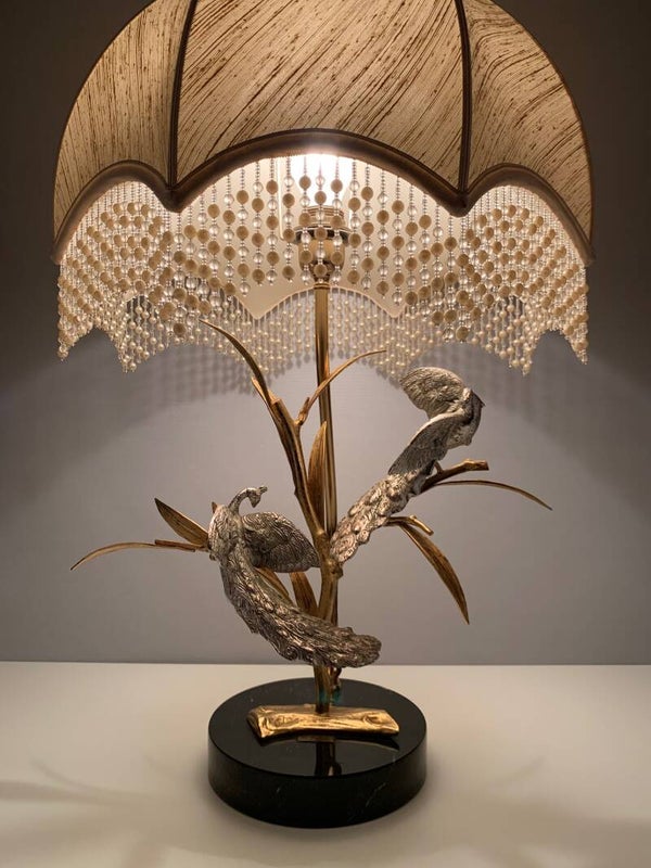 This beautiful table lamp with a gilded branch that carries two silver-plated peacocks is marked and limited.