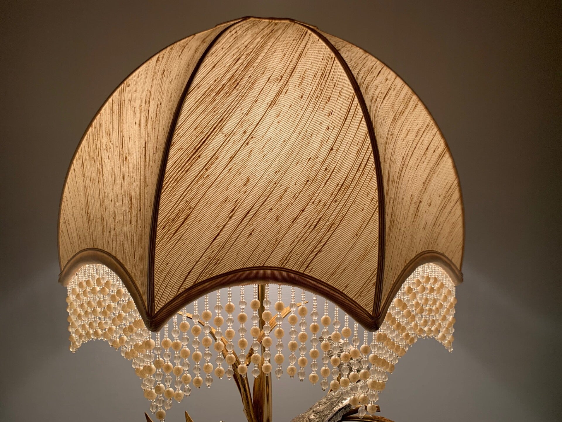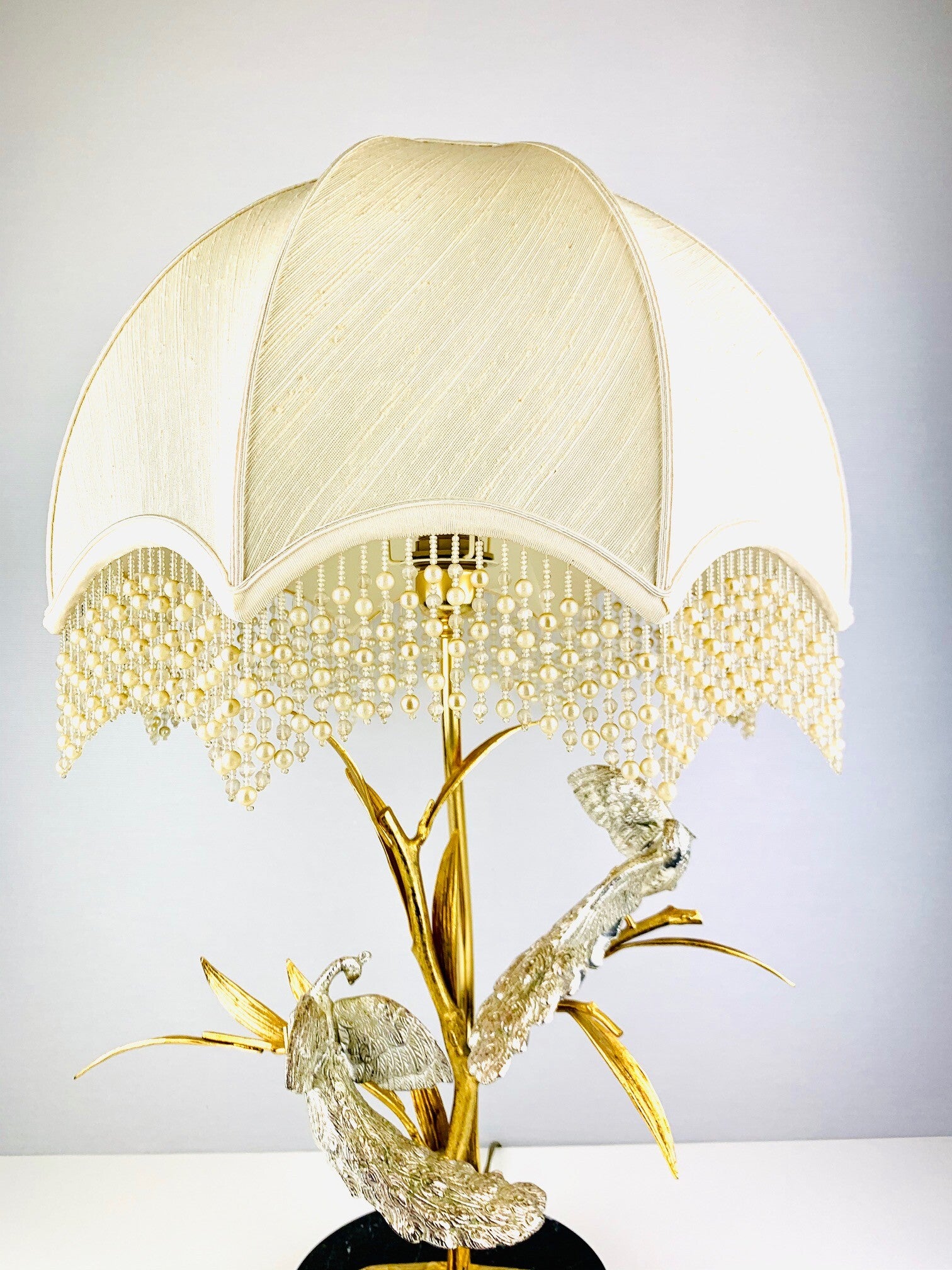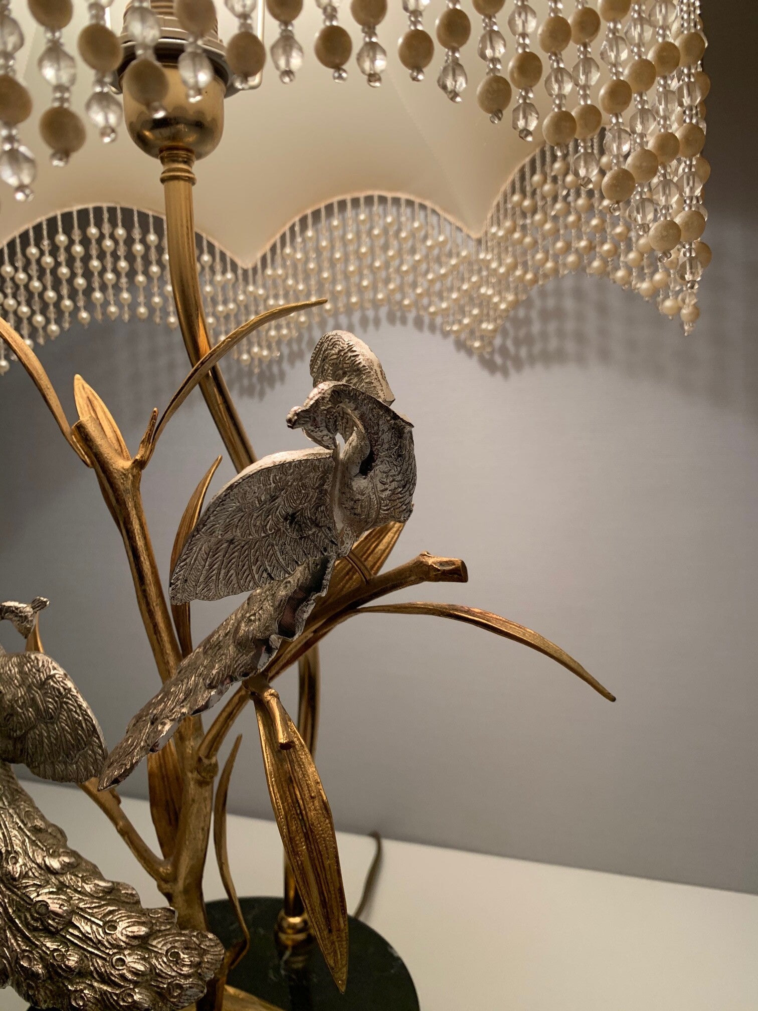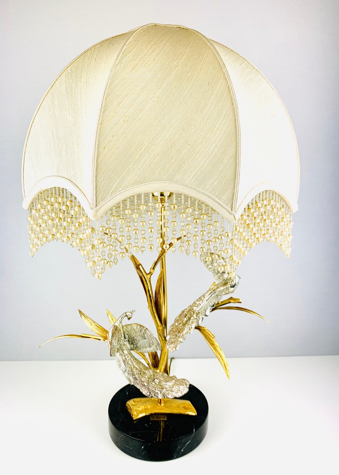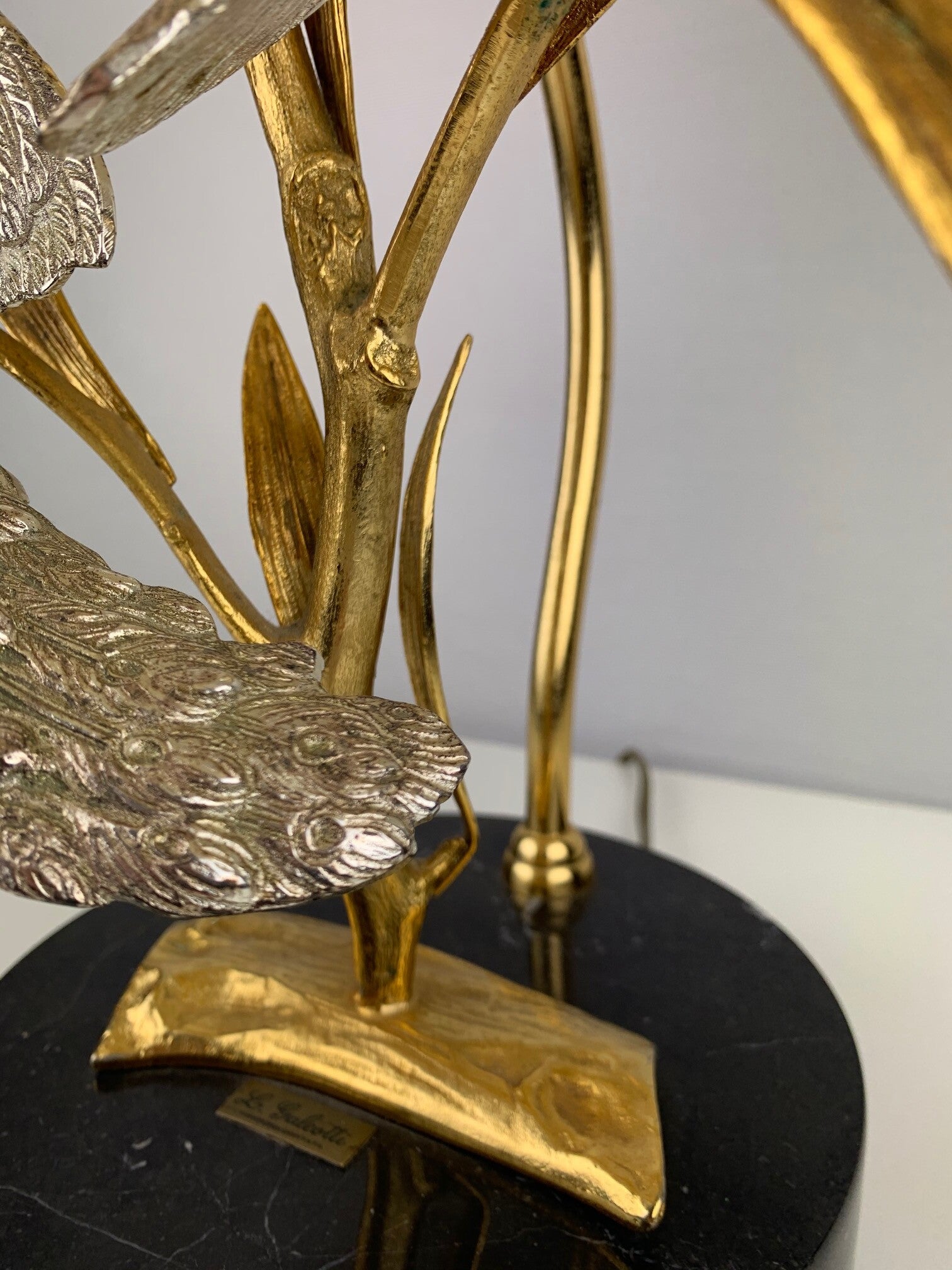This beautiful table lamp with a gilded branch that carries two silver-plated peacocks is marked and limited.