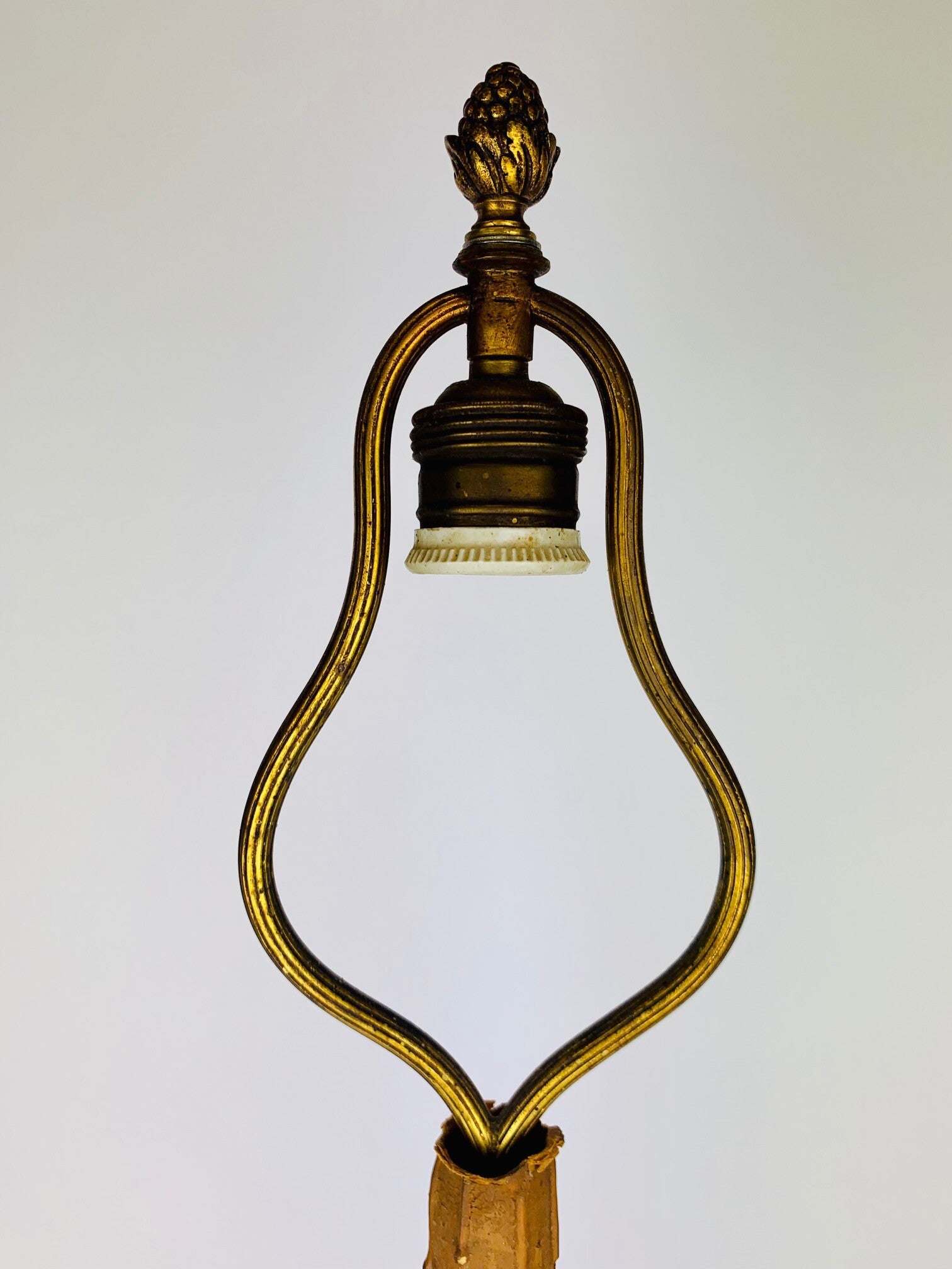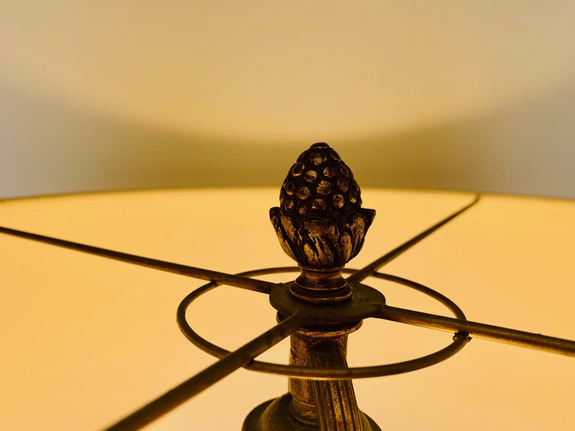 The lampshade is screwed on with a cap in the shape of a pine cone. High-quality finish, has a very classy full presentation.