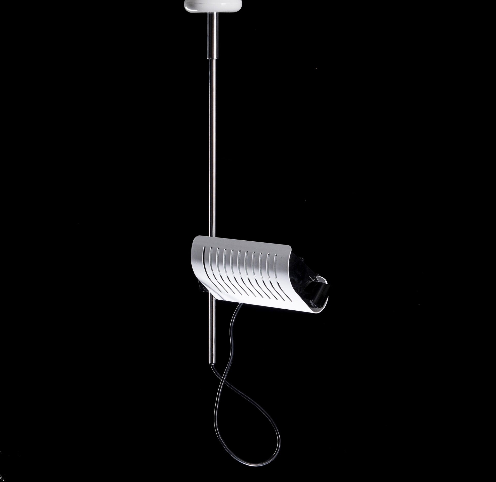 Ceiling lamp giving direct and indirect light, chromium-plated stem, lacquered ceiling fixing. Adjustable reflector in lacquered aluminium.