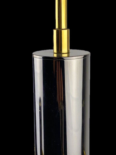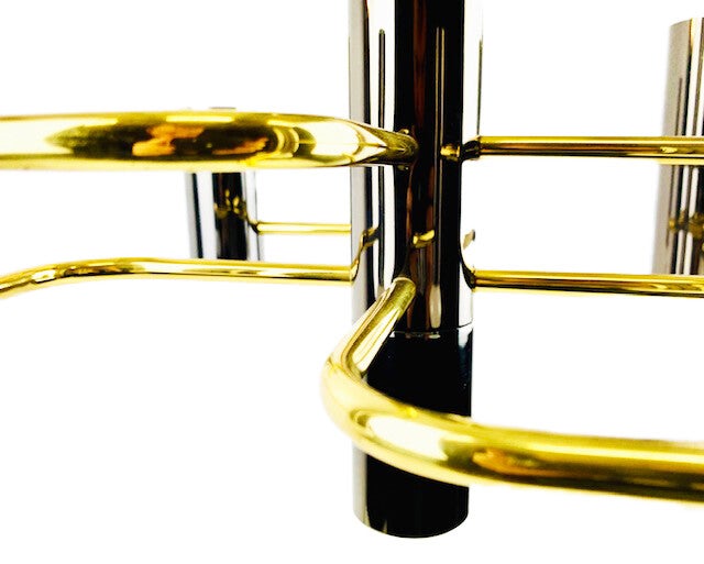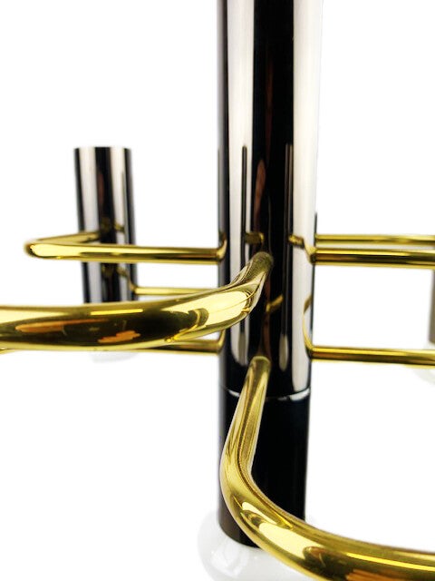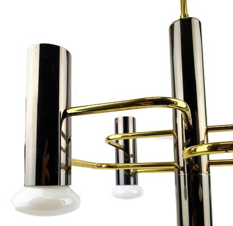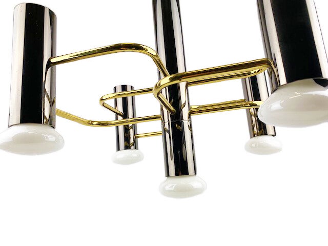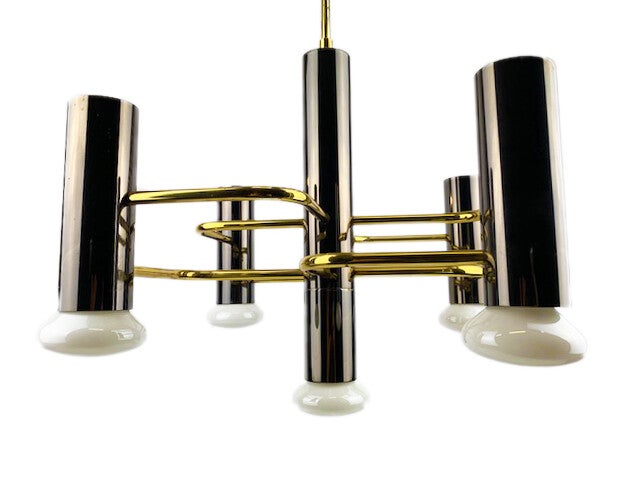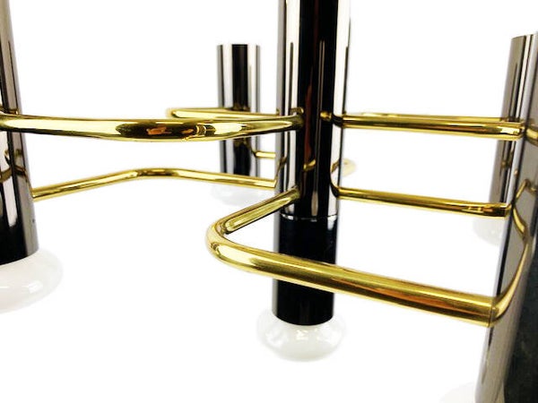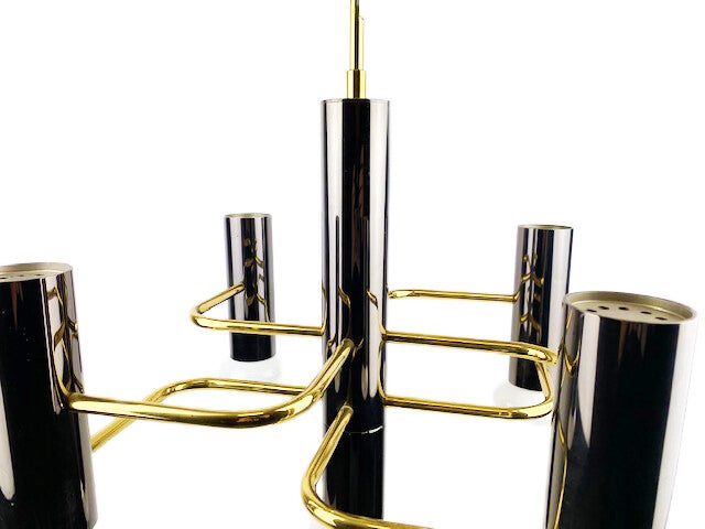 Mid-Century Modernist chandelier by Gaetano a design for Boulanger from the 1970s. featuring 5 lights surrounding a center support light all in a chic gunmetal finish with interconnecting brass supports that form a geometrical pattern.