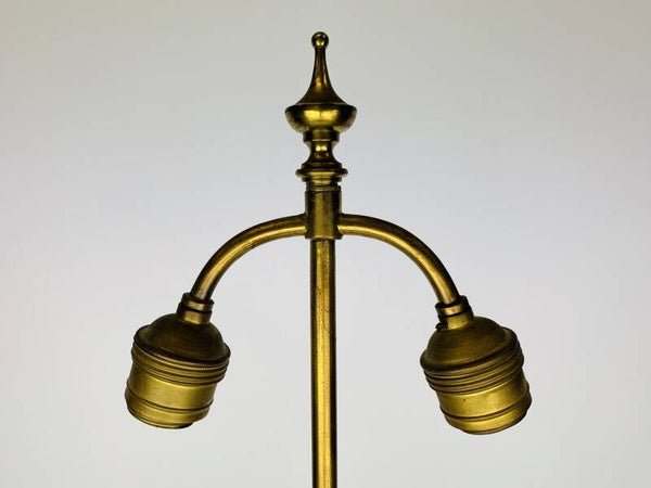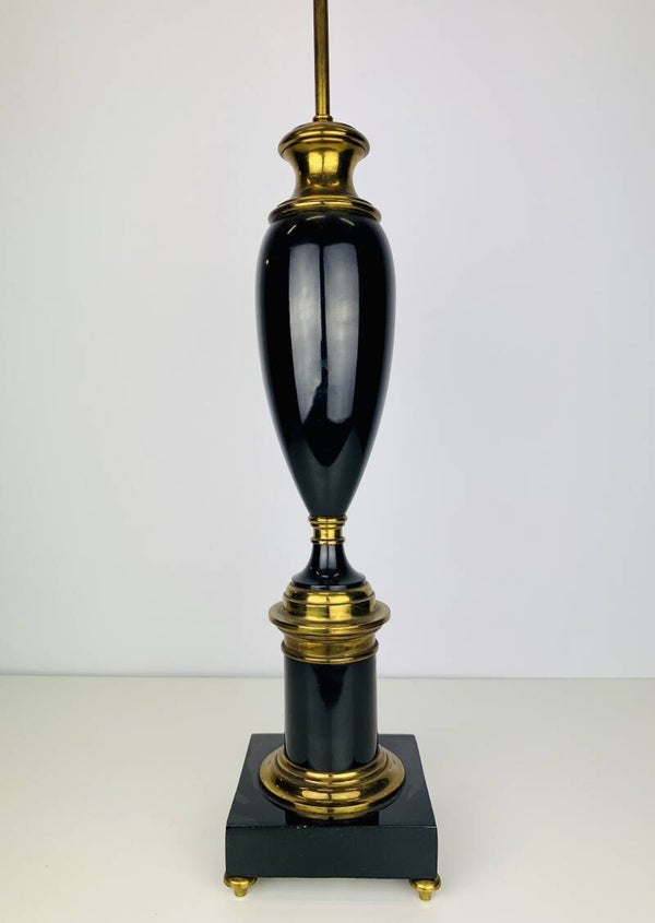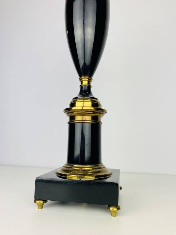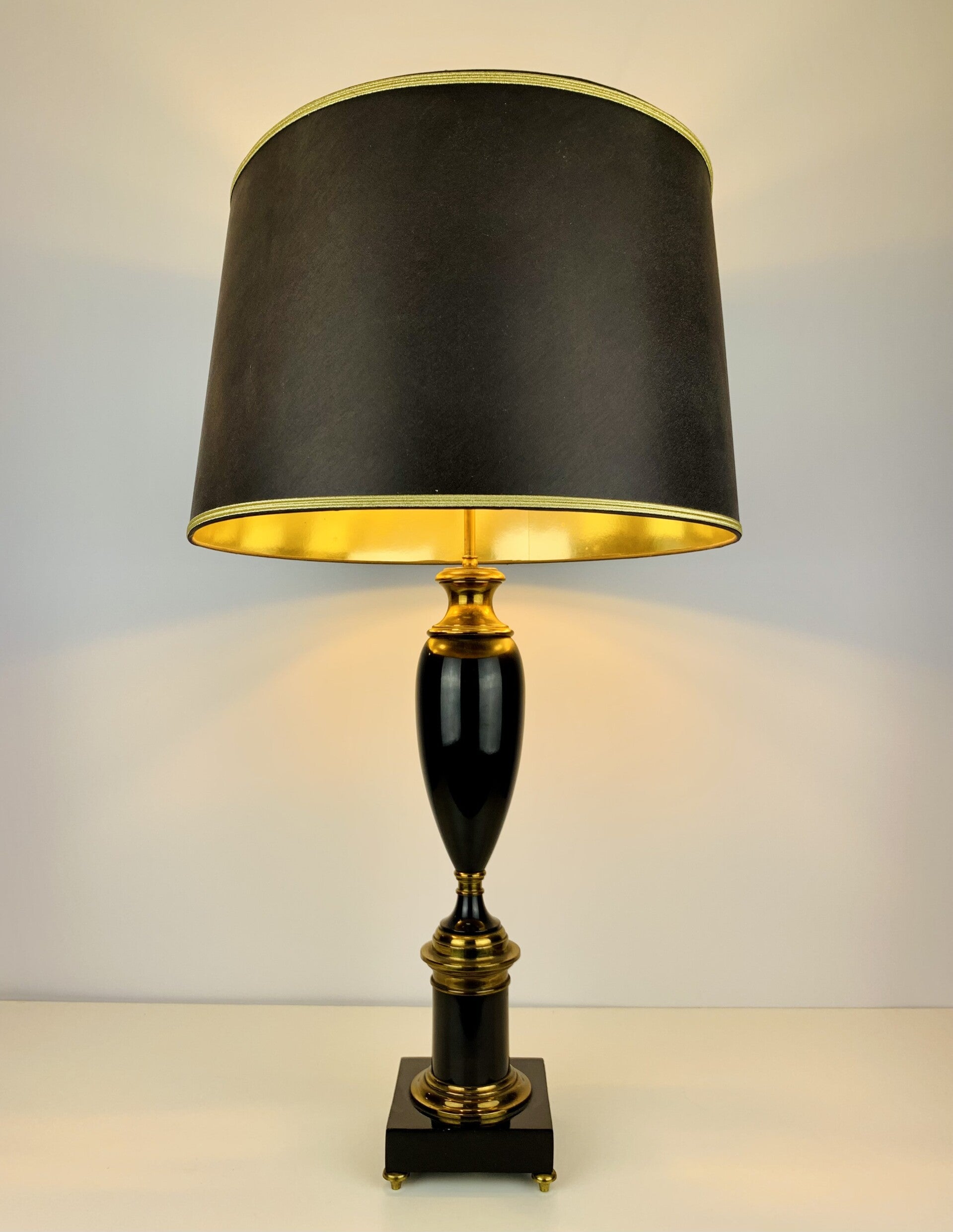 A very large elegant black French table lamp made of steel and brass, with black lacquer.