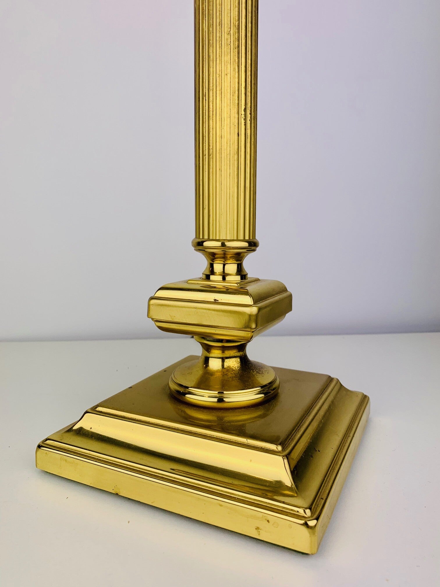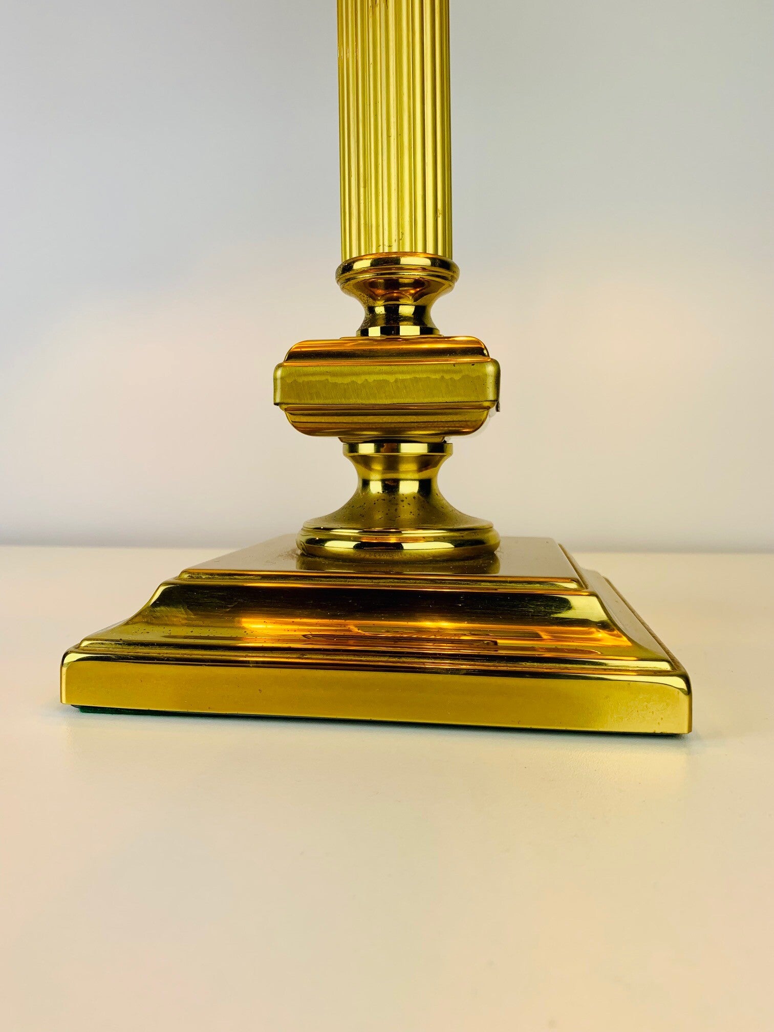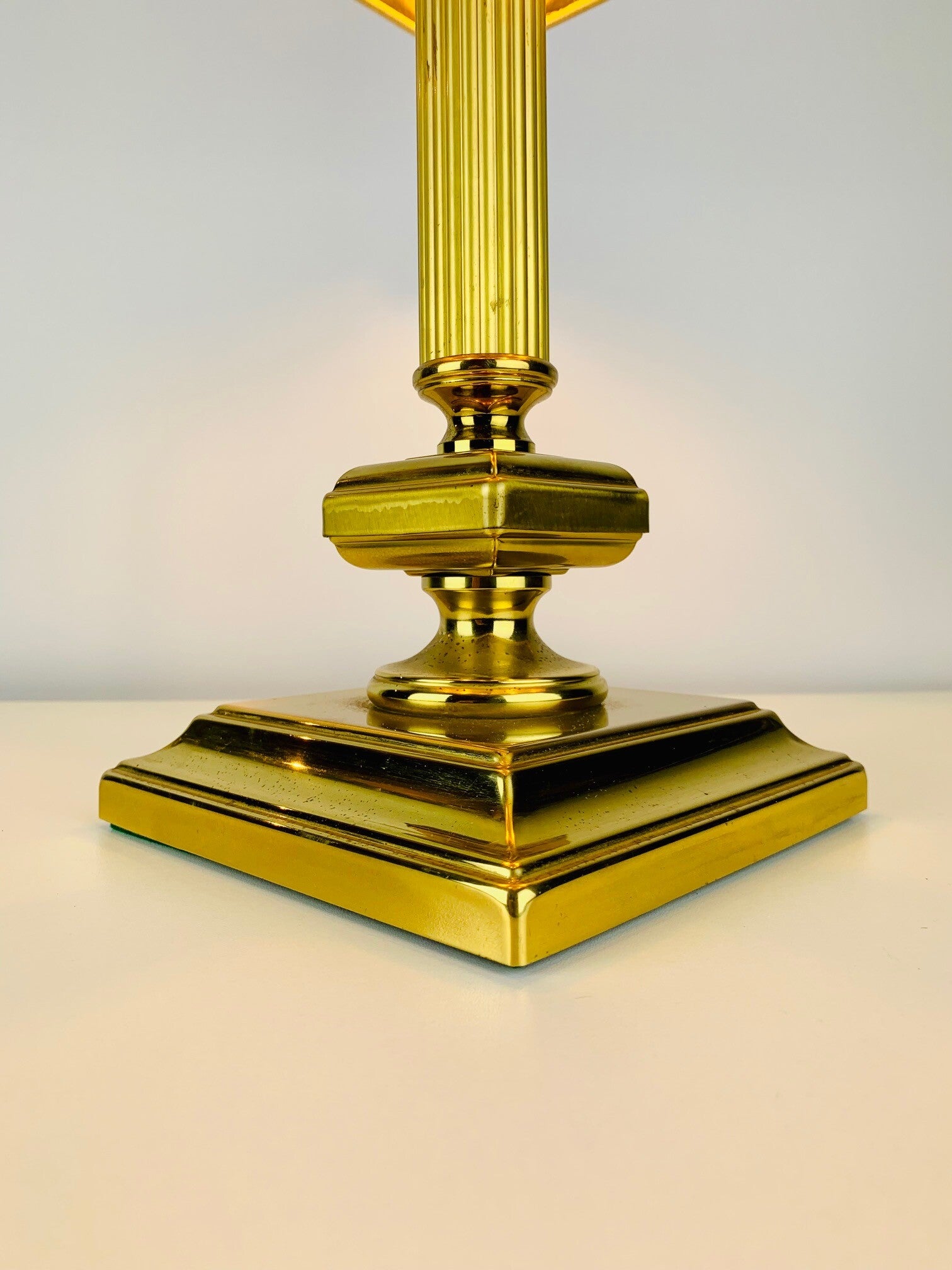 Special version with a very wide foot and quadrangular brass intermediate base. Very stylish design with fine details down to the fitting. All parts are made of brass.