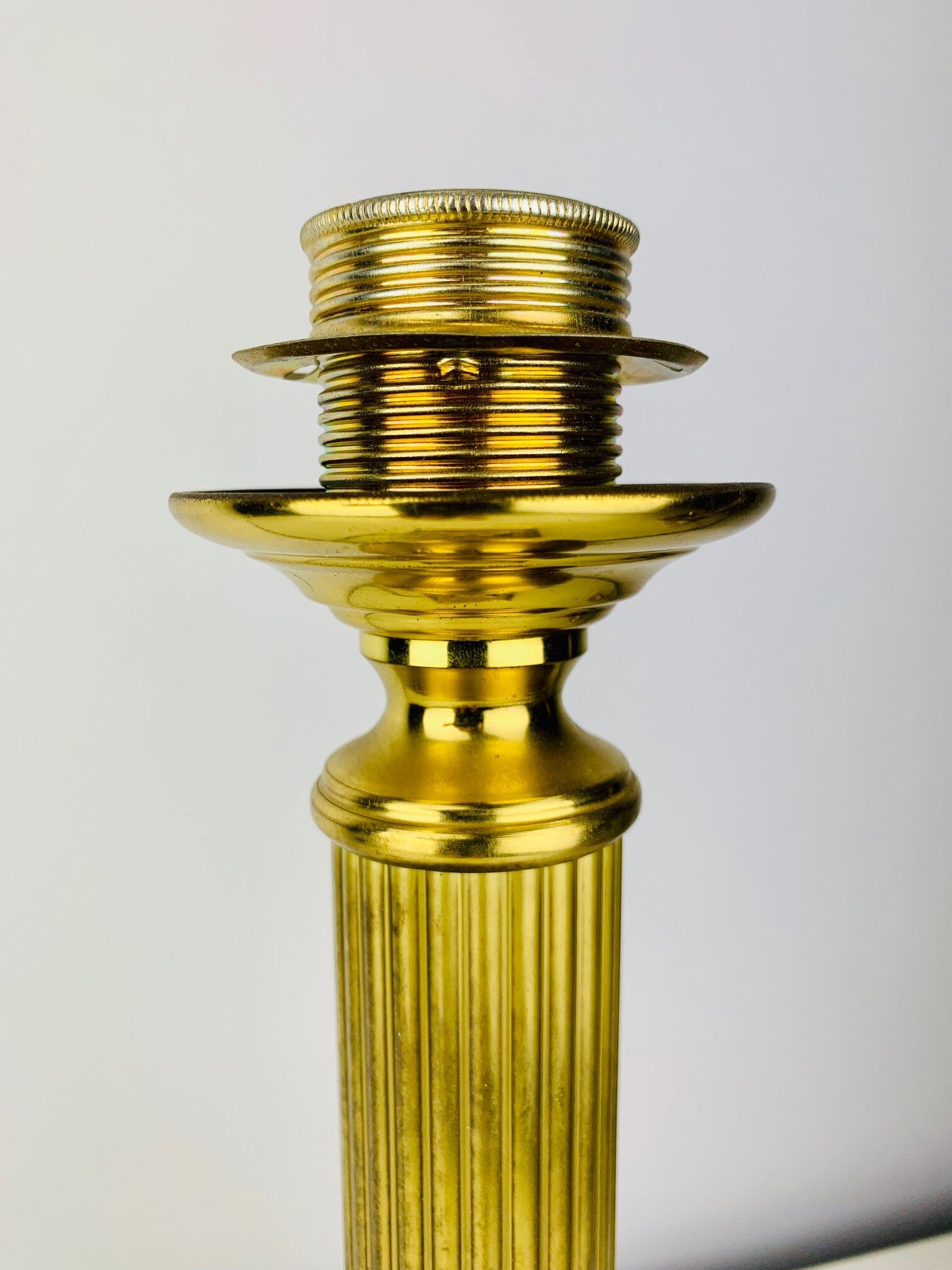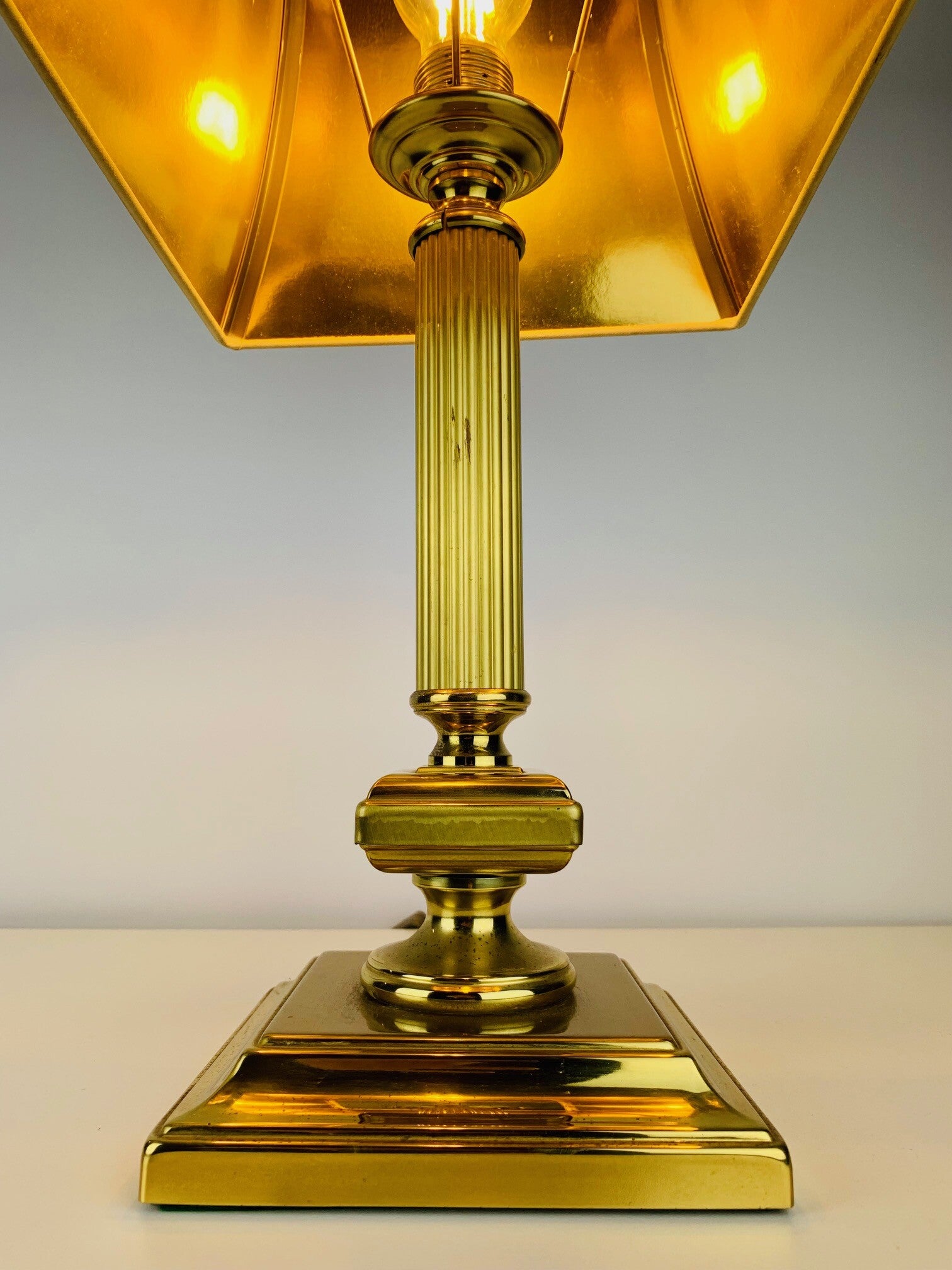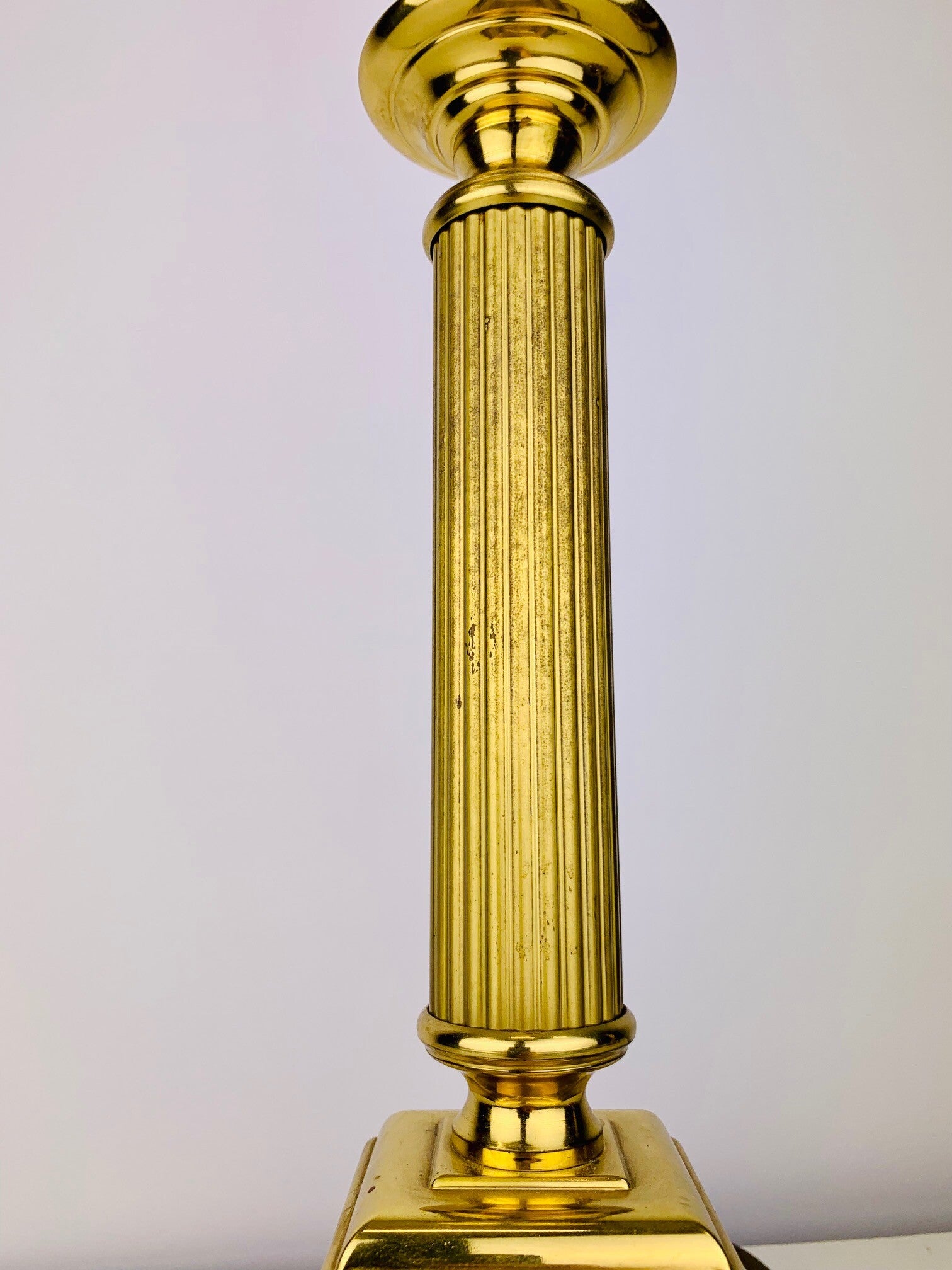 Special version with a very wide foot and quadrangular brass intermediate base. Very stylish design with fine details down to the fitting. All parts are made of brass.