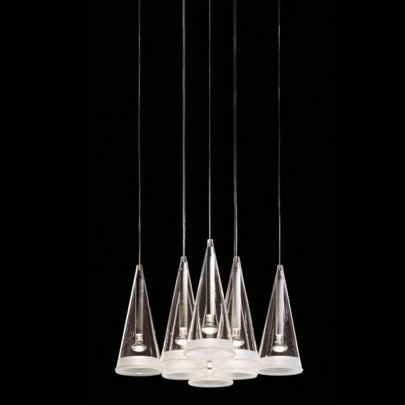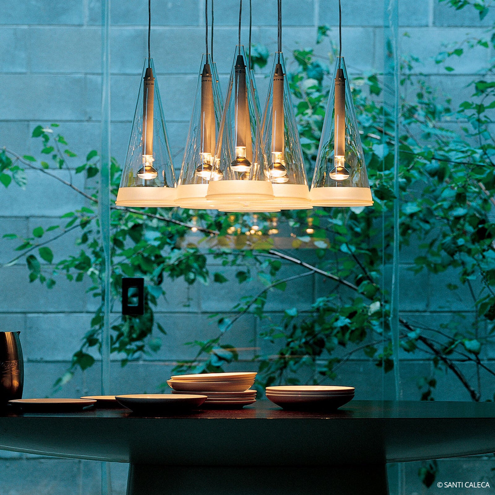 The Flos Fucsia is a blown glass atmospheric pendant lamp, designed for light that shines downwards. Due to the satin-finished edge of the glass cone and the silicone (bump) ring, the light also shines softly in the lamp itself.