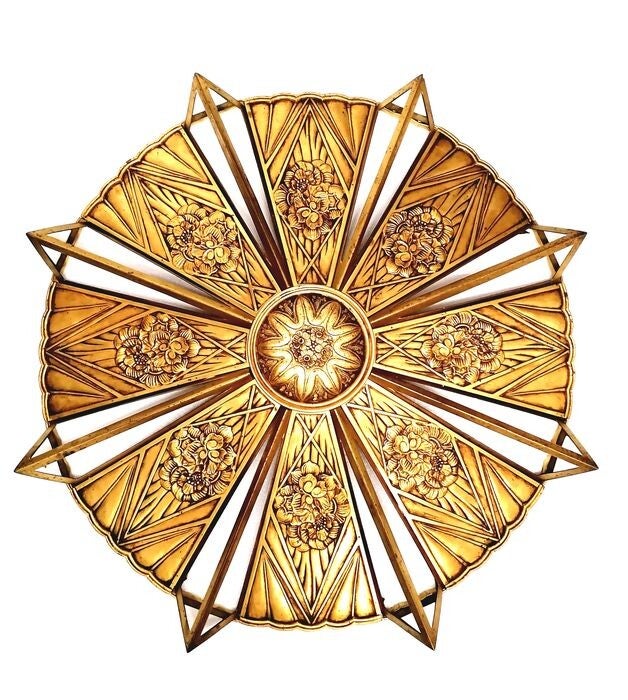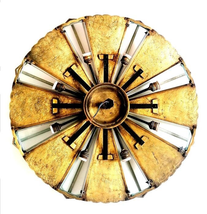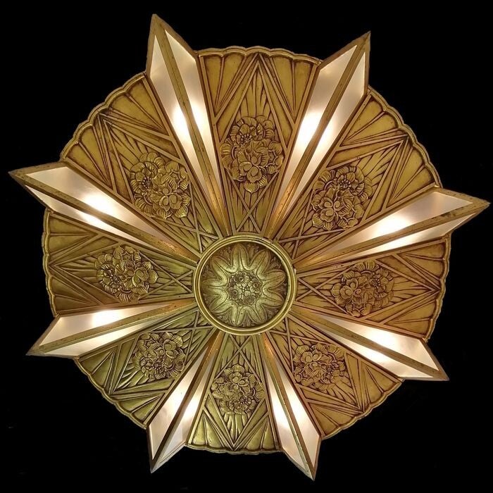 Very early Art Deco model where the influences from the Art Nouveau period are still visible. The sharp edges and the very large star-shaped bowl (Circumference of 234 cm) give the chandelier a very unique look.