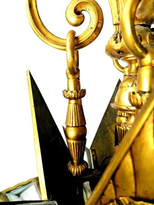 The chandelier is completely made of bronze and weighs 28 kg, the smaller details (nuts and screws) are made of brass. 32 frosted glass panels also belong to the lamp.